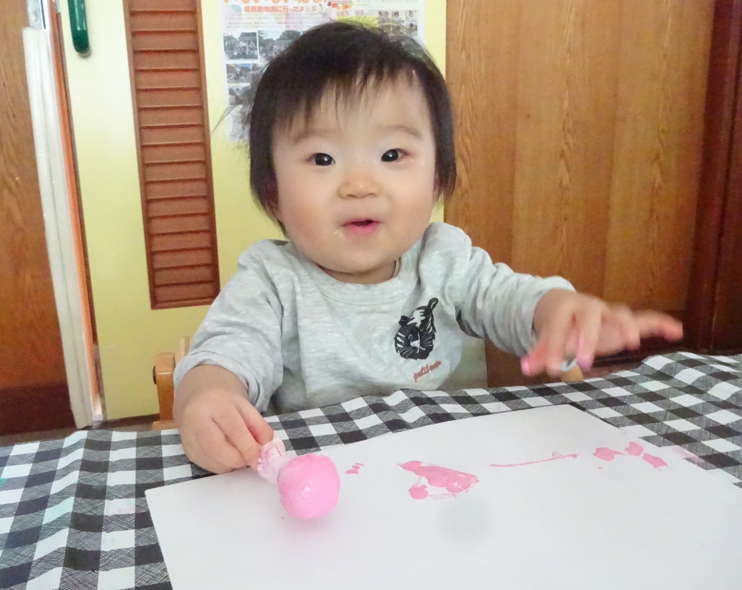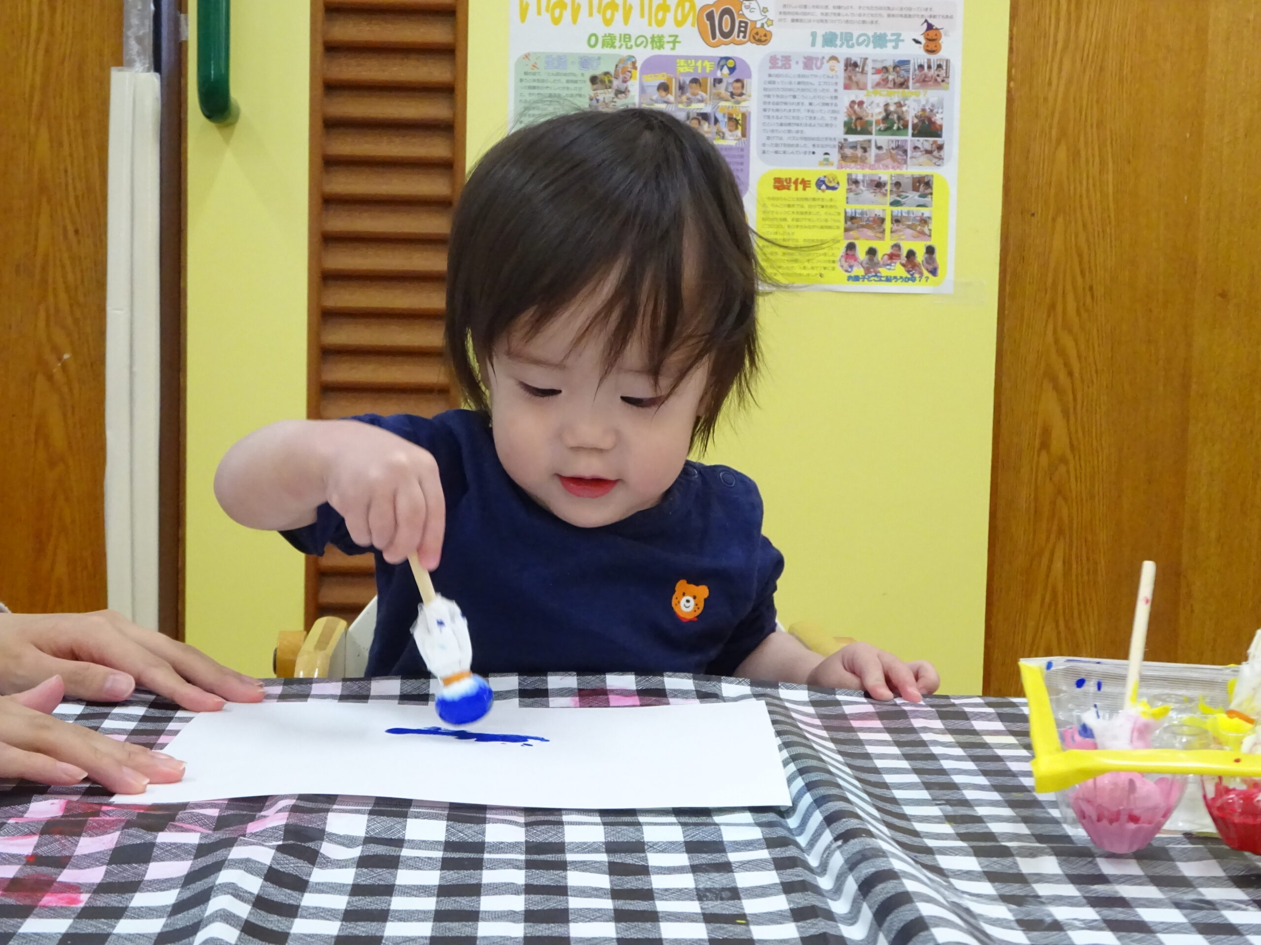 0歳児は、ミニタンポに絵の具をつけて製作をしました。使いたい色を指差しや「これ!」といいながら、画用紙いっぱいに描いていましたよ。