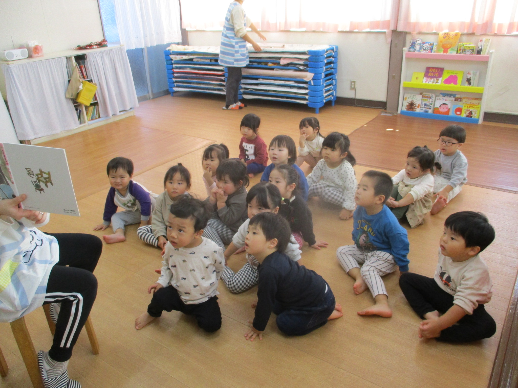 少しずつ長めの絵本でも集中して見ようとする子が増えてきた赤組さん。