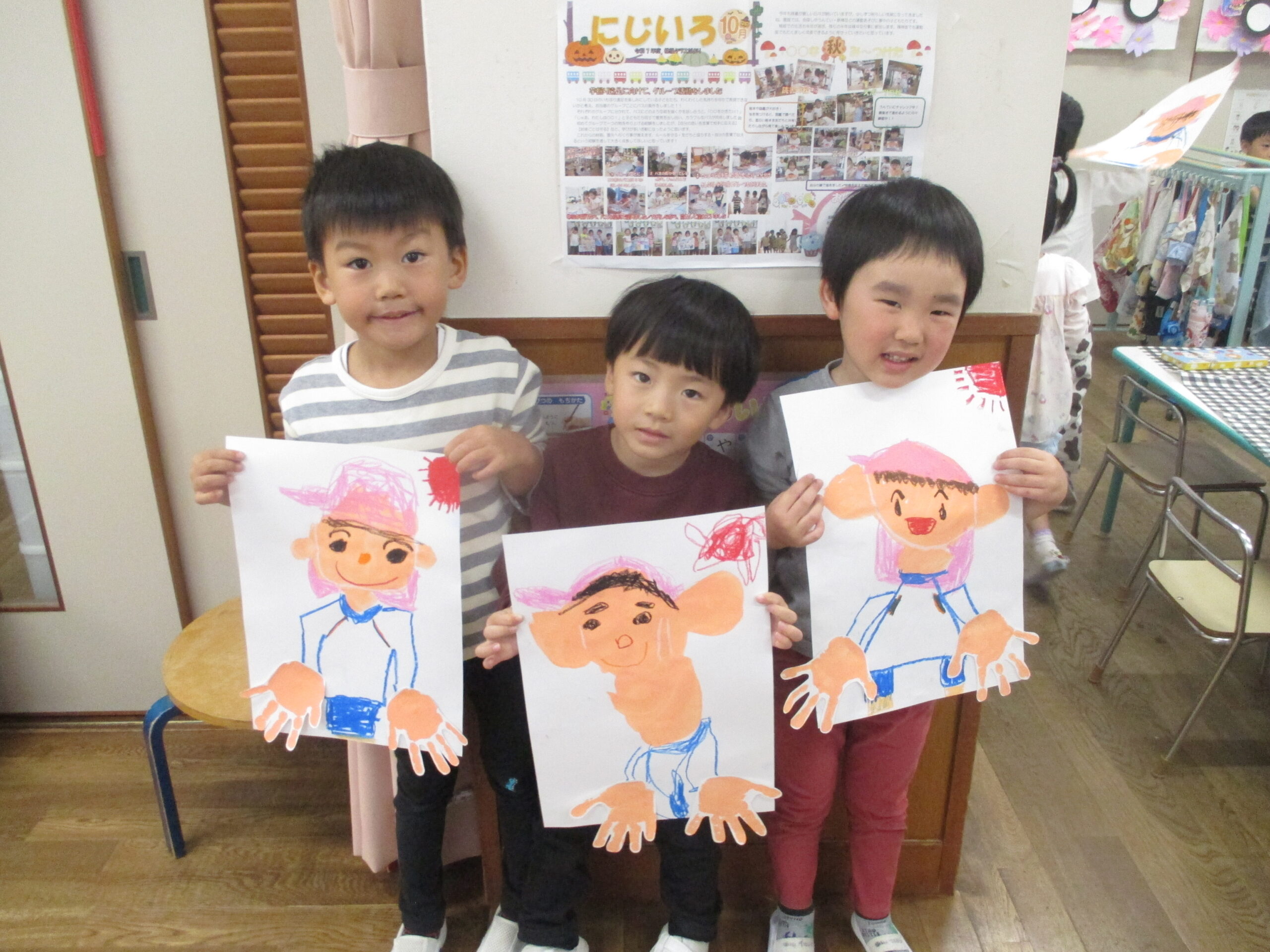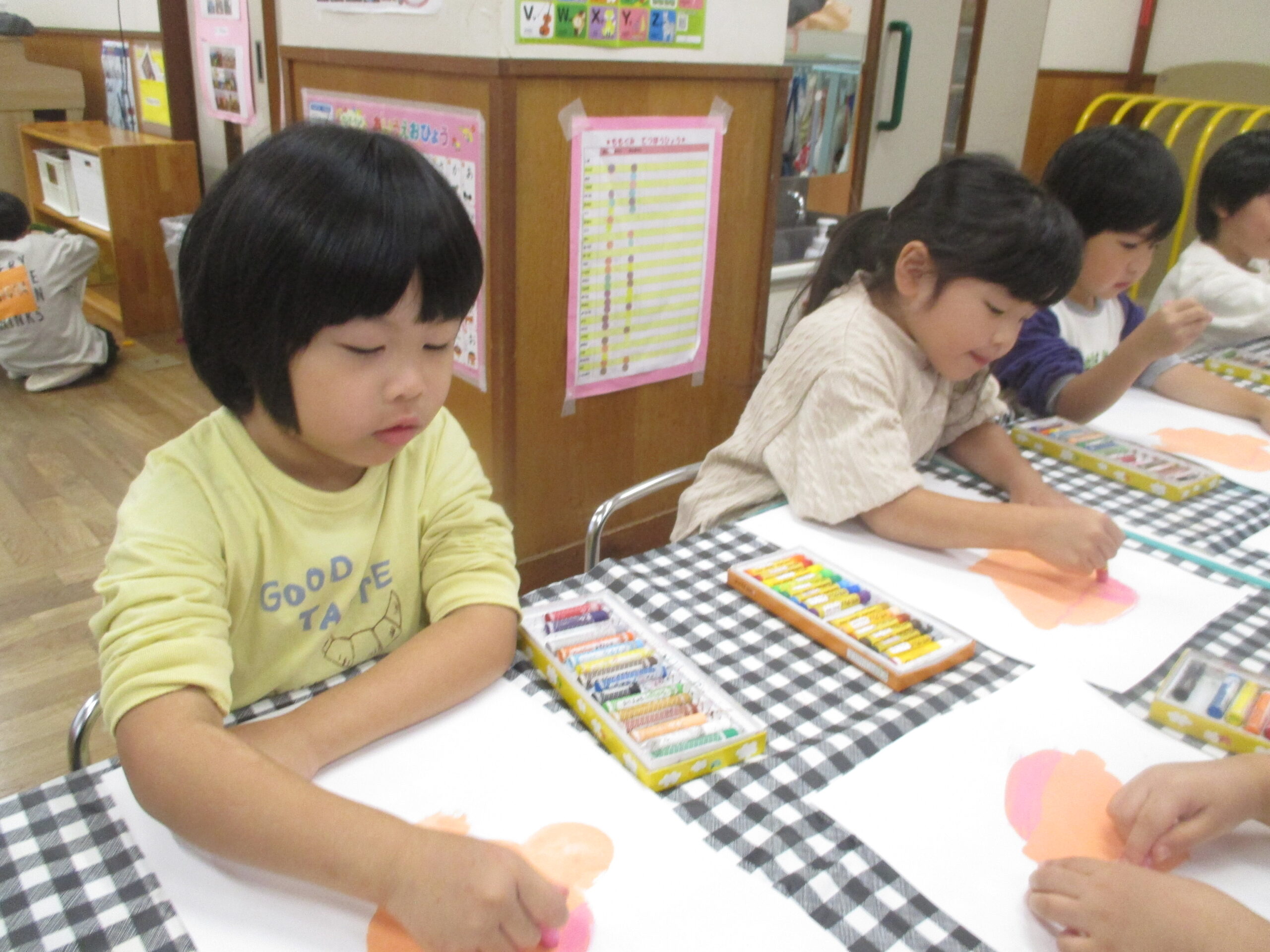 いもほり遠足の製作をしました。自分が頑張って掘っているところや、「どんな形のさつまいもが掘れたかな?」と考えながら描いていました。迫力のある立派な作品が完成しました★