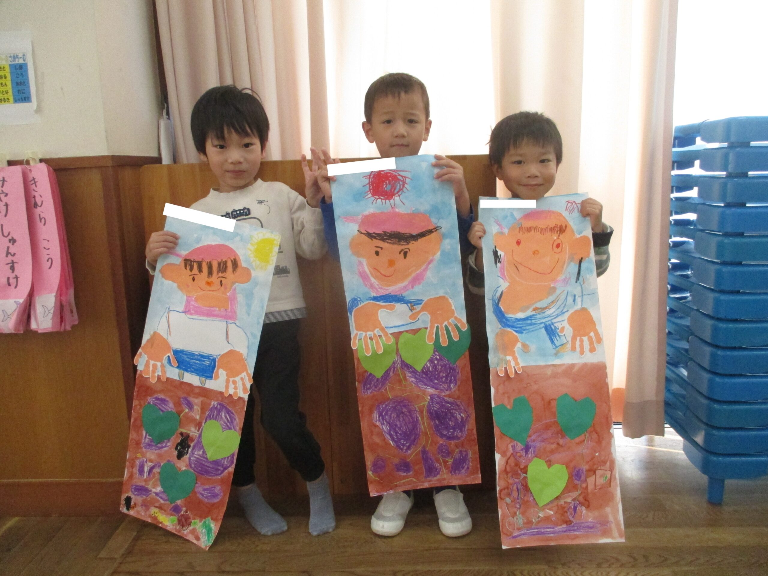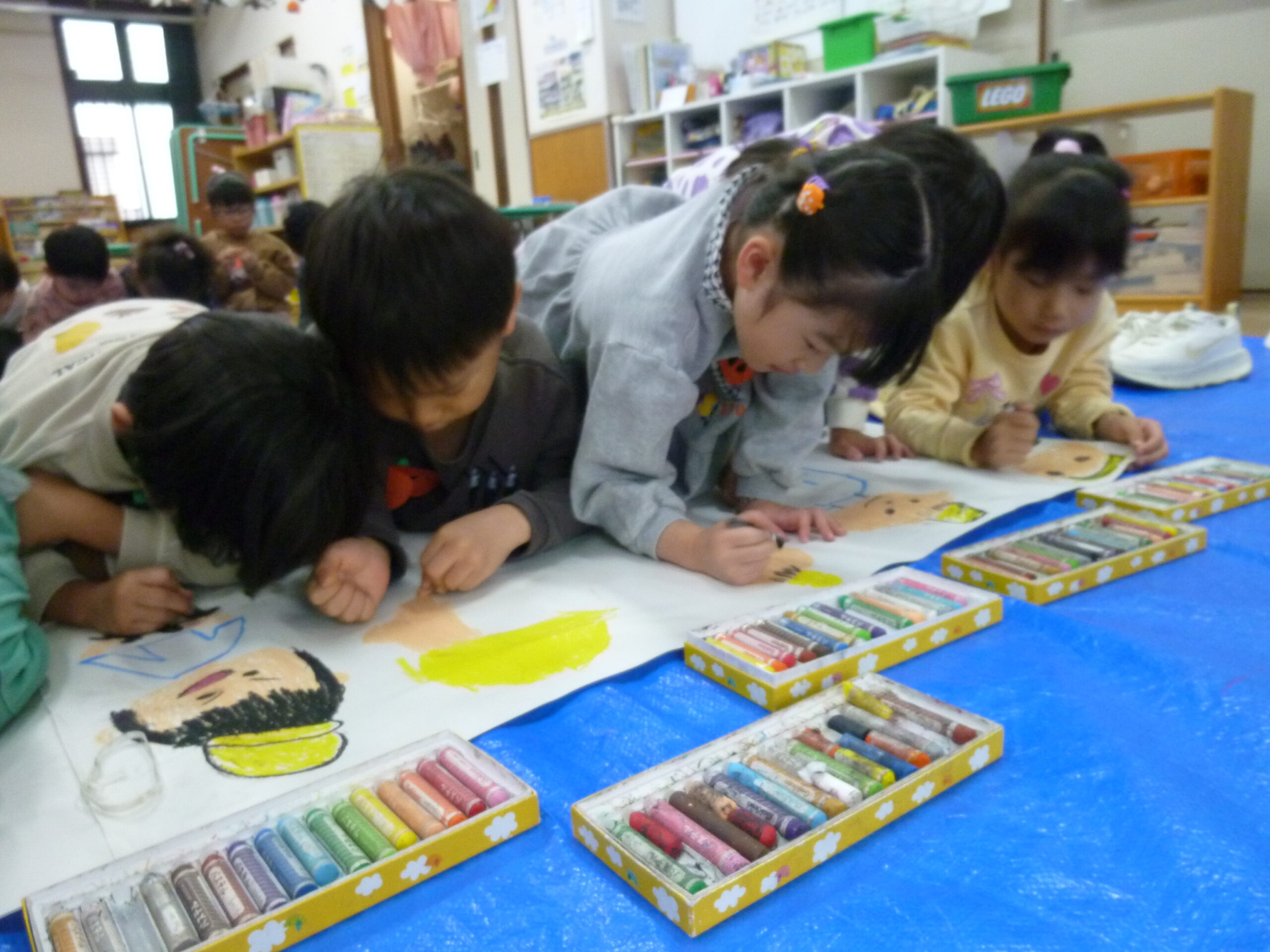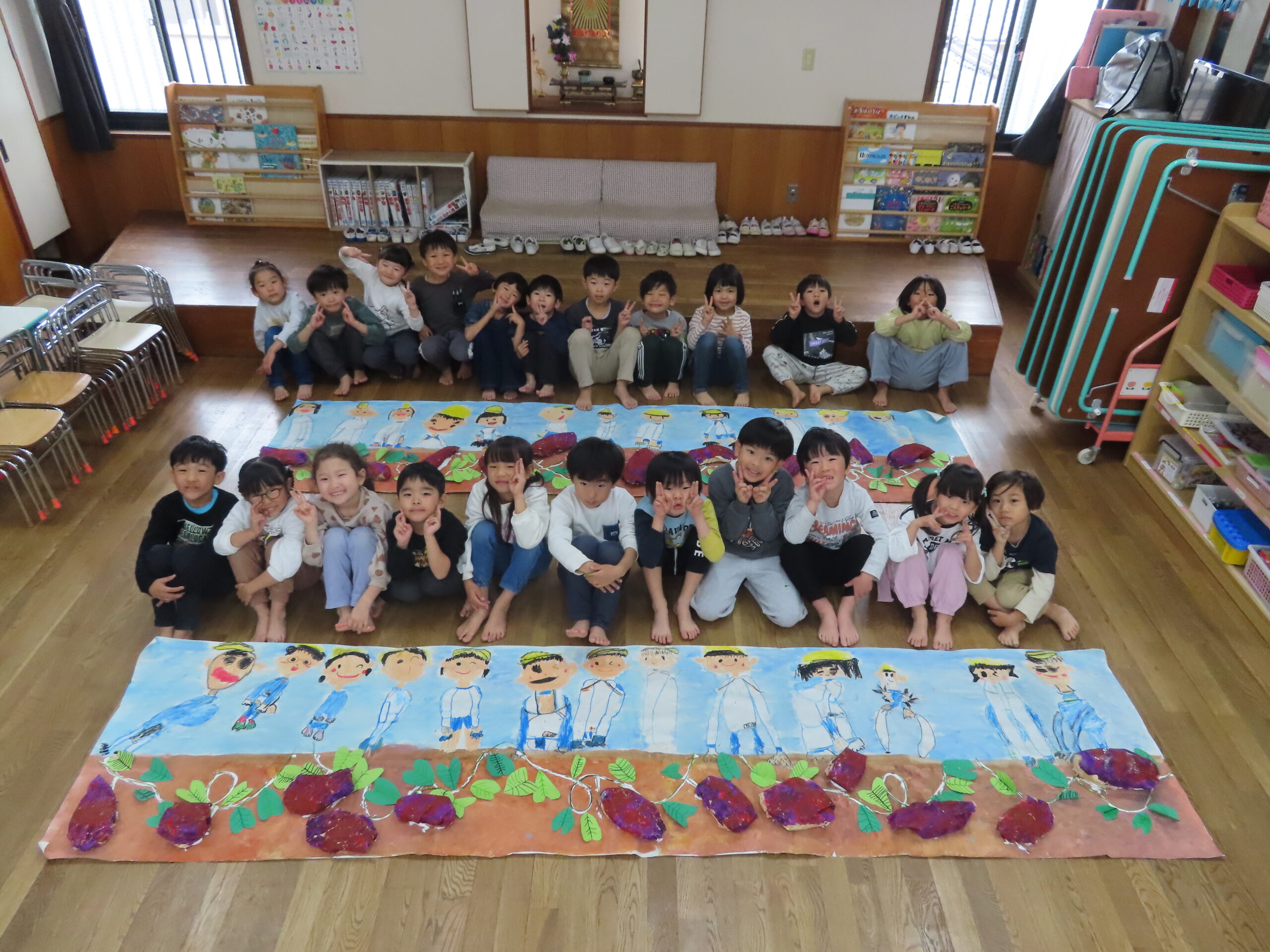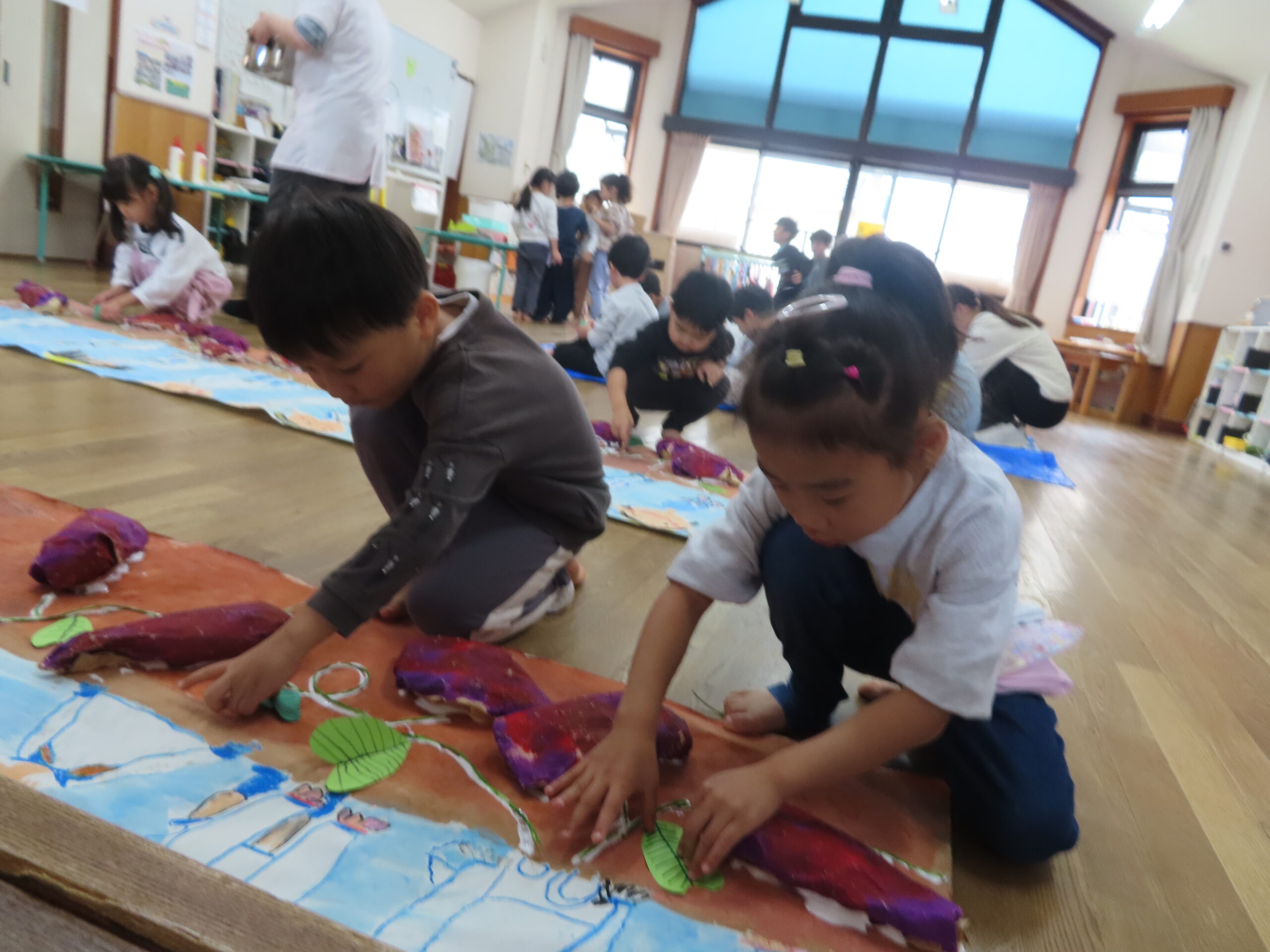 先月行ったいもほり遠足をテーマに共同製作を行ないました。模造紙に芋掘りをしている自分を大きく描いたり、「こんな形やったなー!」と友達と会話しながら新聞紙や封筒を丸め、いもの形を作ったりしました。つるや葉っぱも自分たちで作り、素敵な作品が完成しました☆彡