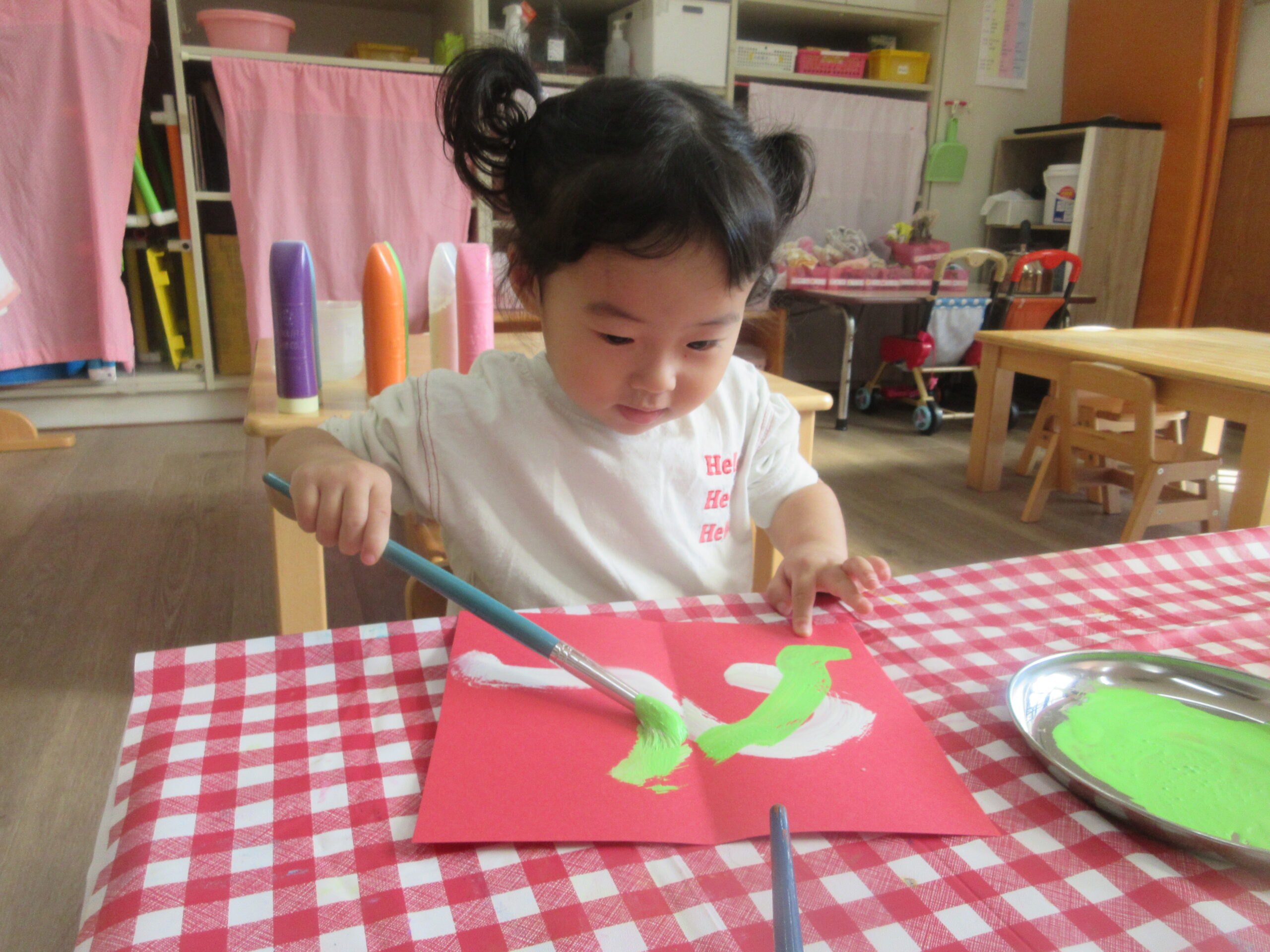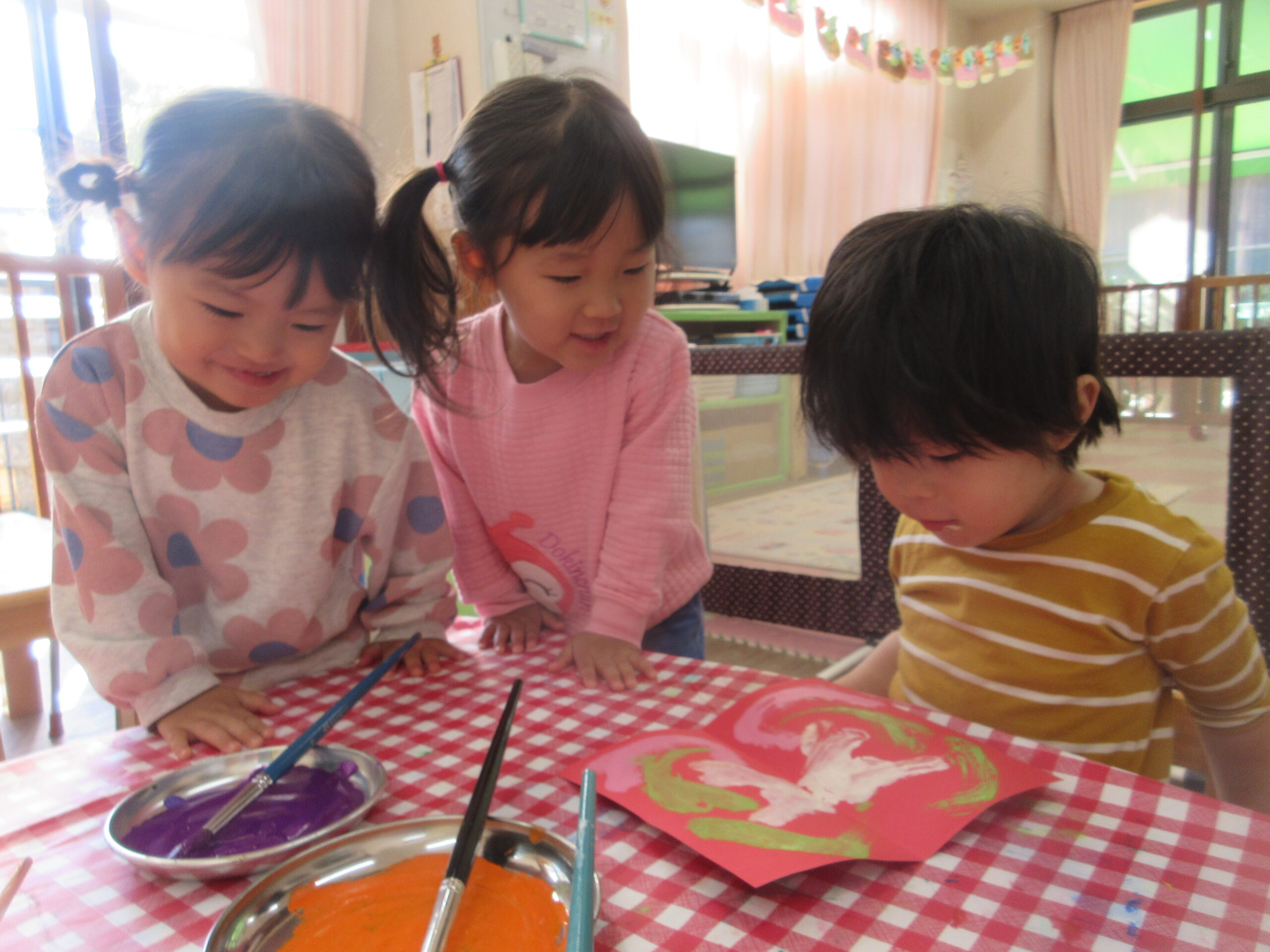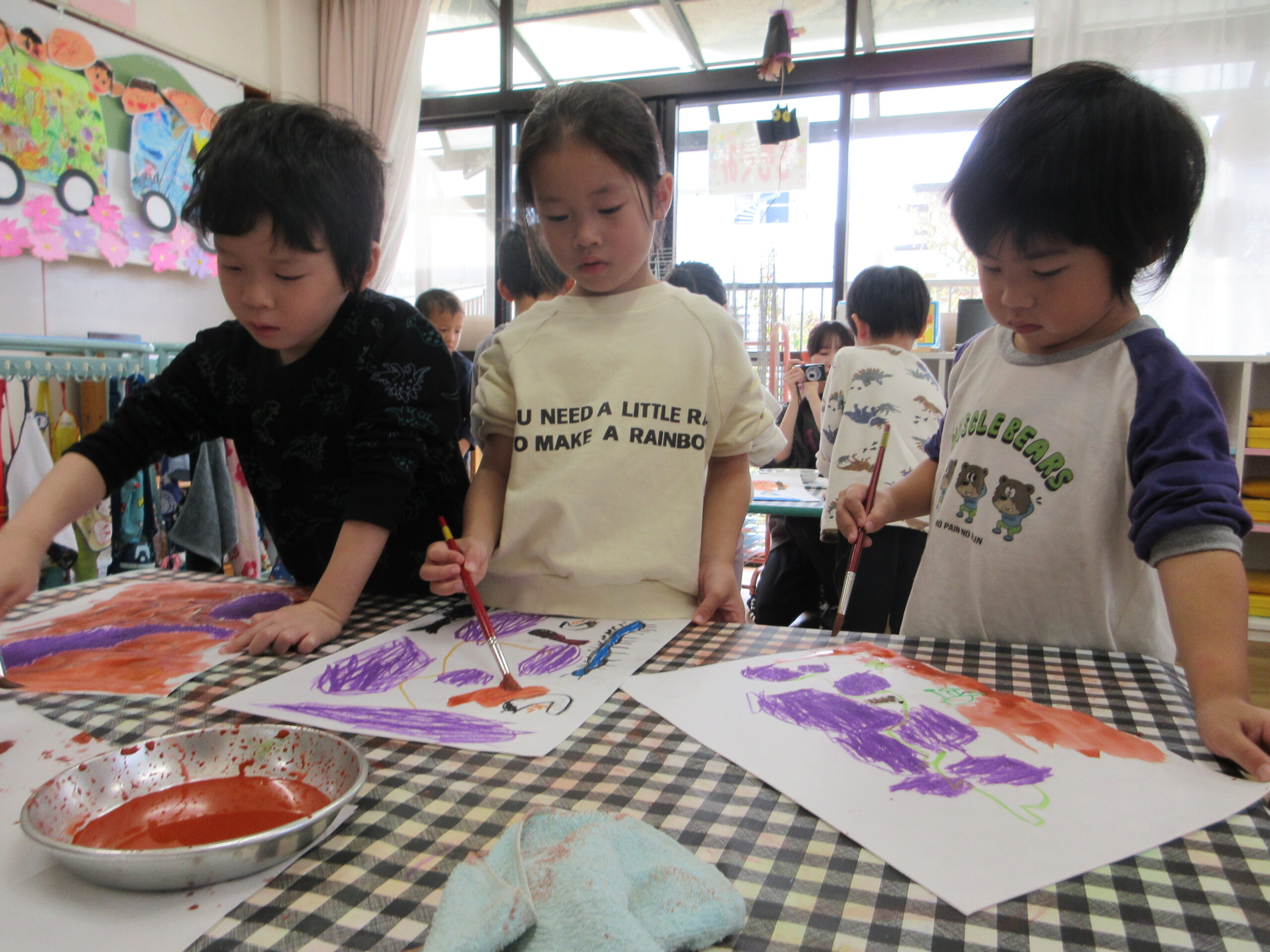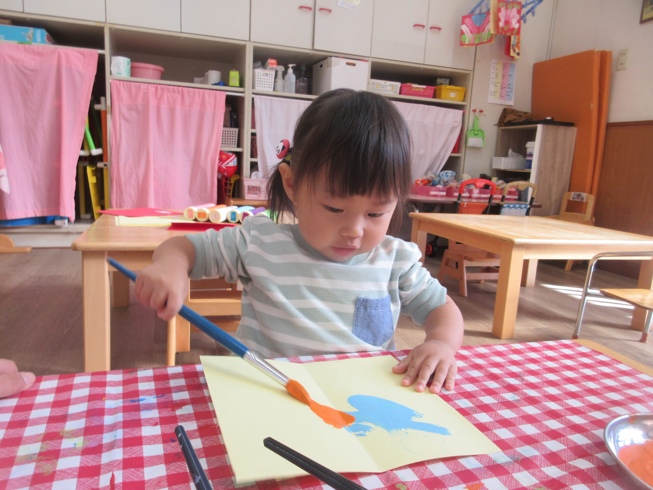 1歳児さんは、デカルコマニーの技法を使ってキノコの製作をしました。自分たちで筆を使って描きました。色の広がりを見ると「うわ~すごいね~!」と興味津々の子どもたちでした。