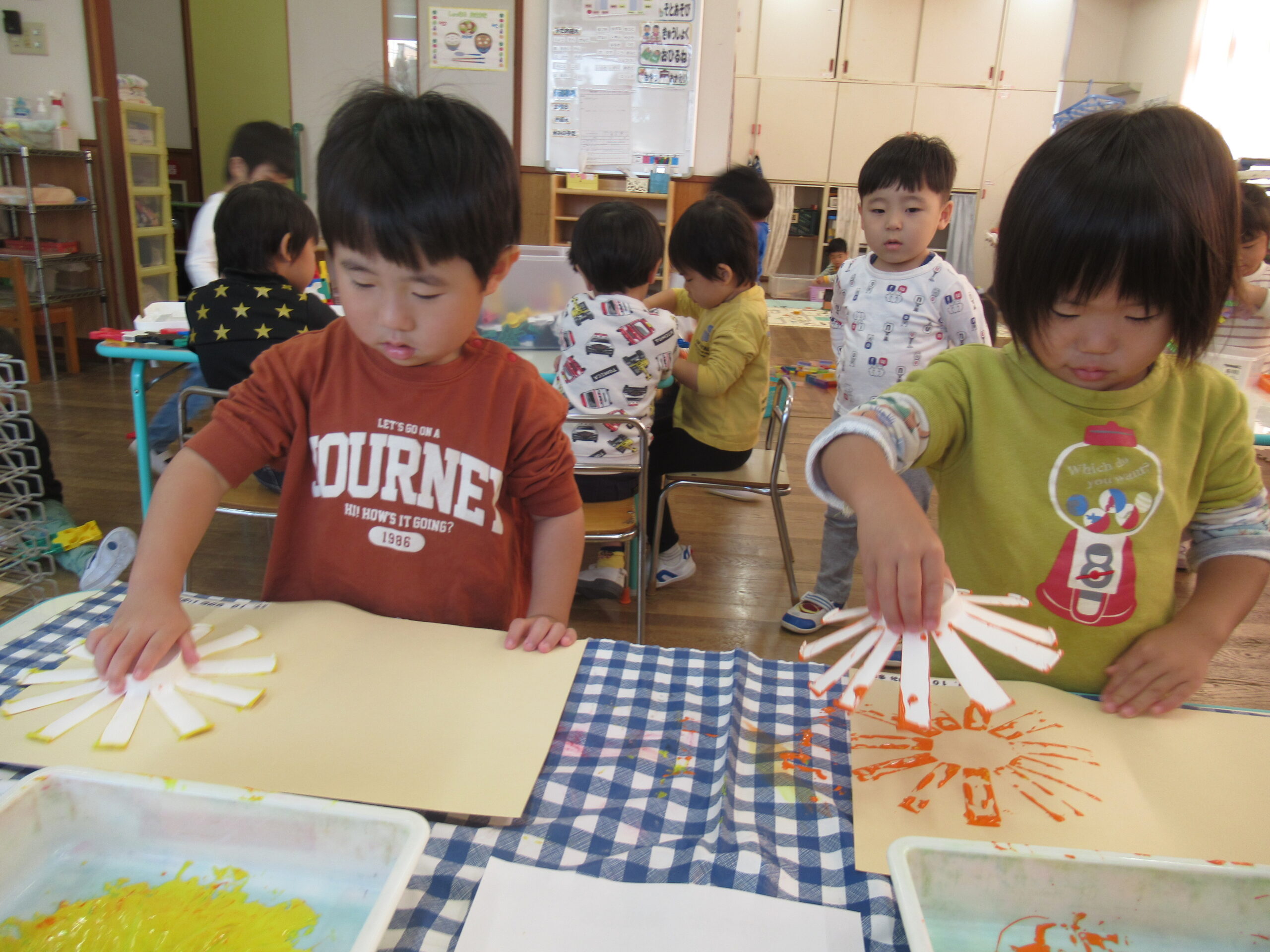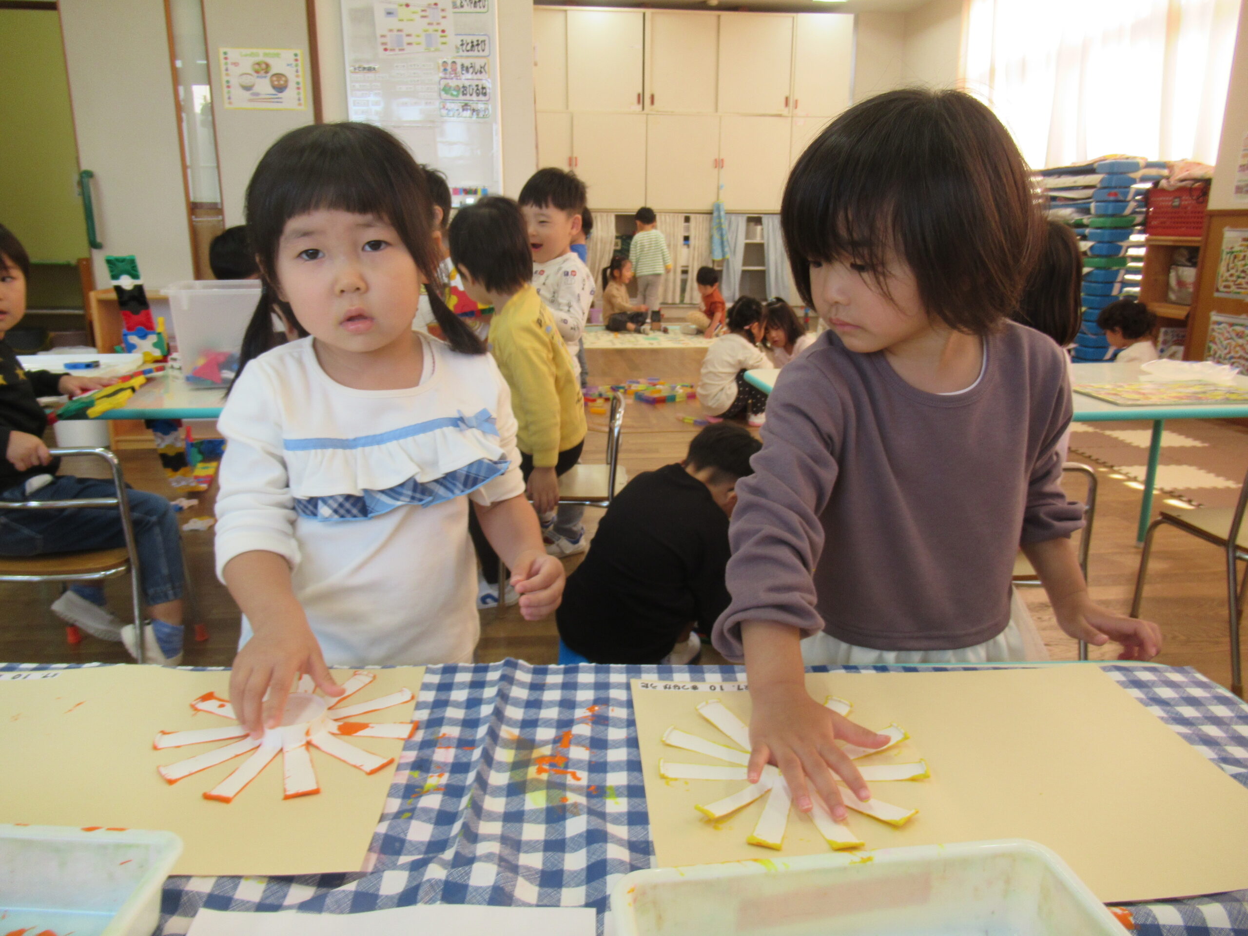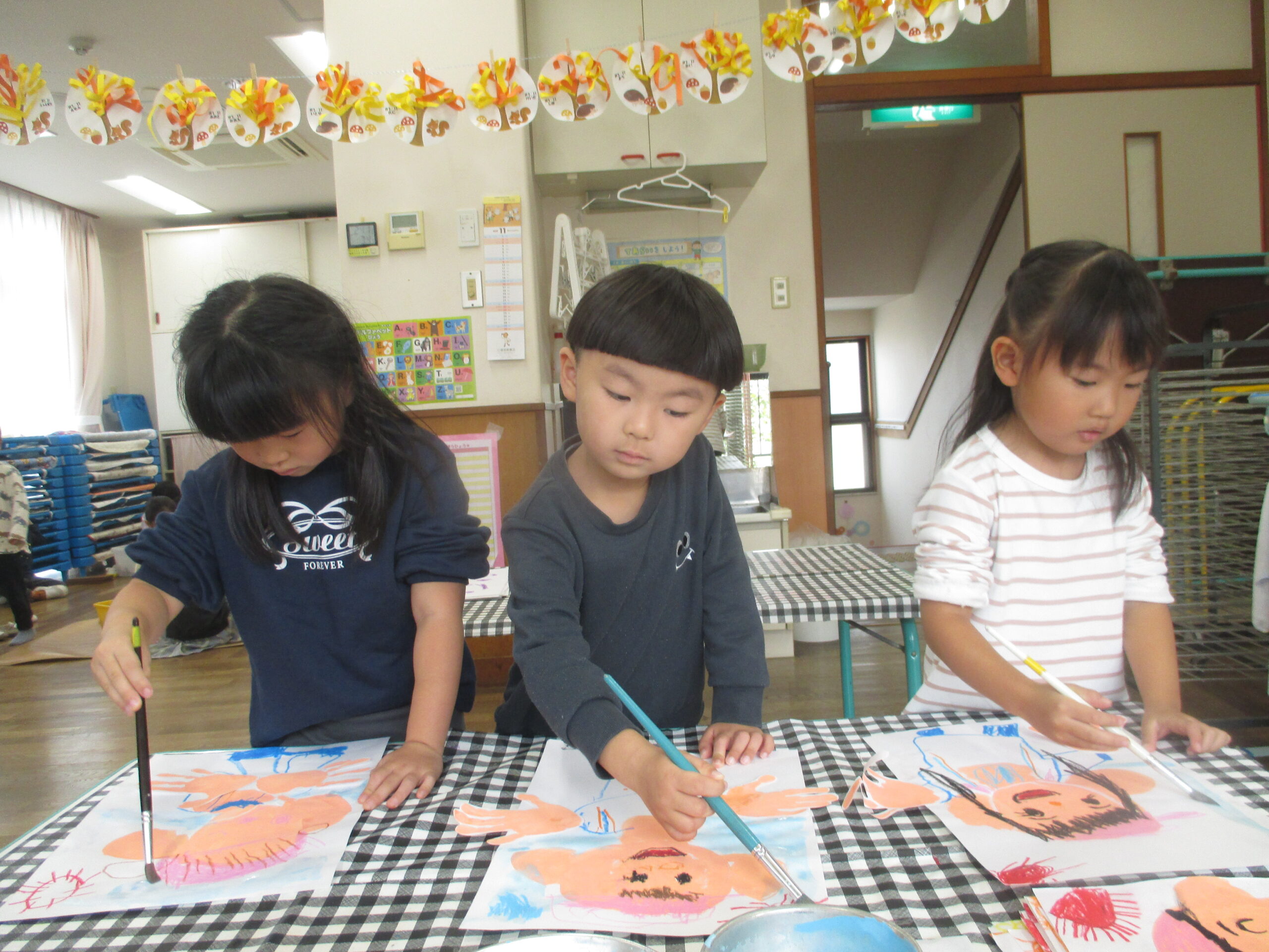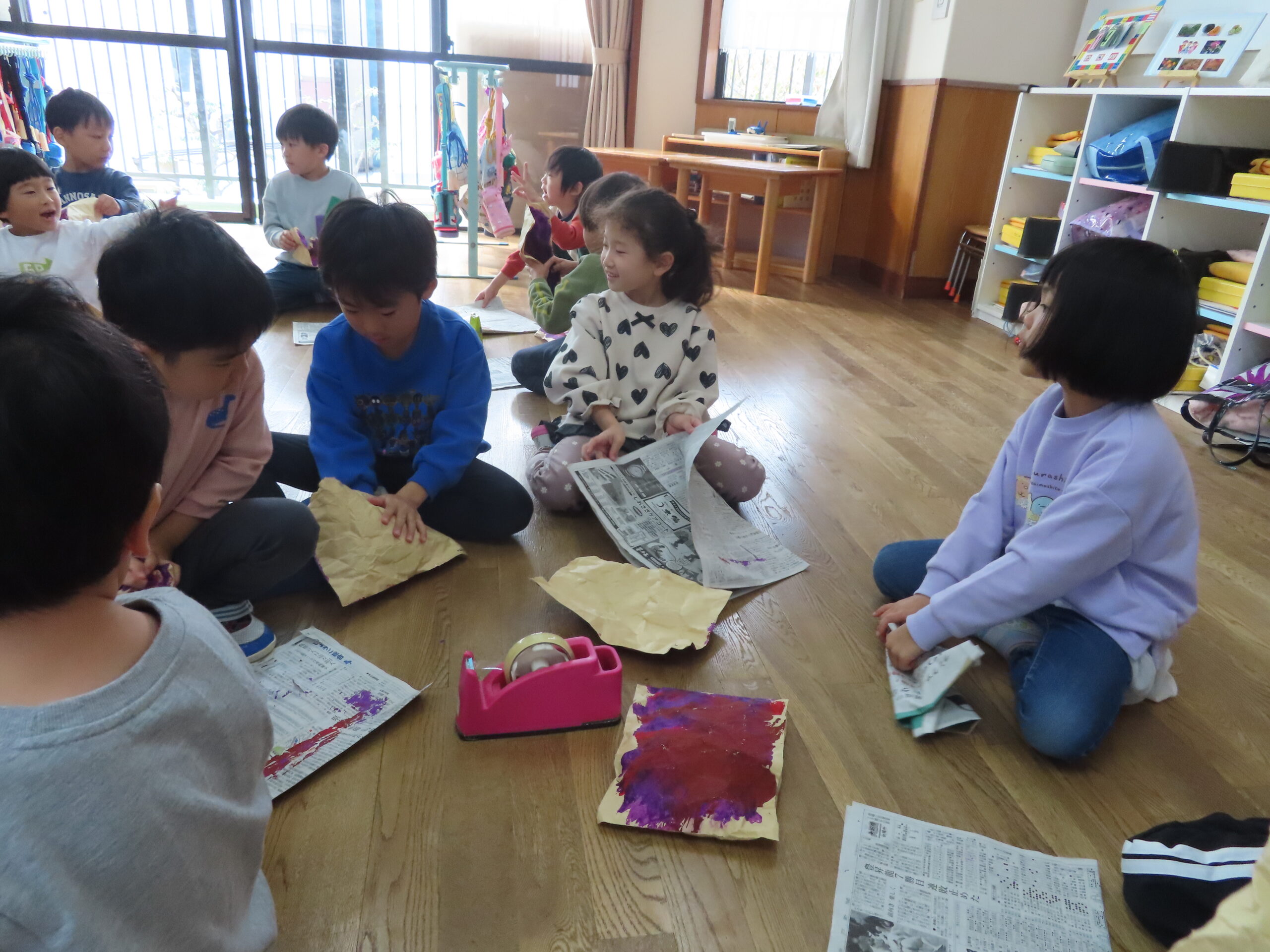 1歳児さんは、デカルコマニーの技法を使ってキノコの製作をしました。自分たちで筆を使って描きました。色の広がりを見ると「うわ~すごいね~!」と興味津々の子どもたちでした。
