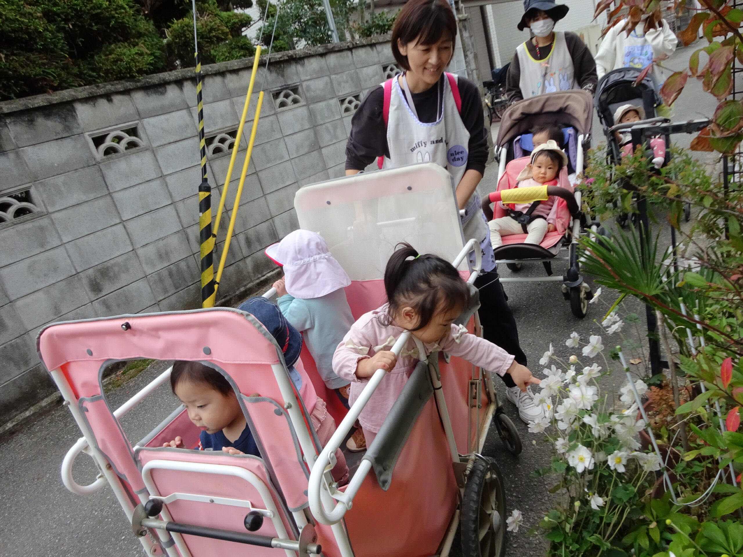 お散歩では、0歳児はカートやベビーカーに乗って園外へ出かけました。秋の風を感じながら、ススキや秋の草花を見て楽しんでいました。