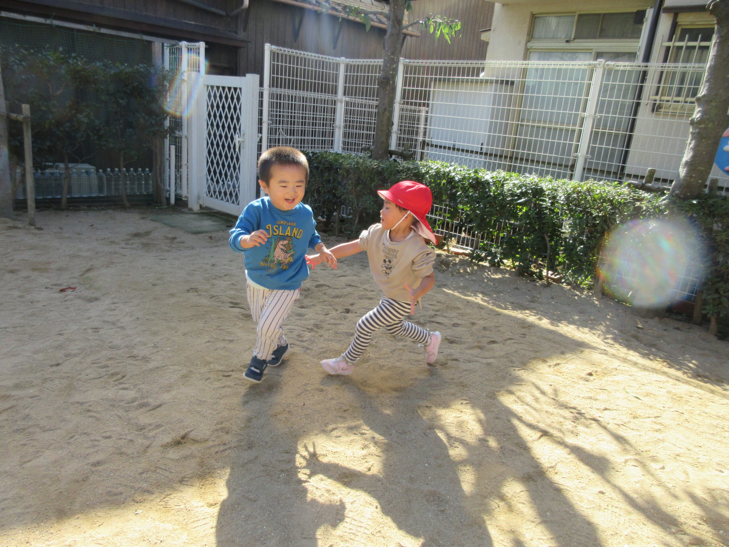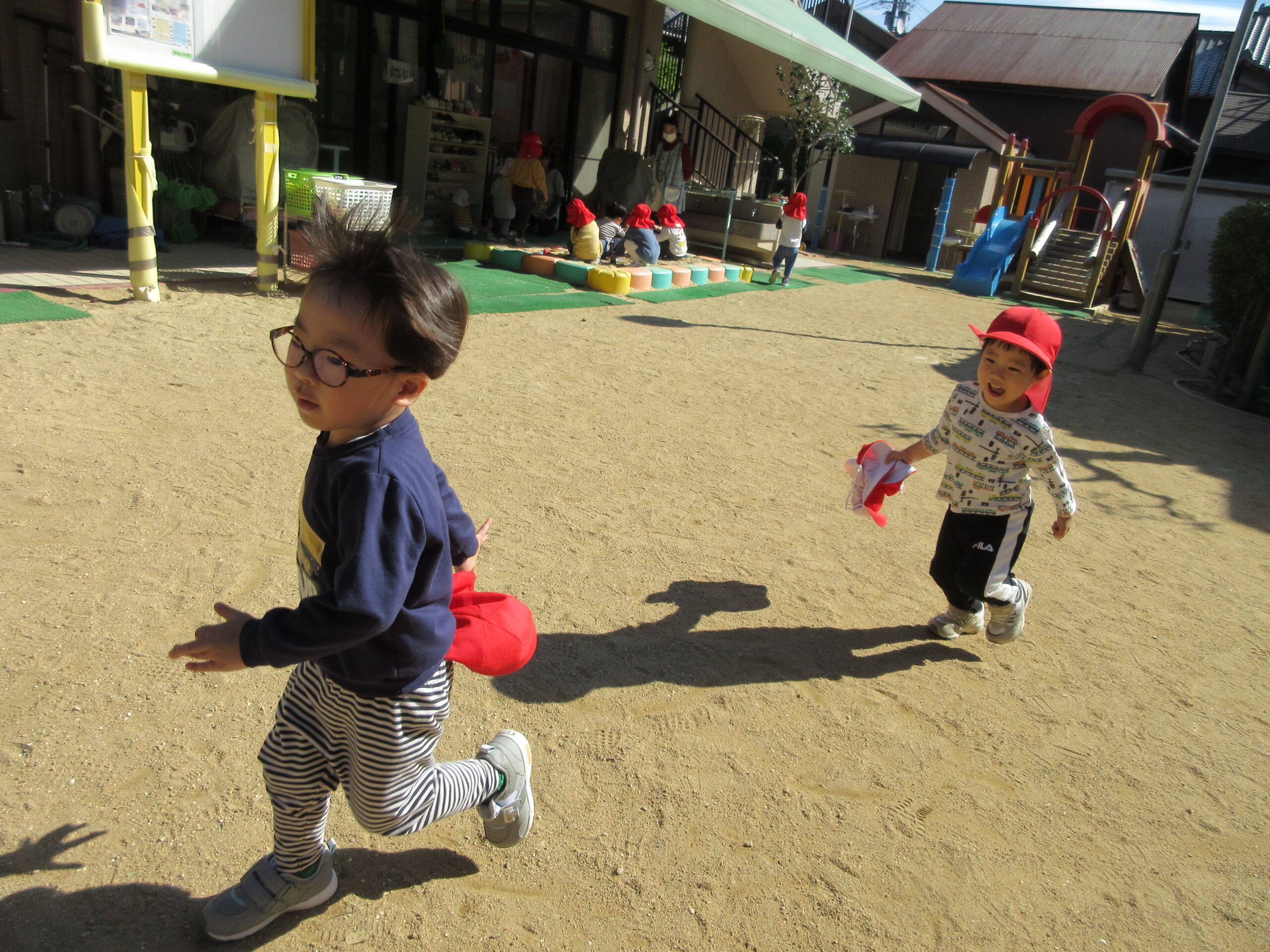 戸外ではしっぽとりが大人気で、「私鬼したい!」「じゃあ逃げる」と自分のやりたい気持ちを伝えながら楽しむ姿が見られます。