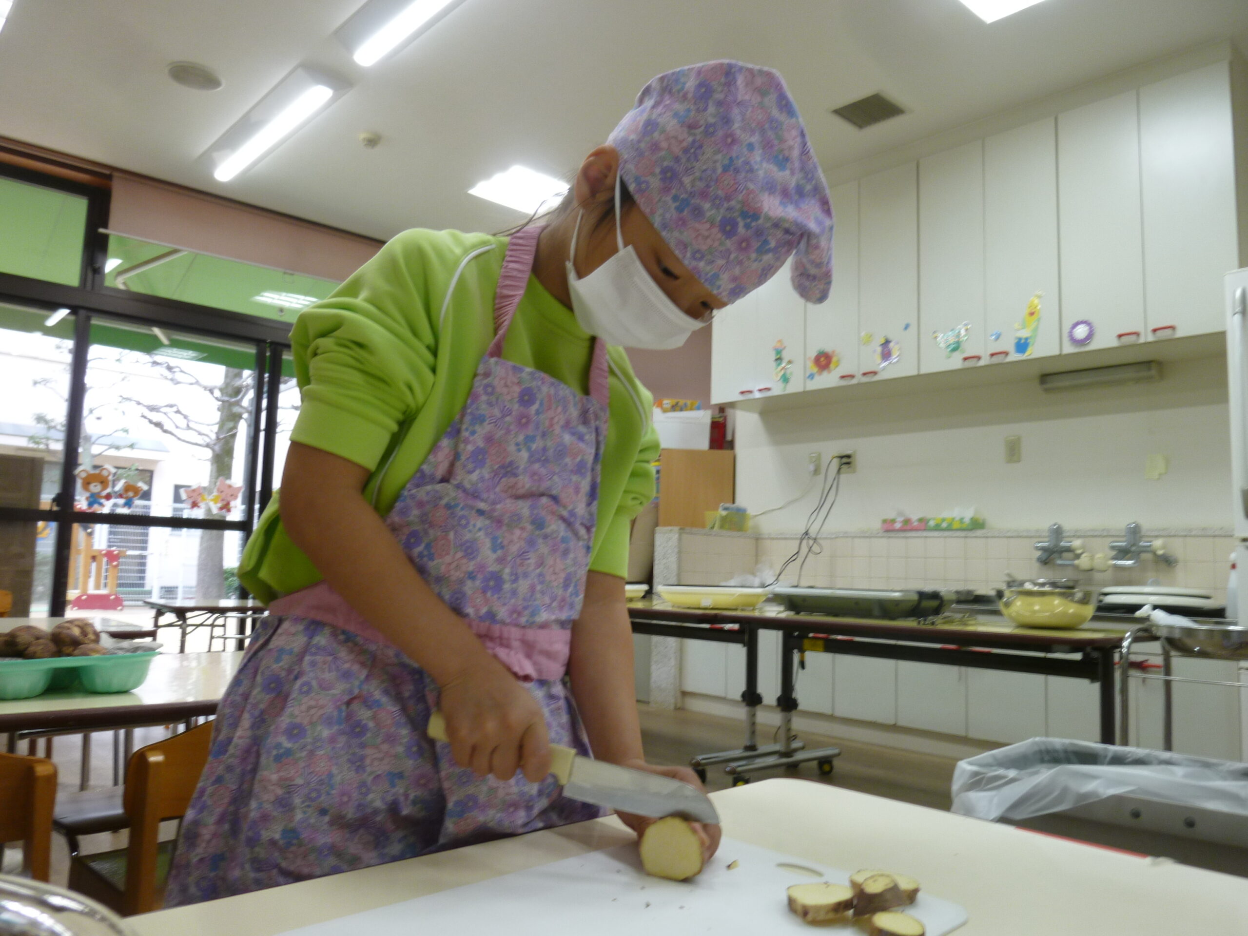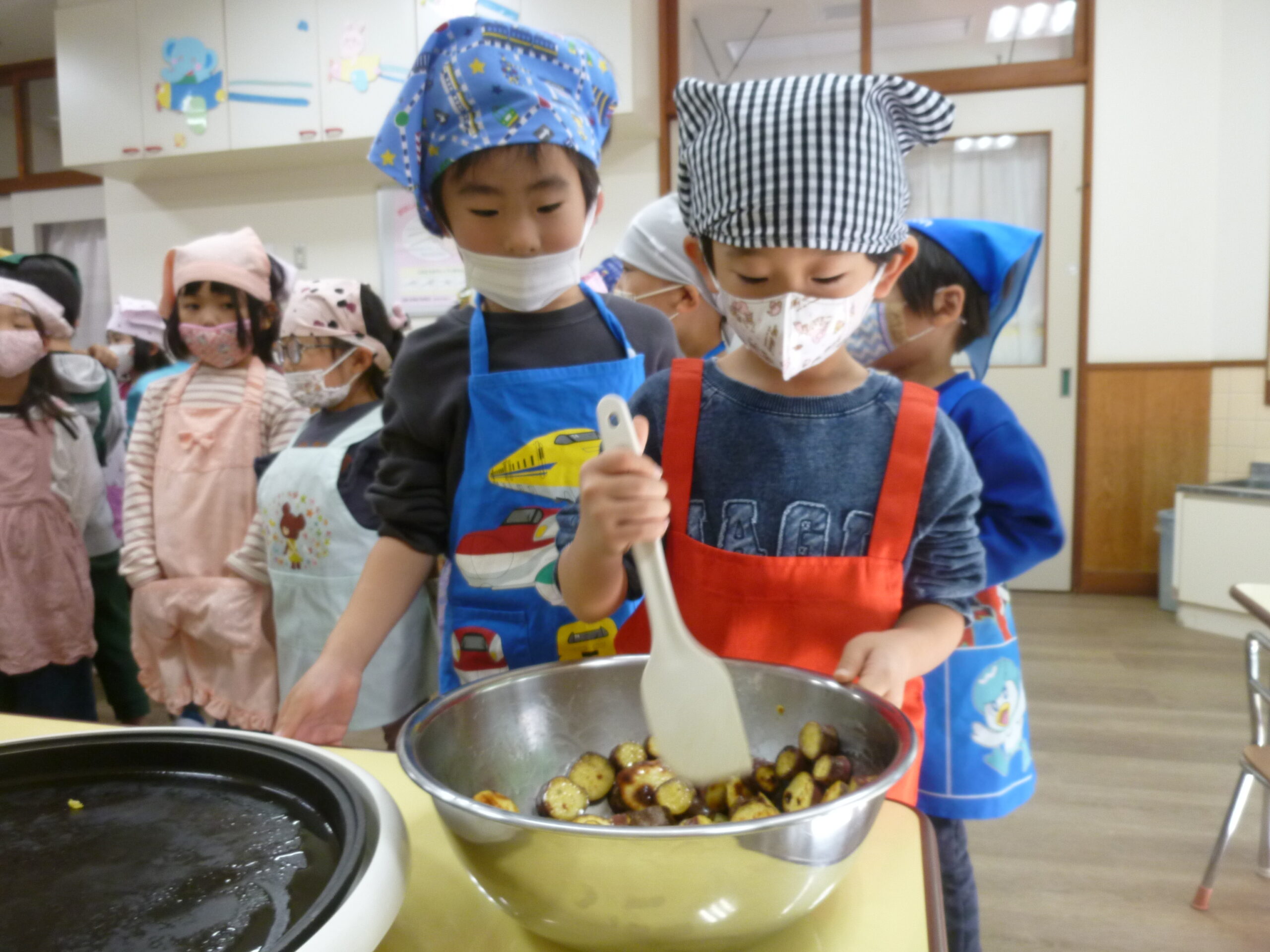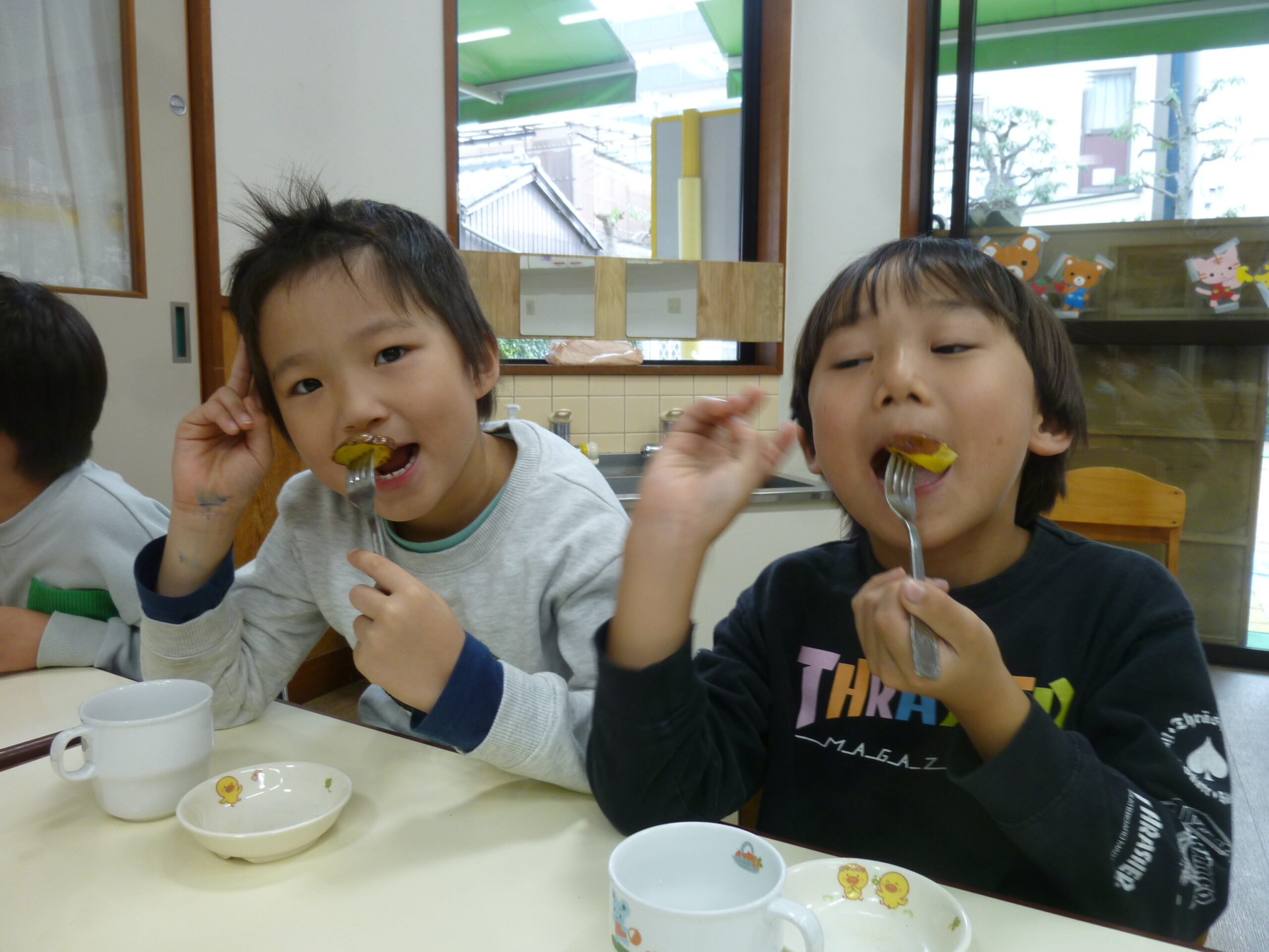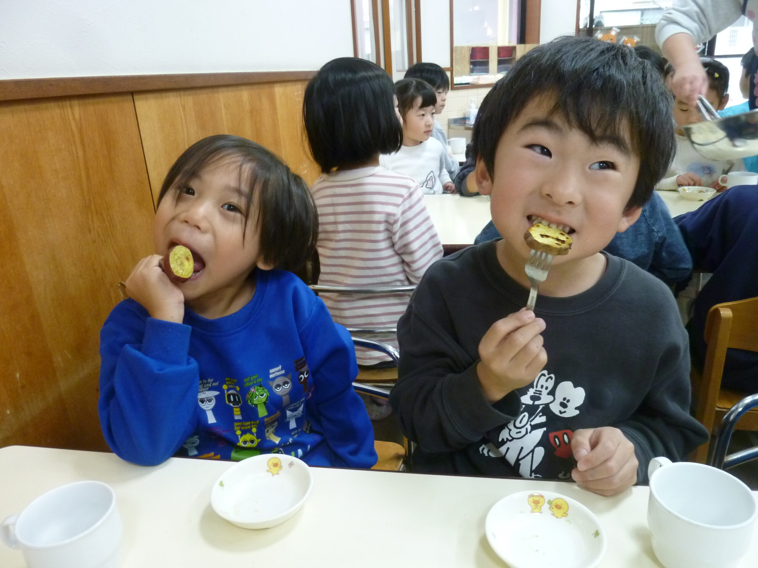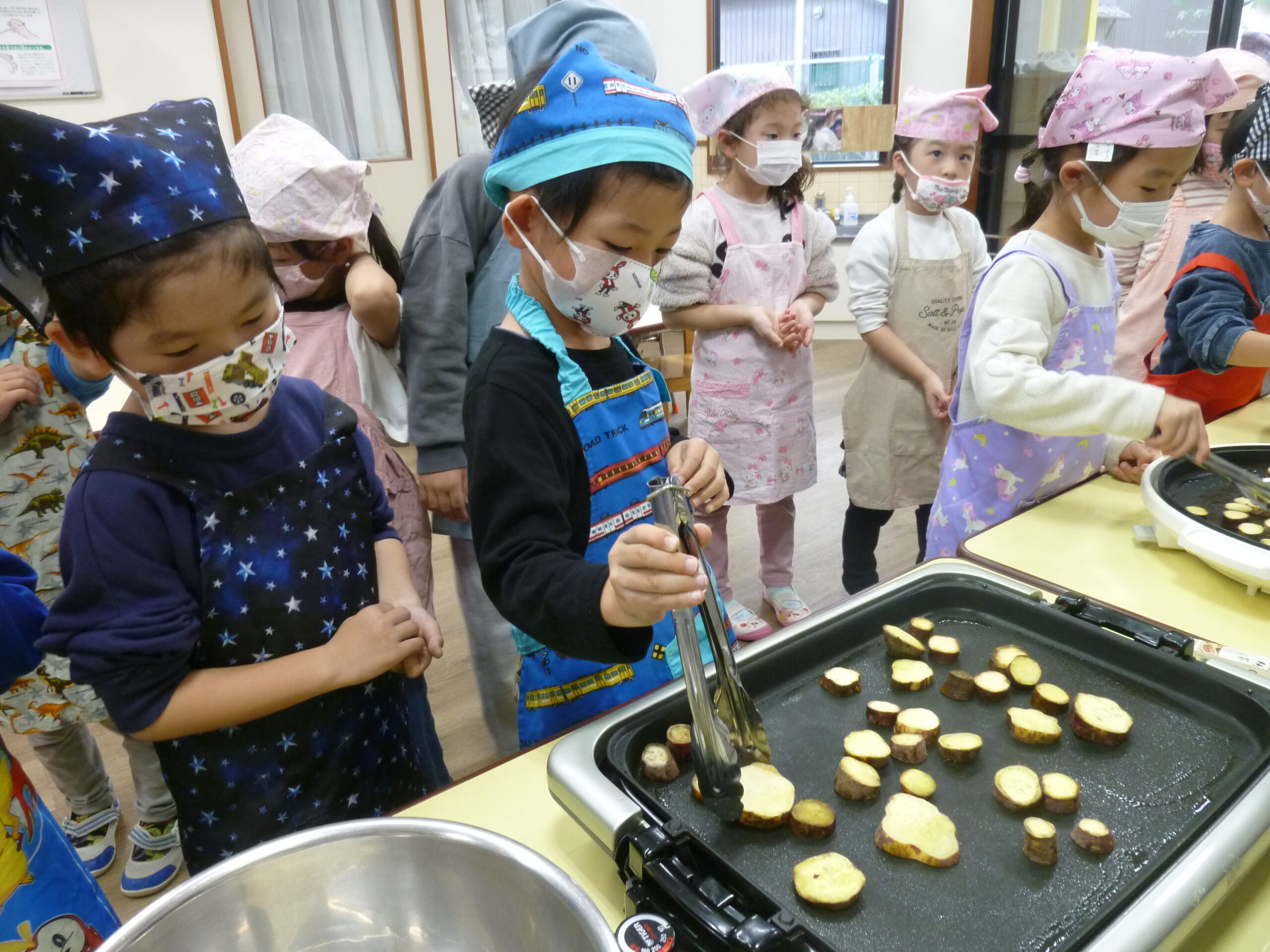 また、収穫したさつまいもを使っておやつ作りをしました。さつまいもを切ったり、ホットプレートで焼いたりとても真剣な表情で取り組んでいました。みんなでクッキングした後は、自分たちで作ったおやつを美味しそうに食べていました🎵