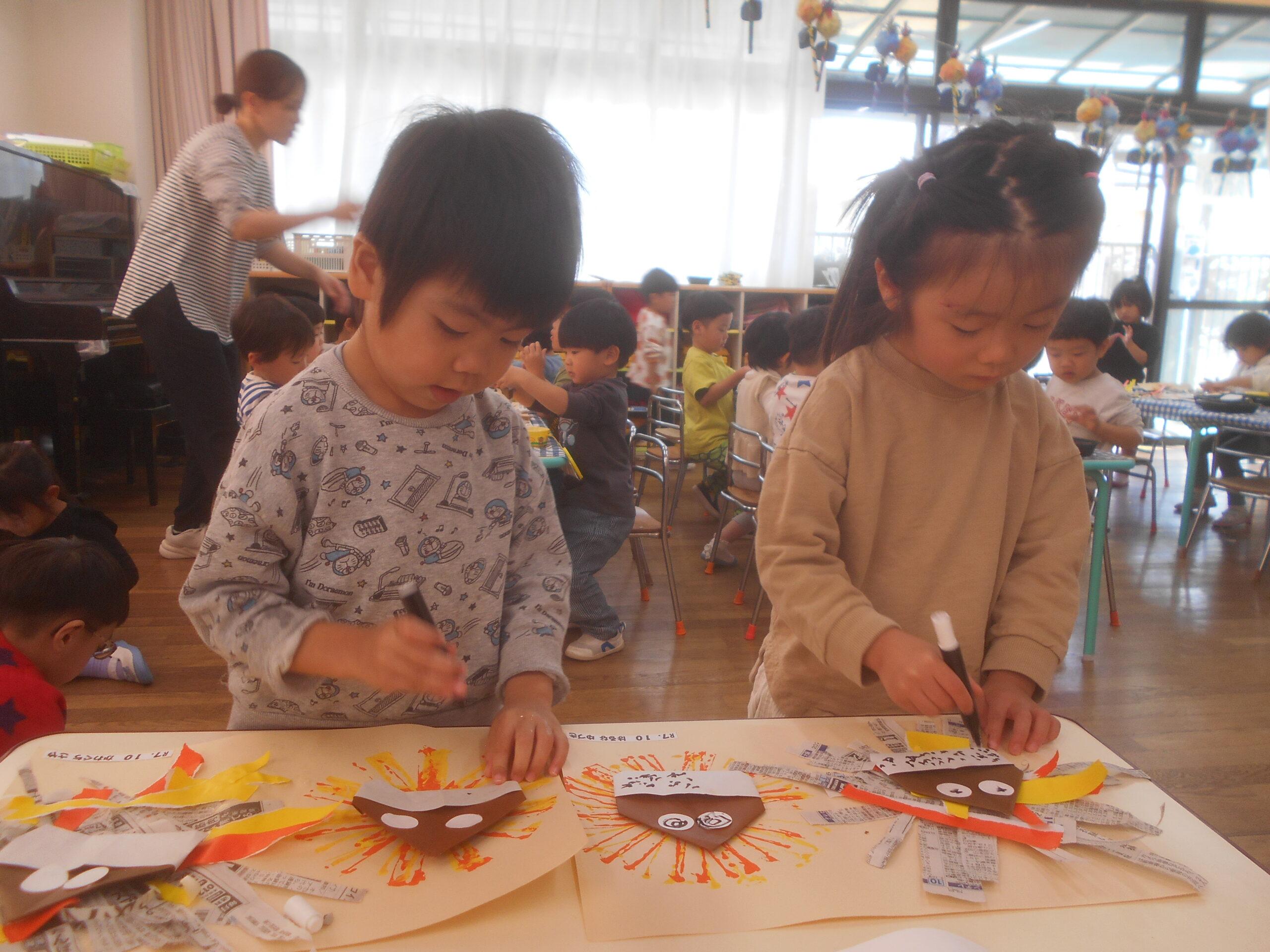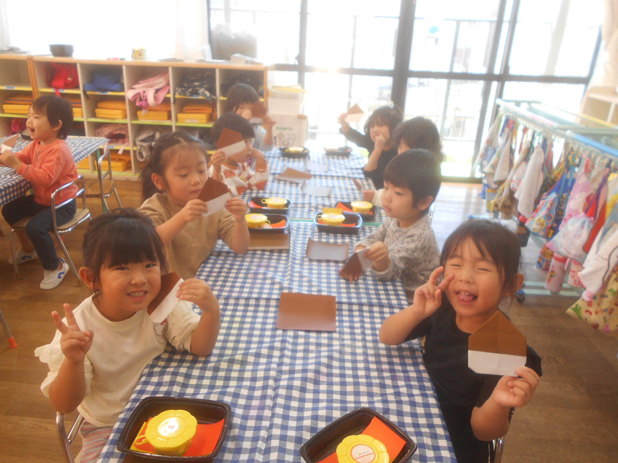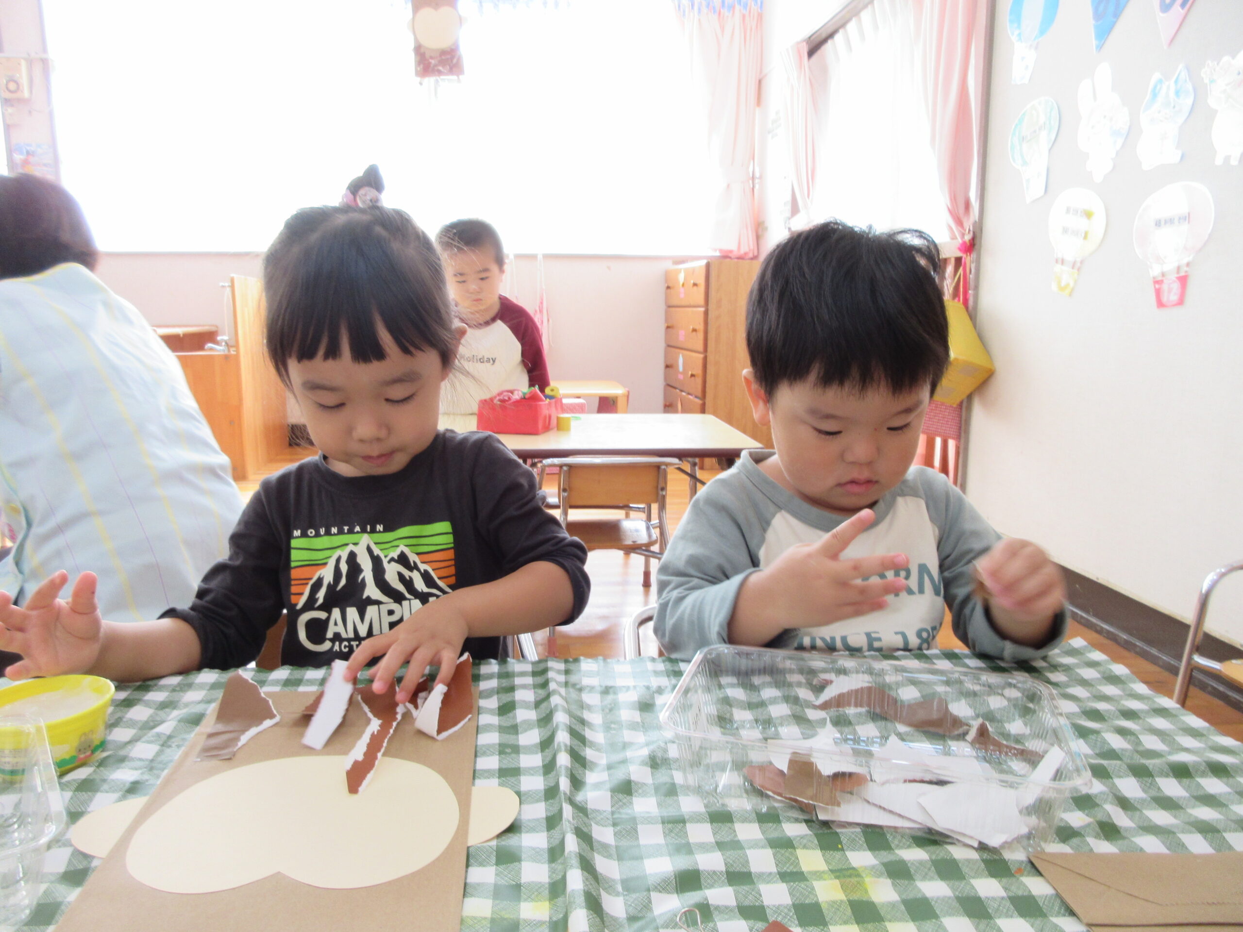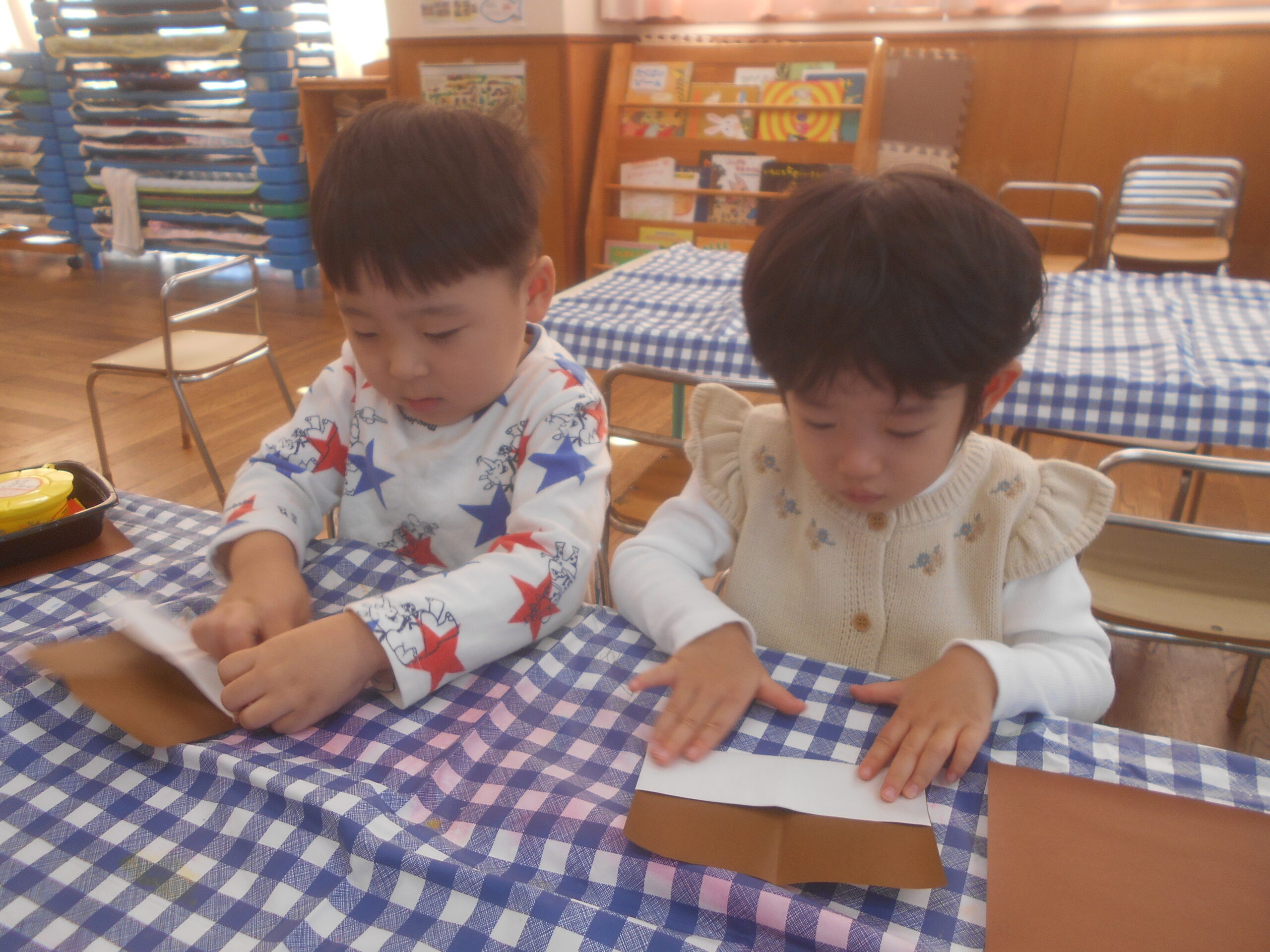 壁面製作で「くり」を作りました。今までは保育者と個別でしていた折り紙を大人数でしてみました。一斉の説明で少し戸惑う子もいましたが、「ちょっと難しい~」と言いながらも最後までやり遂げることができました!