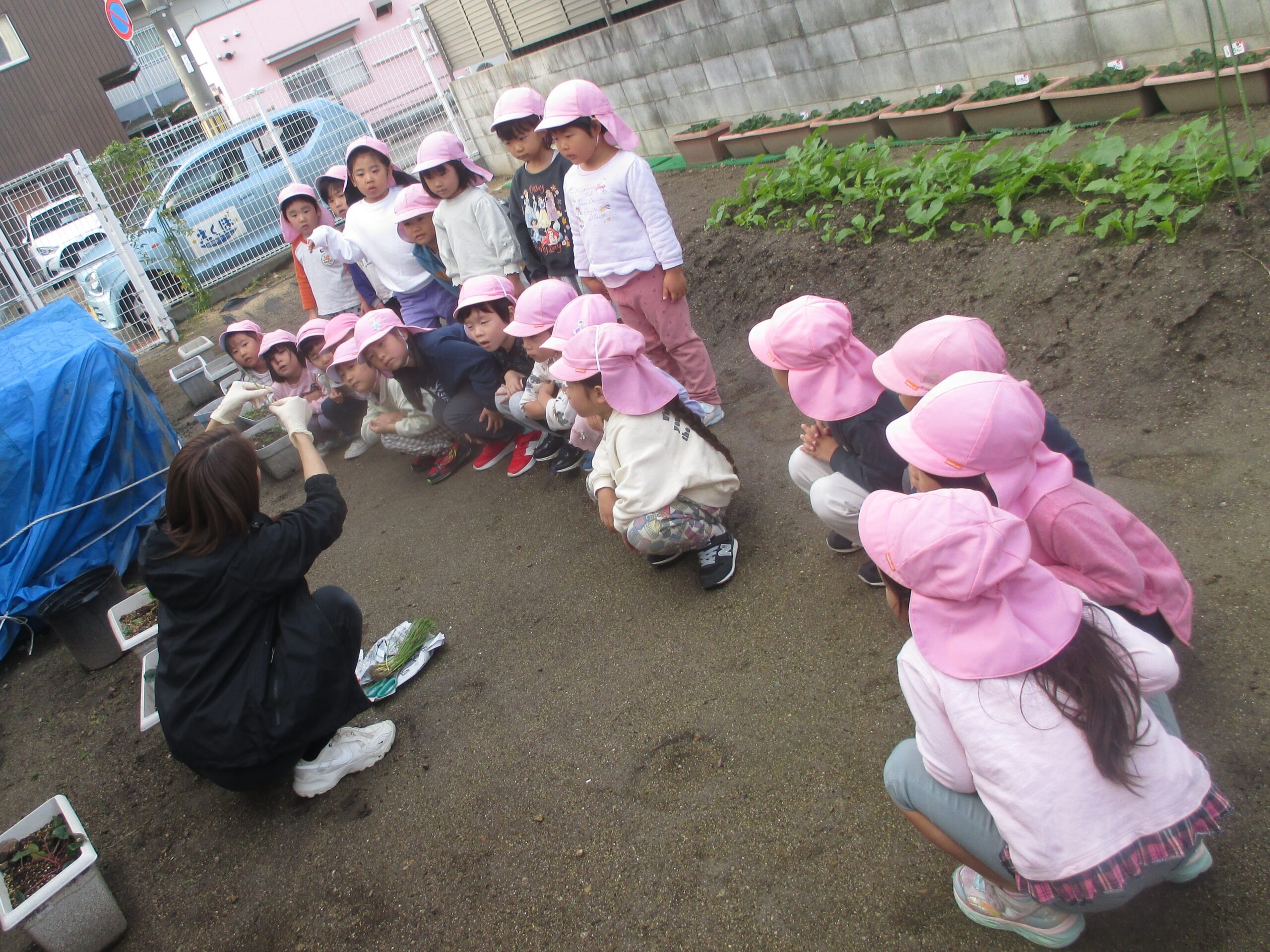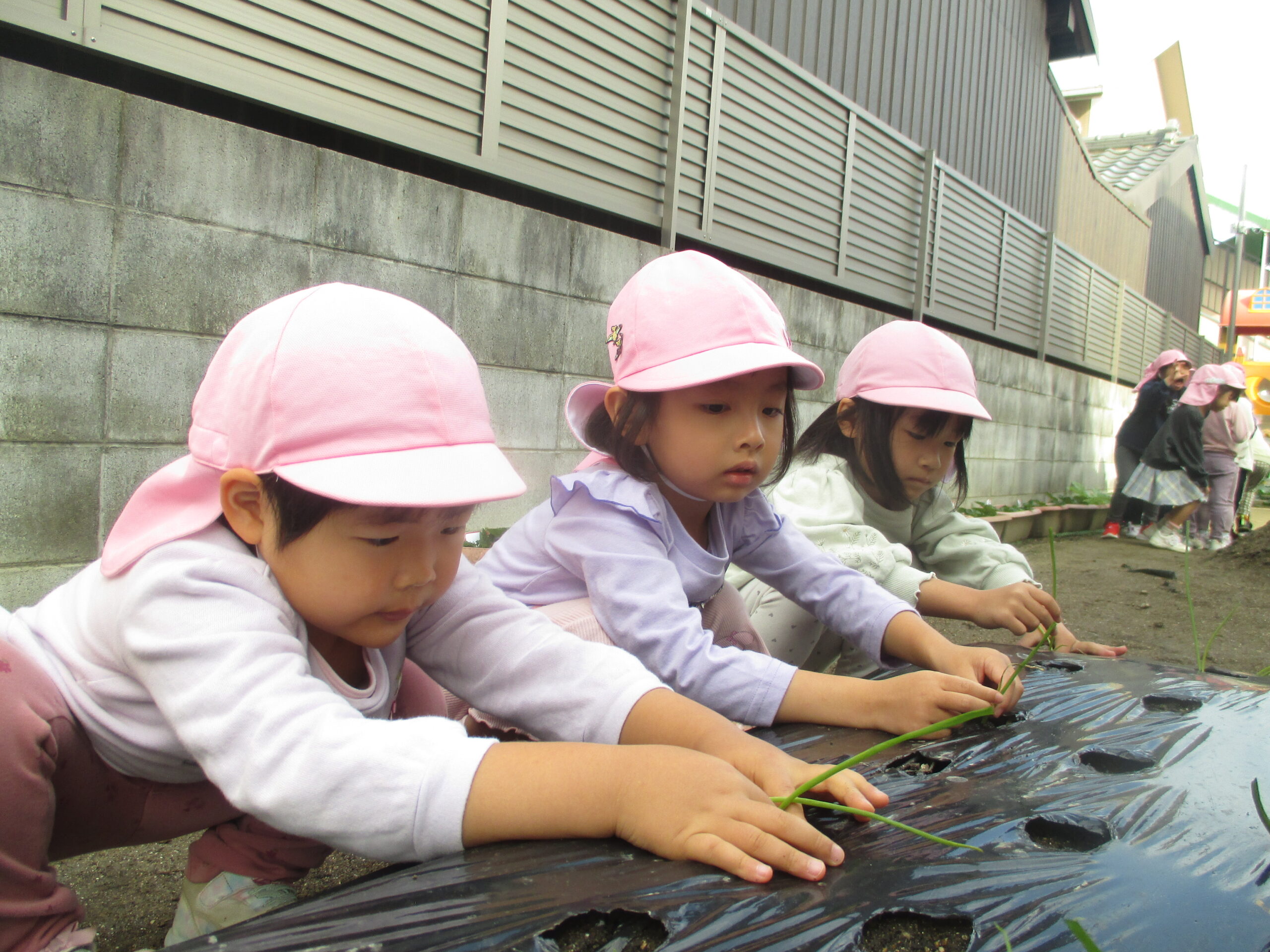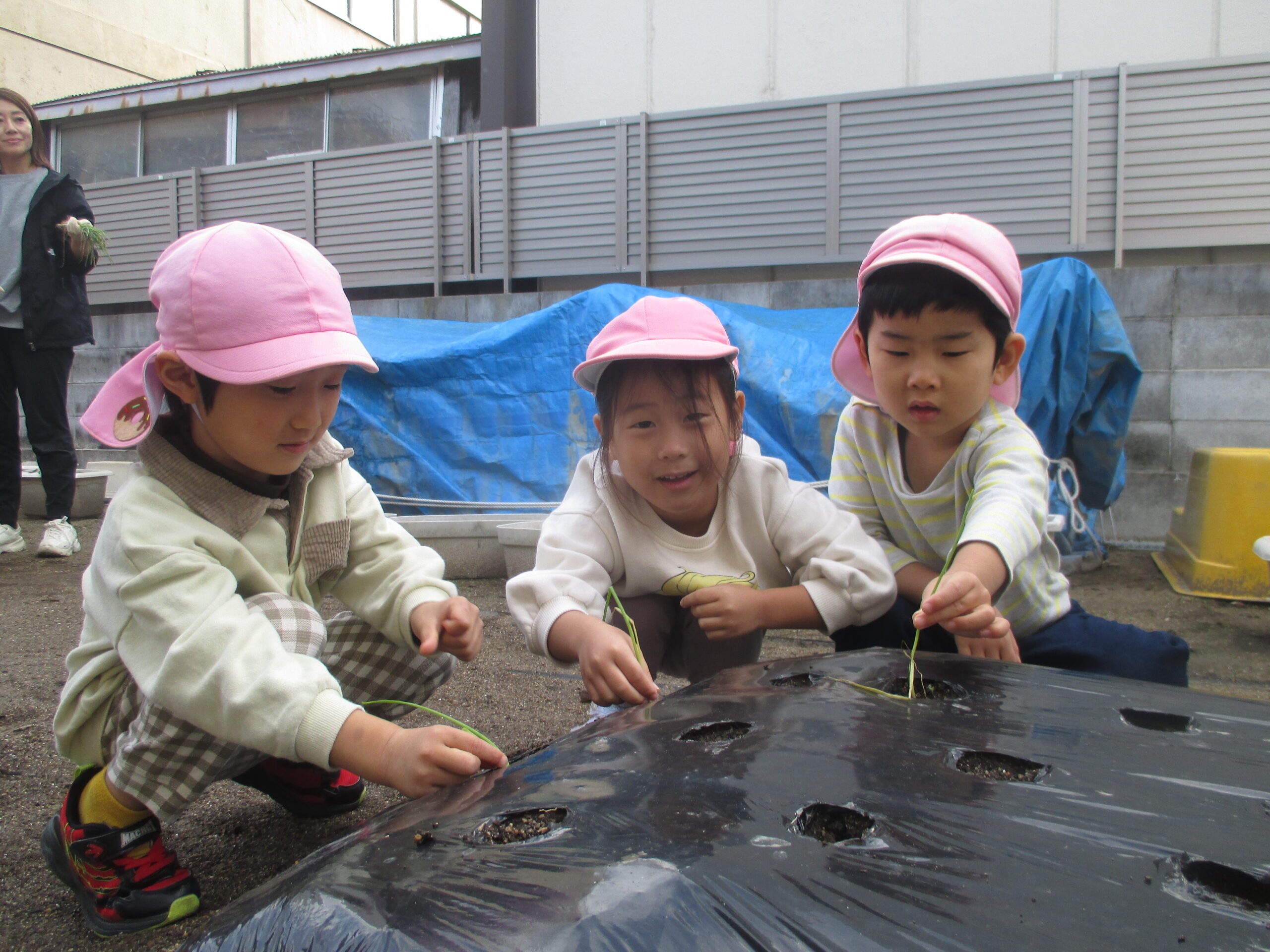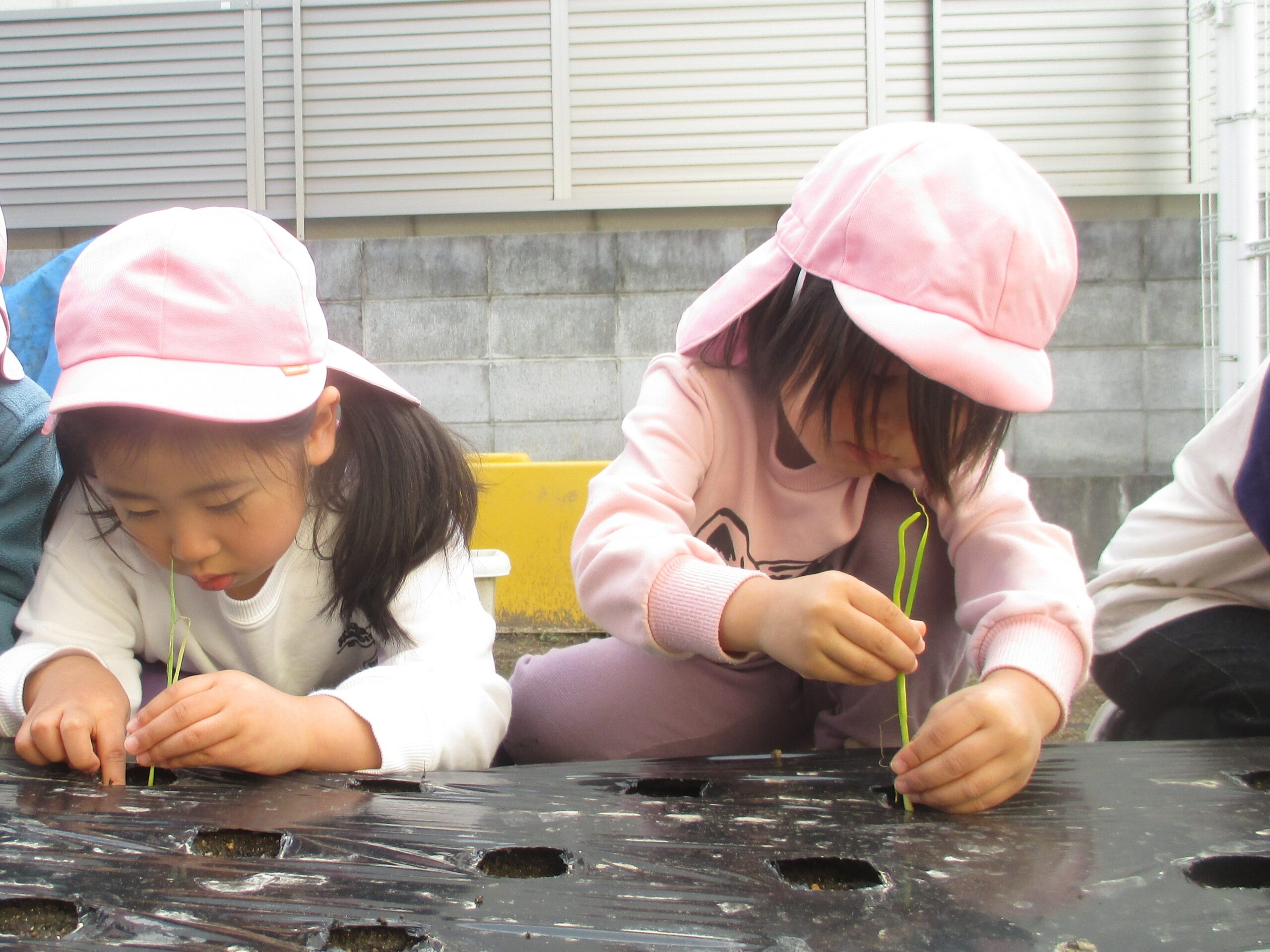 園の畑にたまねぎの苗を植えました。苗の形を見たり、植え方を教えてもらい「大きくなってね!」「おいしいたまねぎができますように!」と優しく土をかけたりする姿が見られました。さっそく水やりに意欲的な子どもたちです😊 収穫できる日が待ち遠しいね!