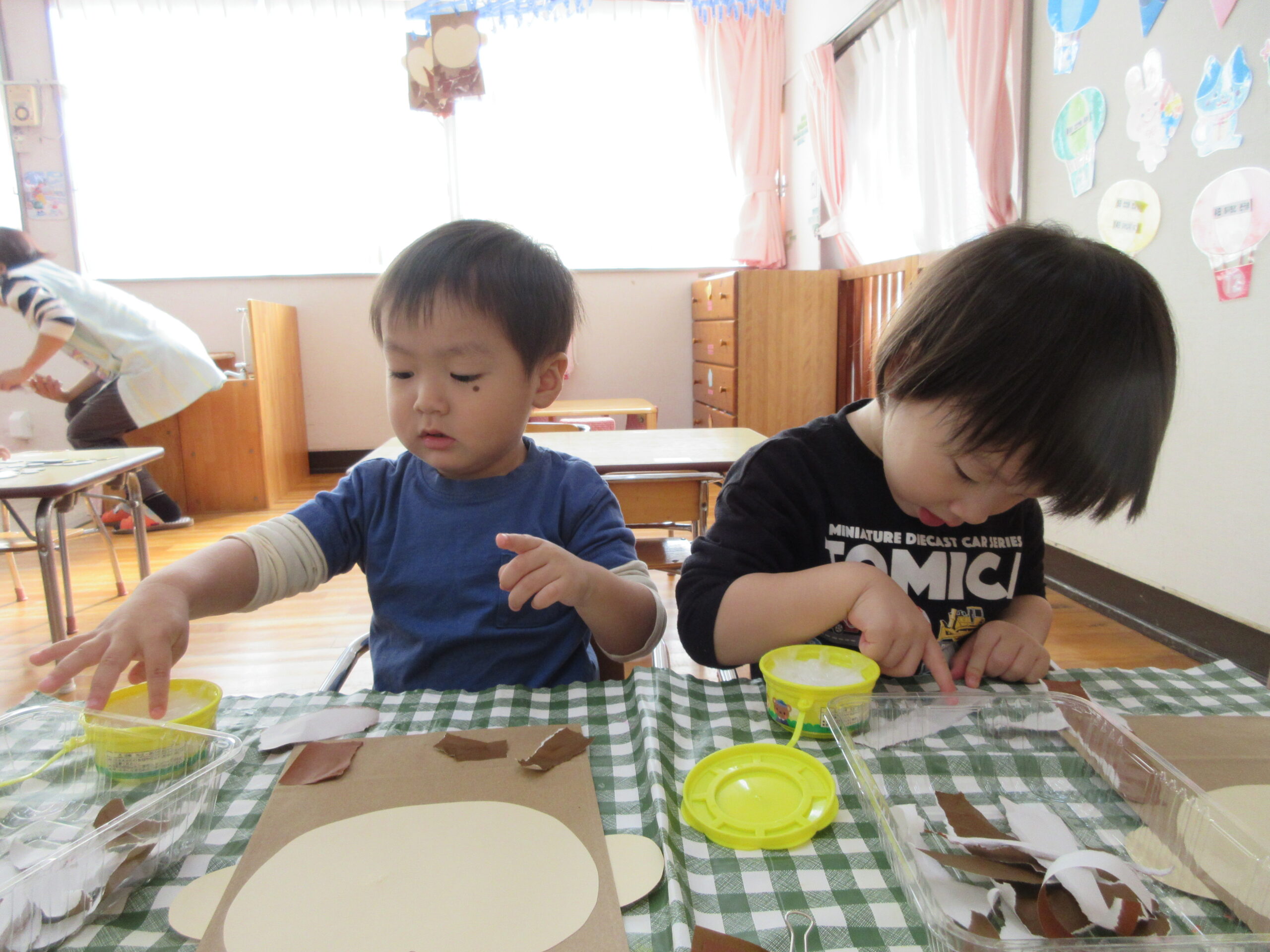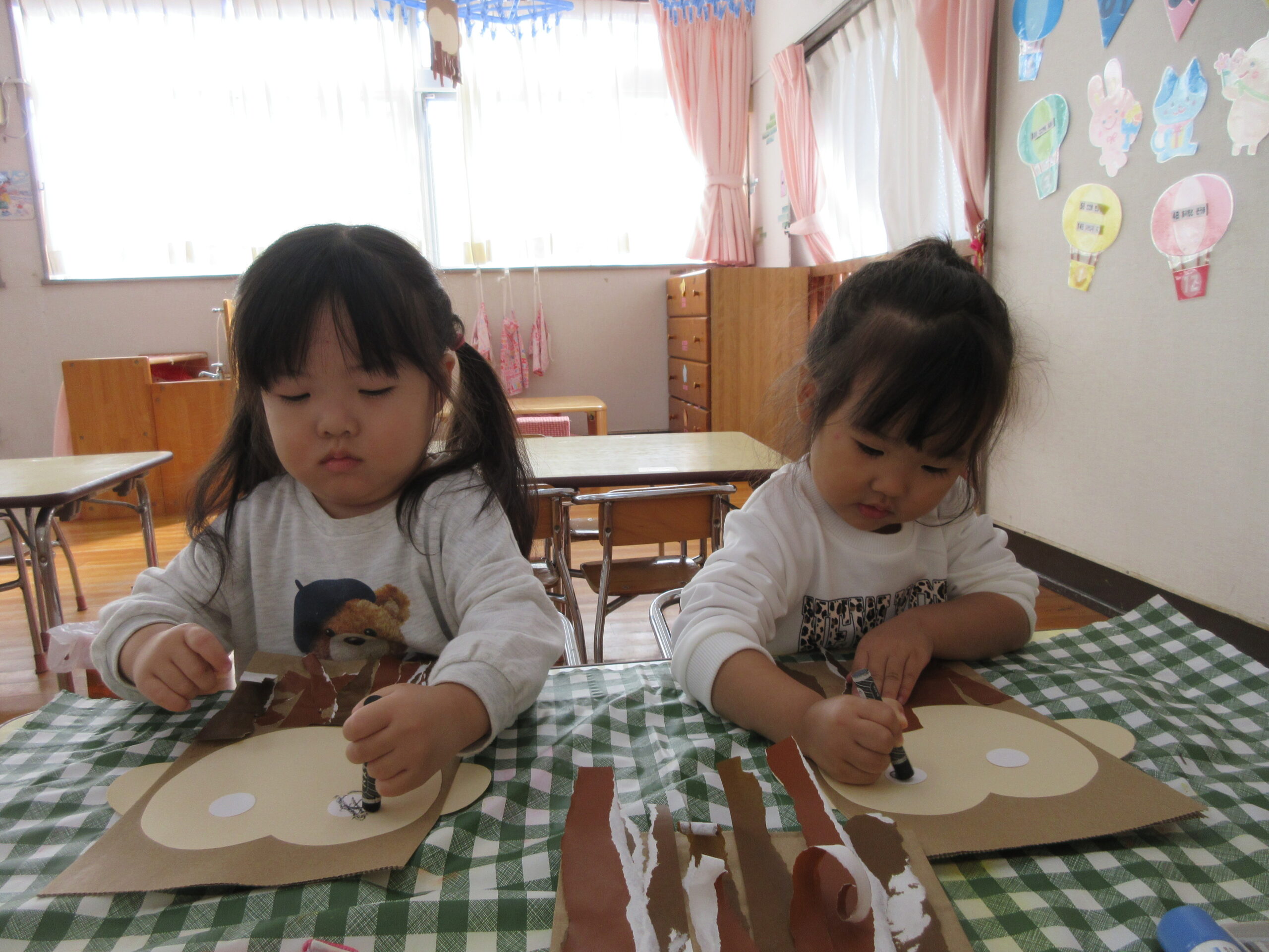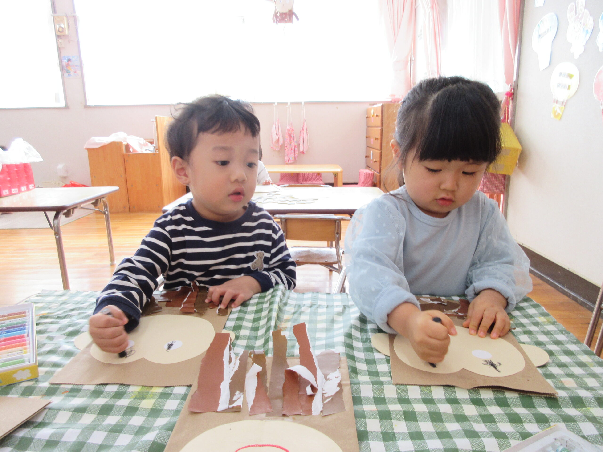 11月の製作ではサルを作りました。先月親子触れ合い交流会で動物園に行った際に、サルがいたことを覚えていたのでその時の話をしながら取り組みました。「動物園で見たサルはどんな顔をしていたかな」と思い出しながら、顔のパーツをクレパスで描いていき個性豊かなかわいいサルが完成しました☆