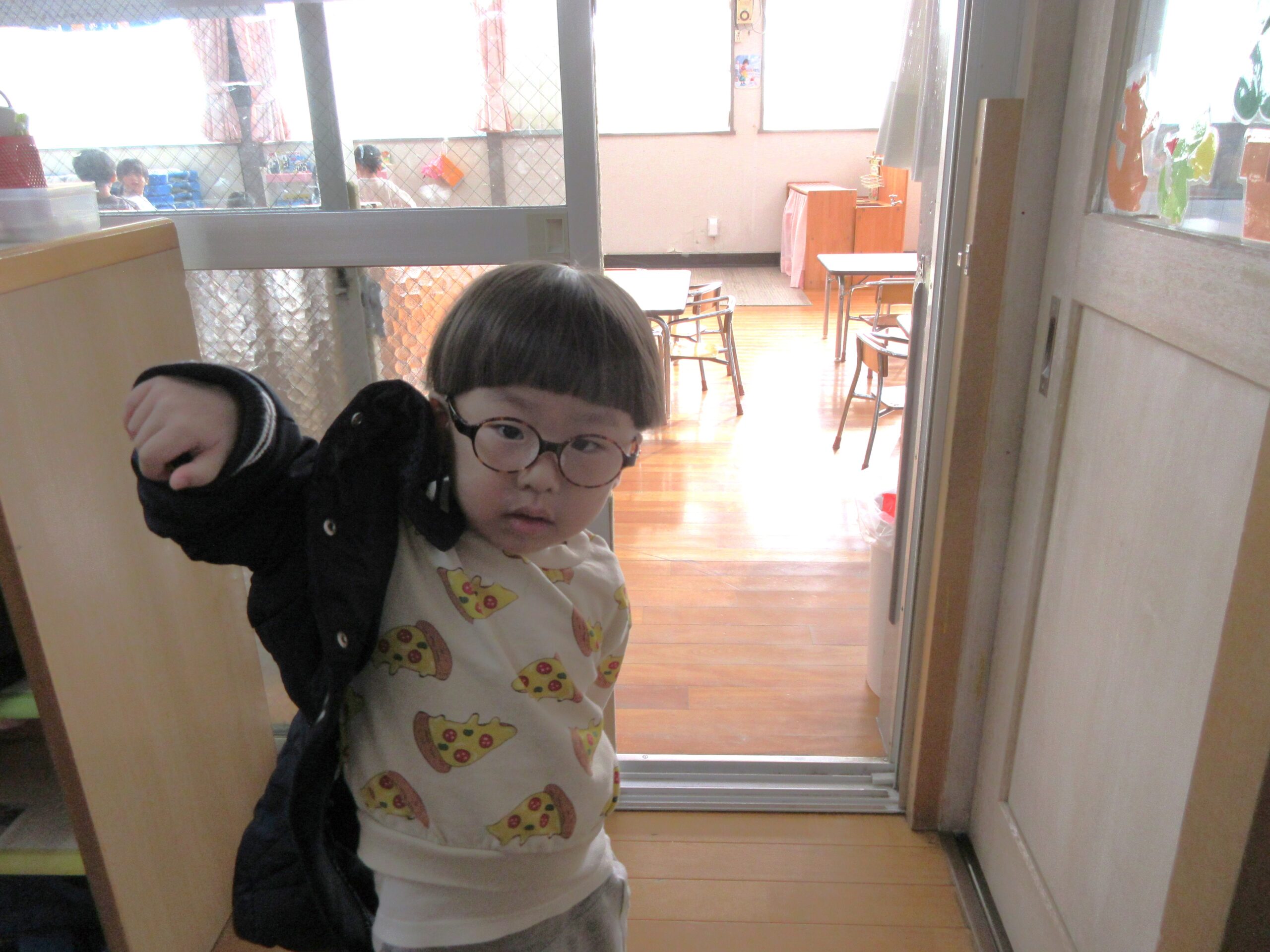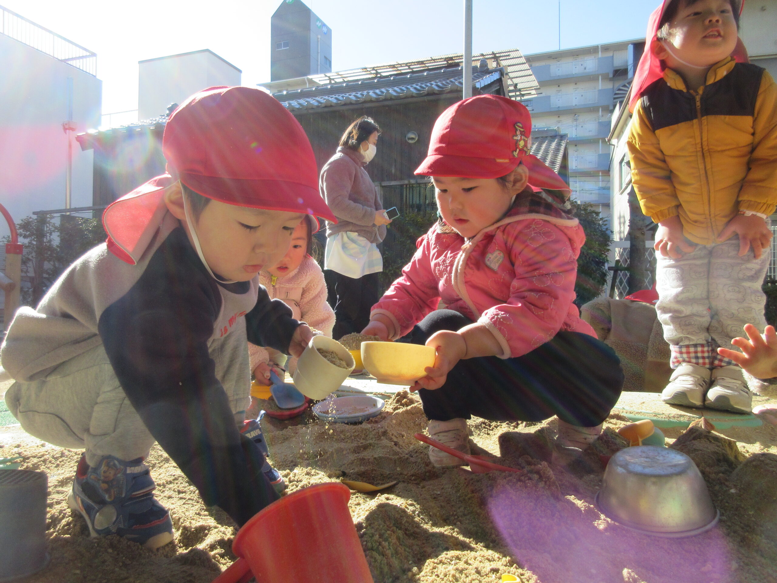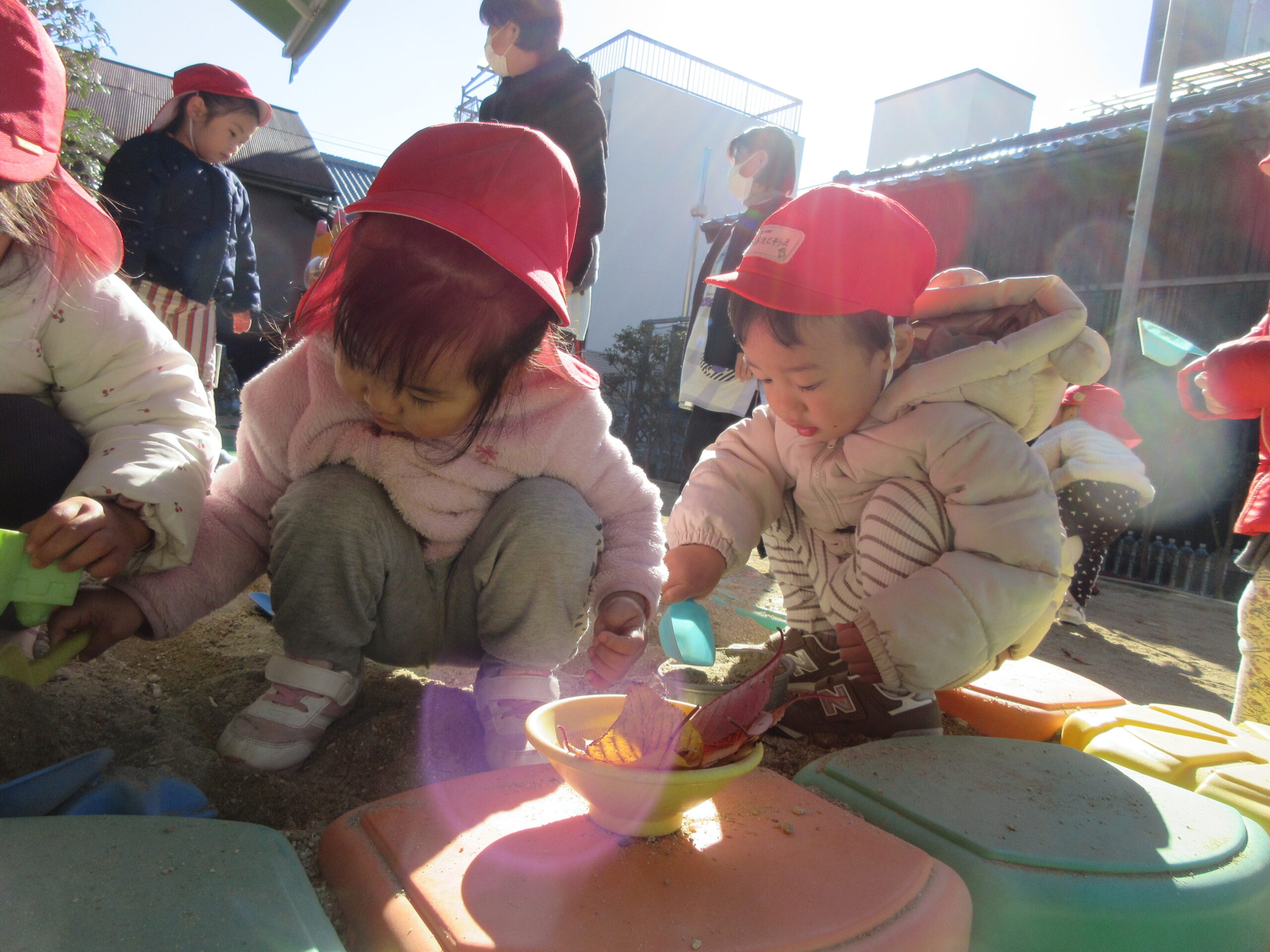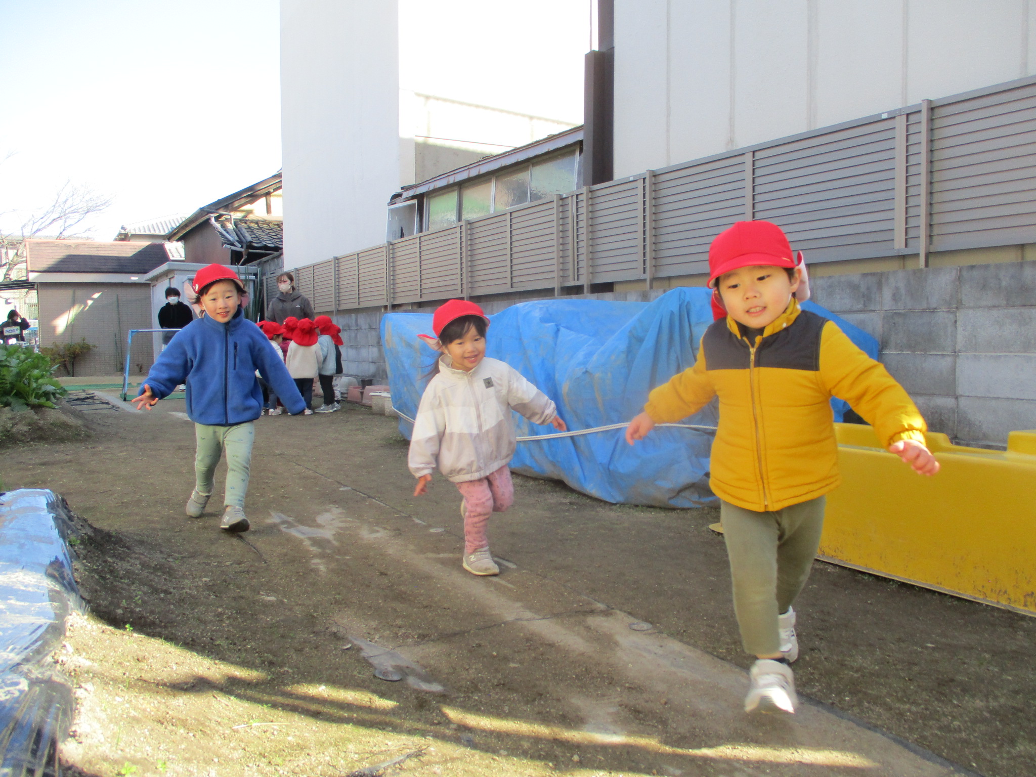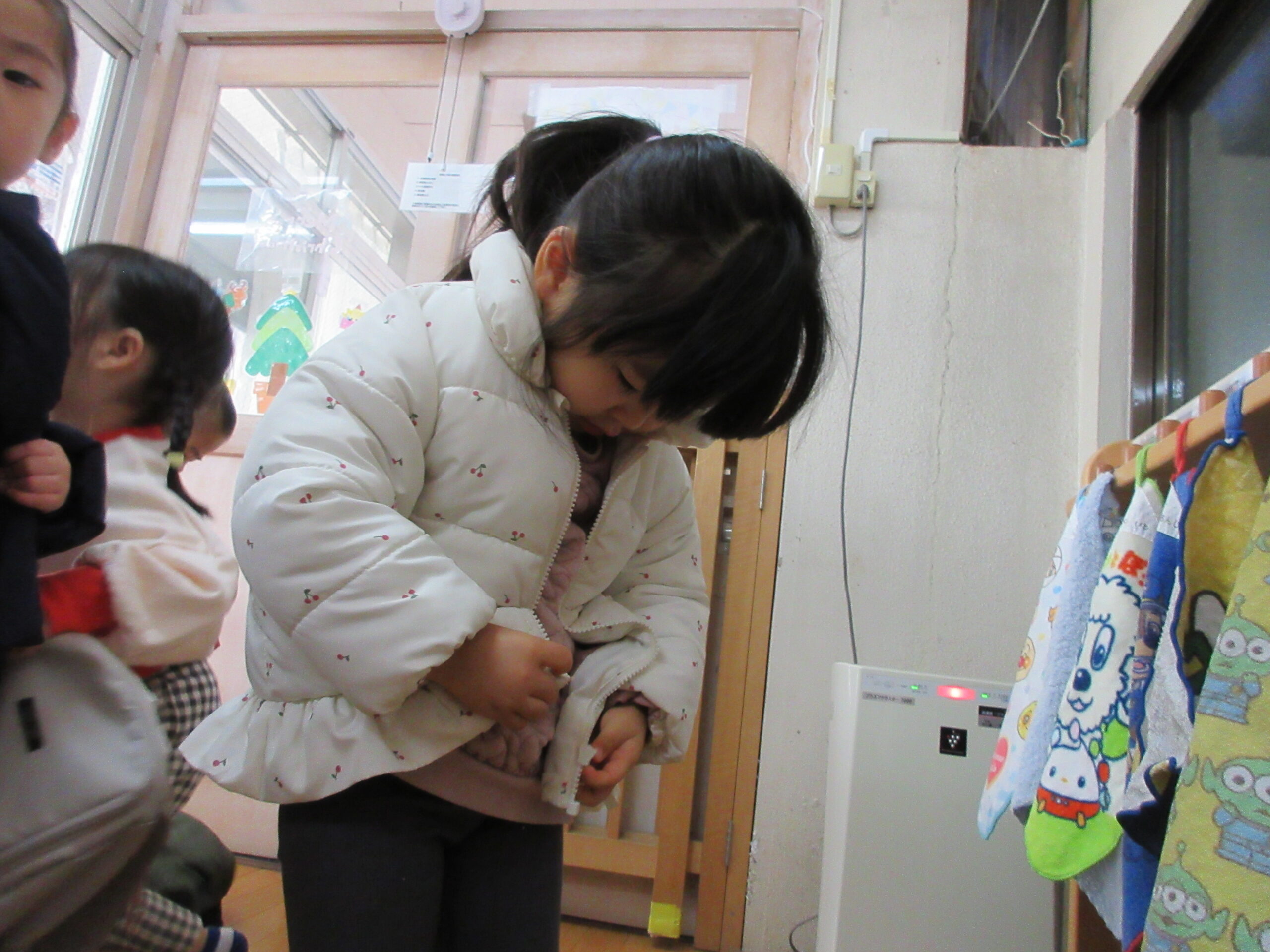 寒さに負けずに元気いっぱい遊んでいる赤組さん☆彡 気温が低い日には、上着を着てから外遊びに出ていて、一人で着ようと頑張っています。上着の袖に両腕を通せるようになると、次はチャックを閉めることにも挑戦中です!