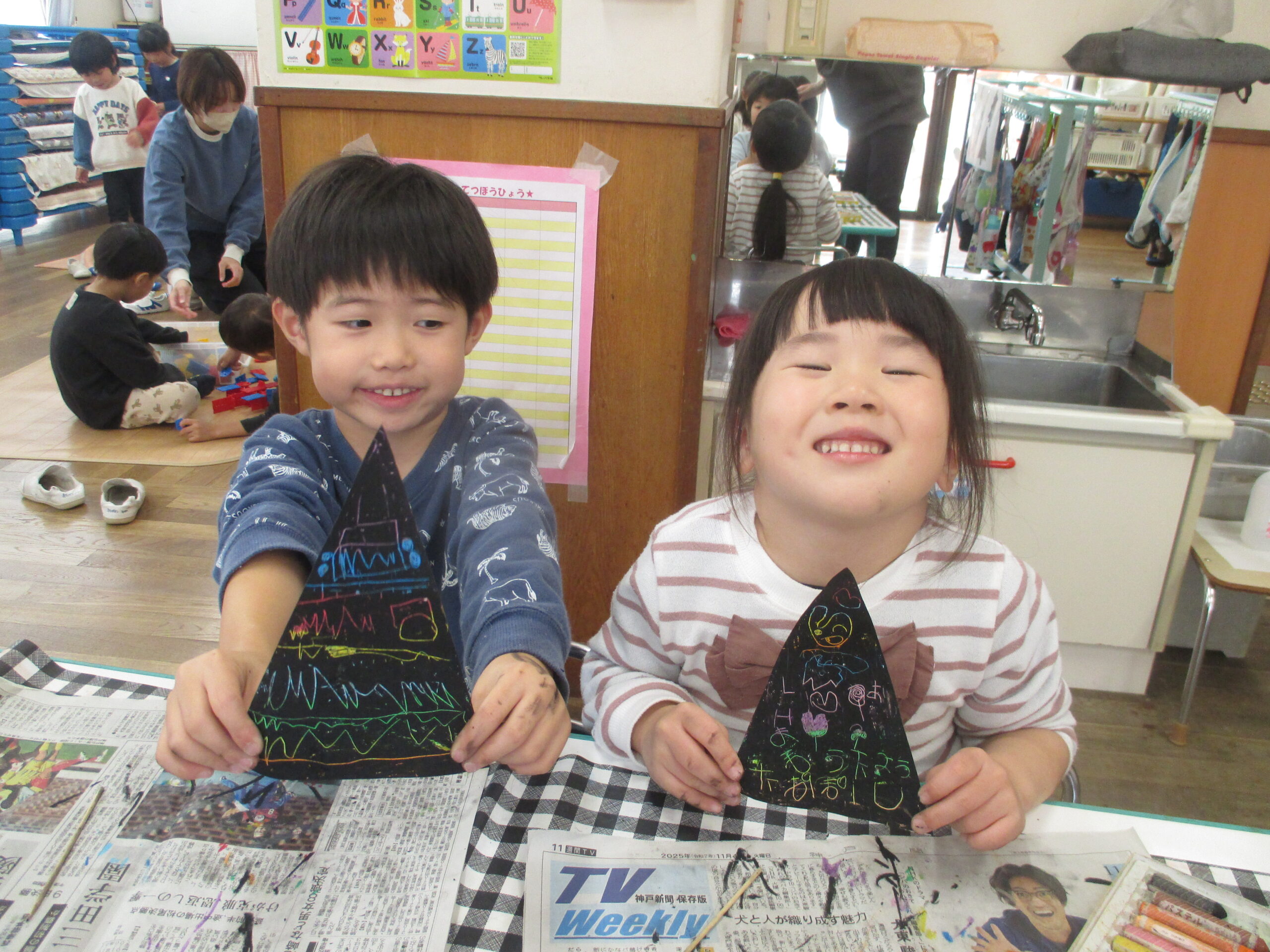 クリスマスの製作で、スクラッチアートをしました!クレパスでツリーの形をした画用紙にカラフルな色を塗り、その上から真っ黒に塗りつぶしました。子どもたちは「なんでー!」「せっかく綺麗な色になったのに!」と不思議そうにしていました。しかし、竹串で削っていくと綺麗な模様が!そして、組み合わせてお部屋に大きなツリーが完成しました★