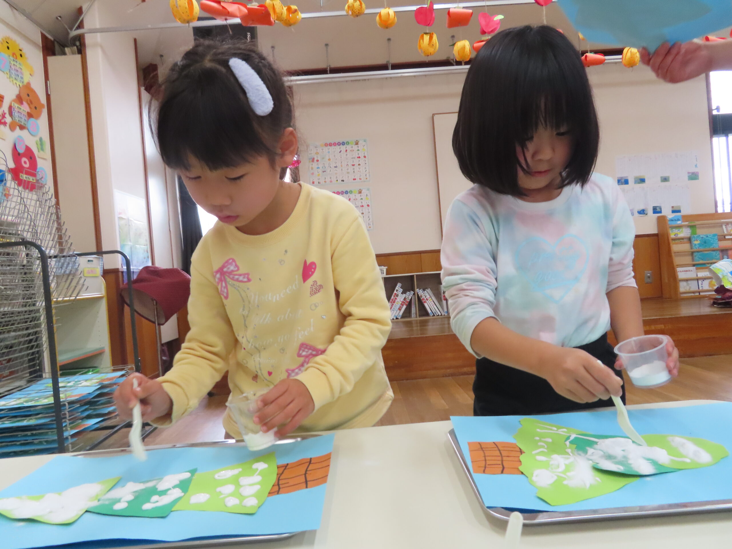 クリスマスツリーの製作をしました。ツリーに重曹アートで飾りをつけ、その後、乾いてから絵の具で色をつけました。じわーっと色が広がる様子を見て「すごーい!」「きれい!」と言ってとっても驚いていました★