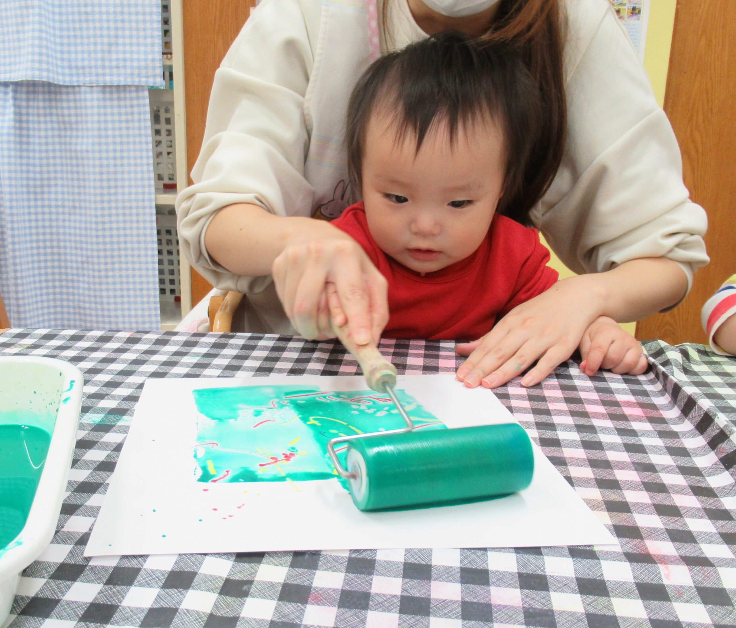 0歳児さんは、製作でクリスマスツリーを作りました。パステルでなぐり描きをして、その上からローラーに絵の具を付けてはじき絵にチャレンジ!!完成すると、「これ」と指差しをして嬉しそうに見ていました。絵本が大好きで、『うわーっ!』『だっだー』がお気に入りです!