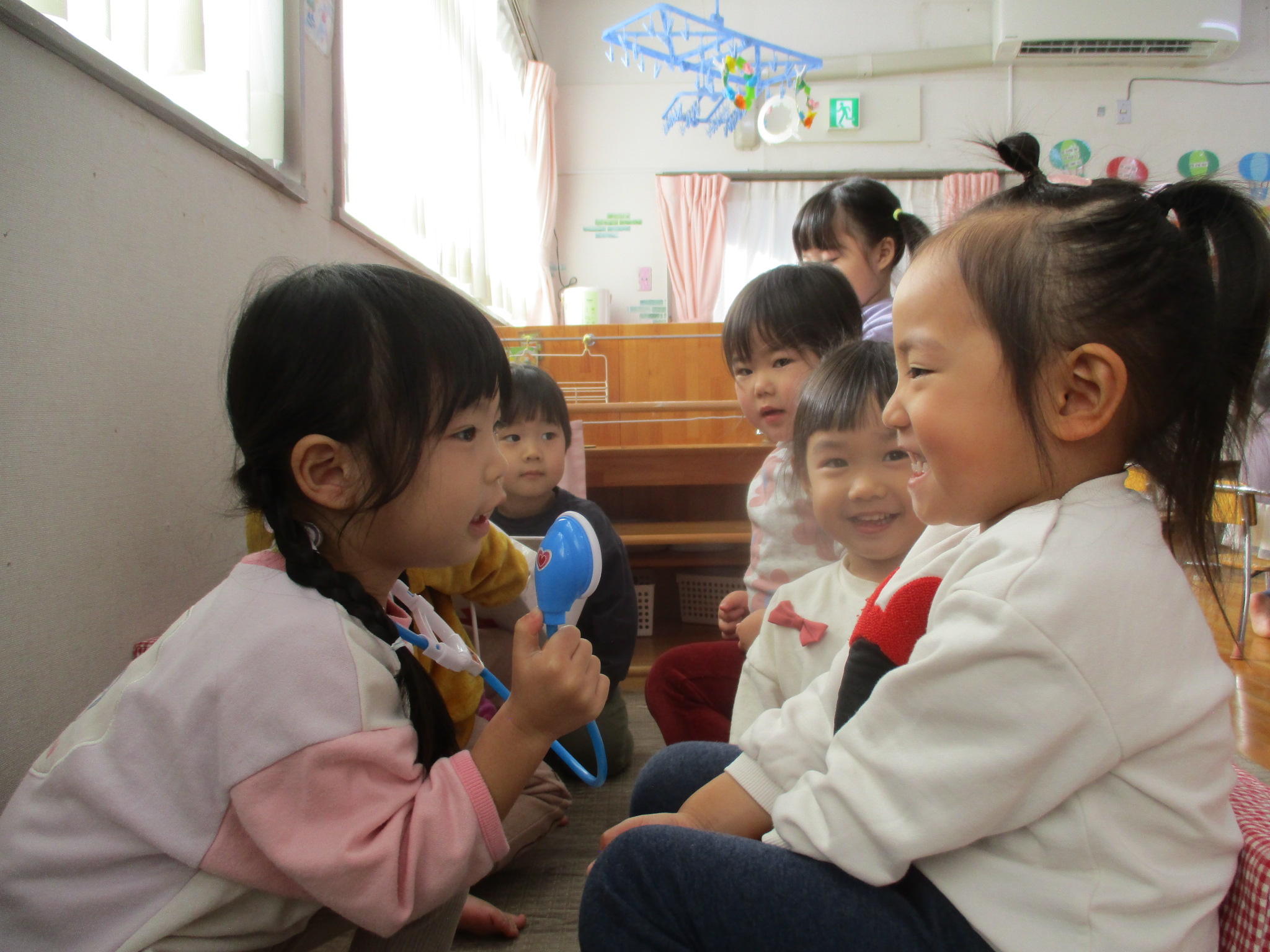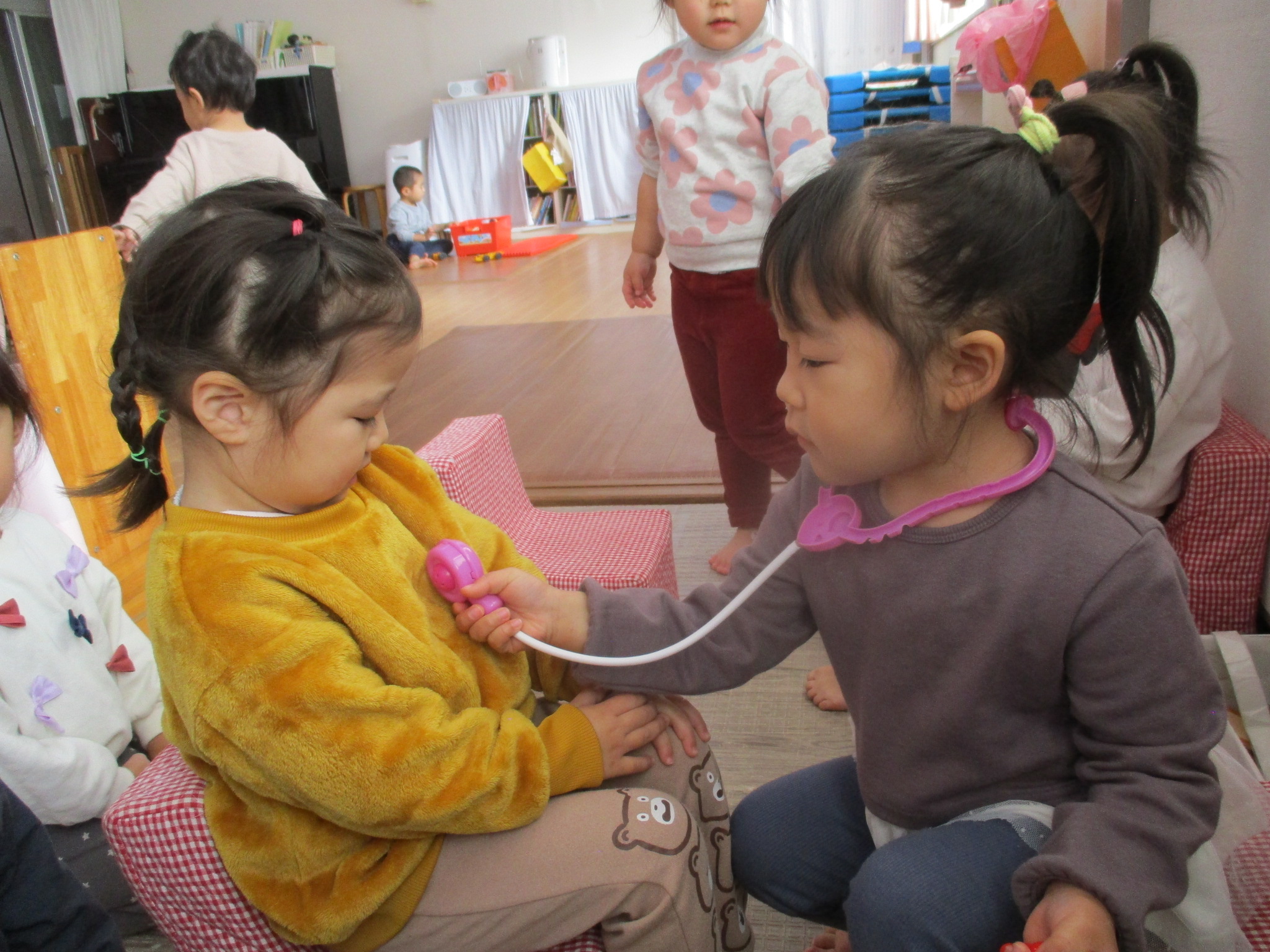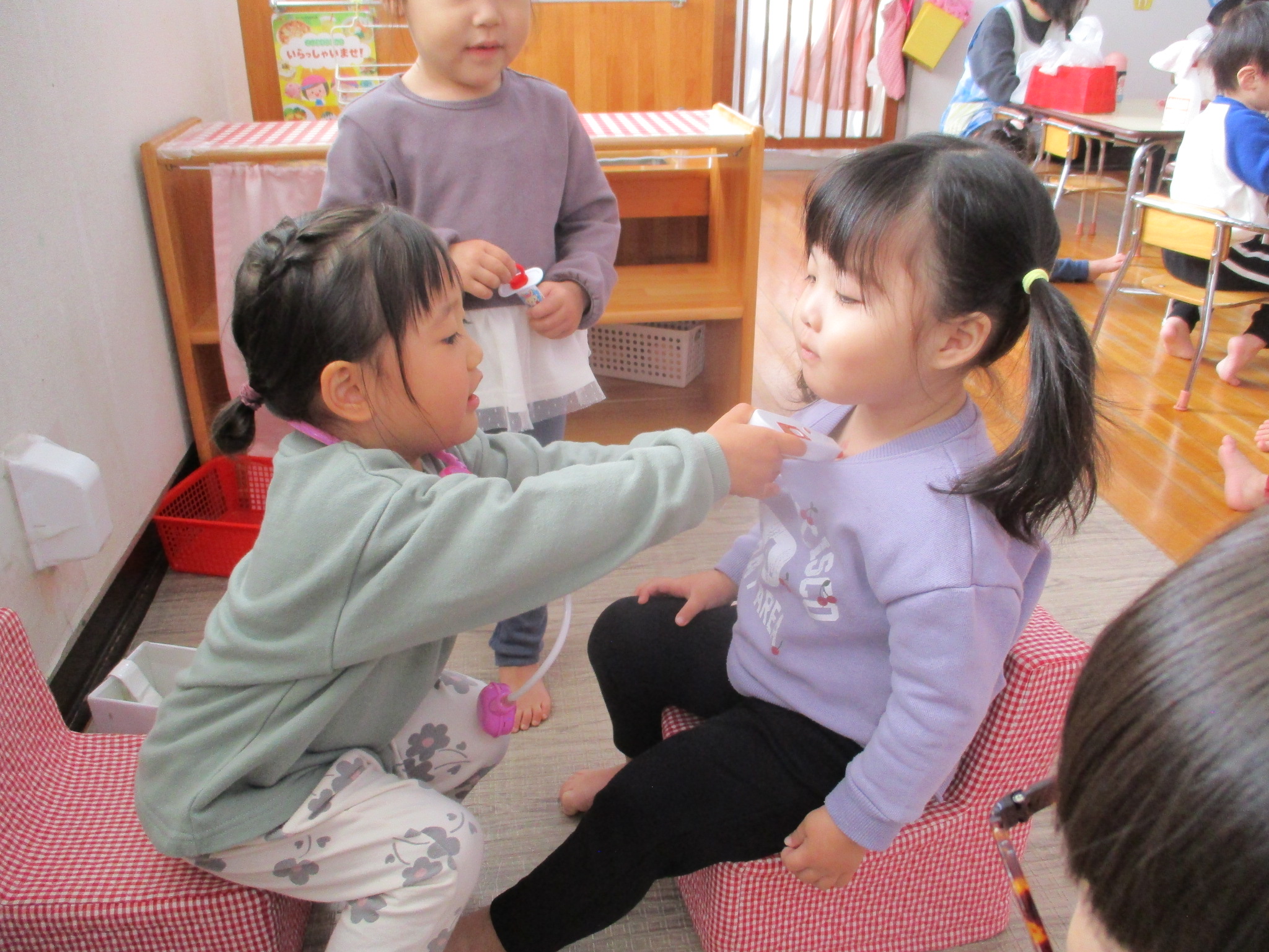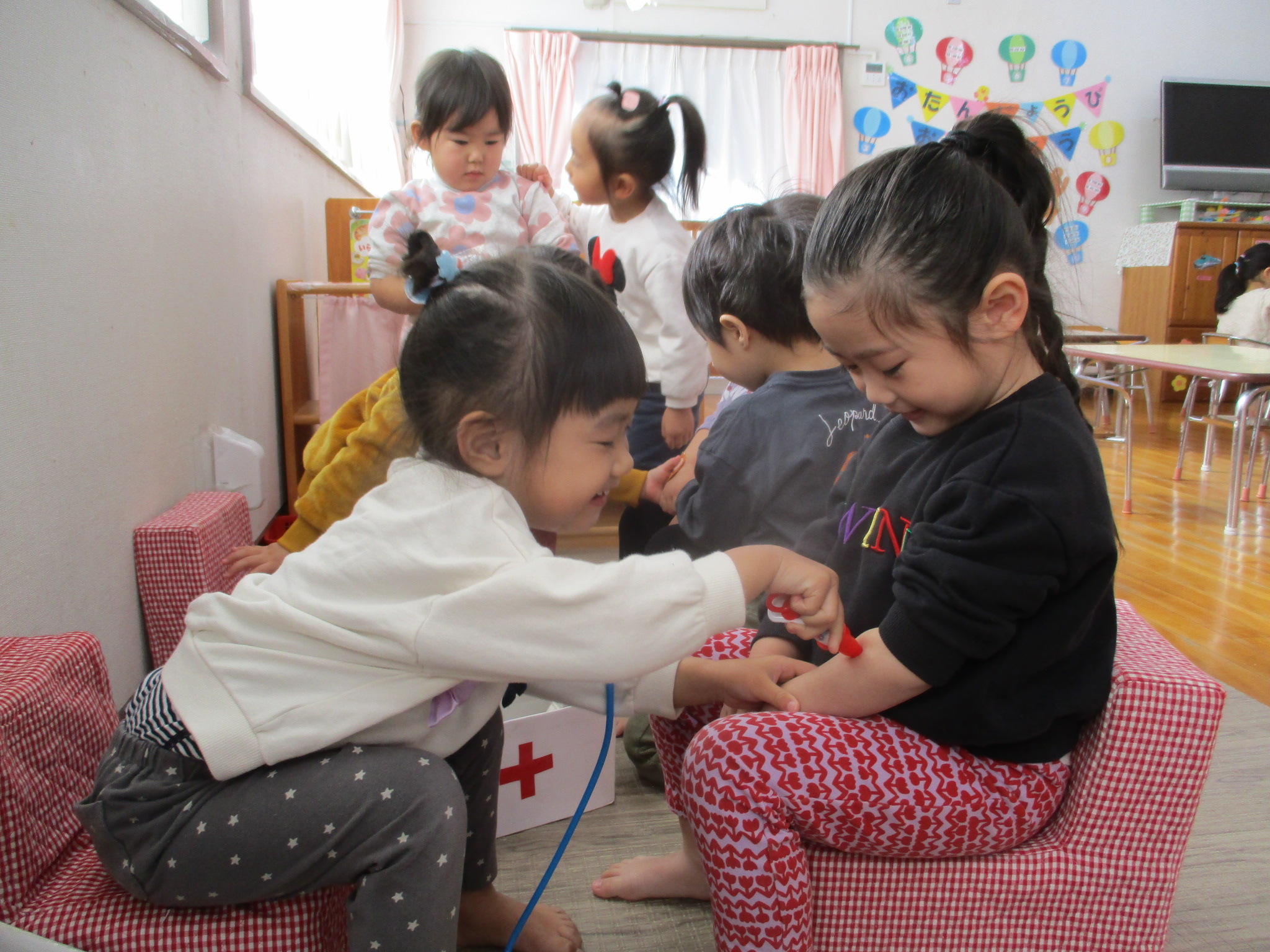 室内遊びでは、お医者さんごっこが始まりました。「今日はどうしましたか?」「注射しますね~」などと、お友達とやり取りをしながら役になりきって楽しんでいます!
