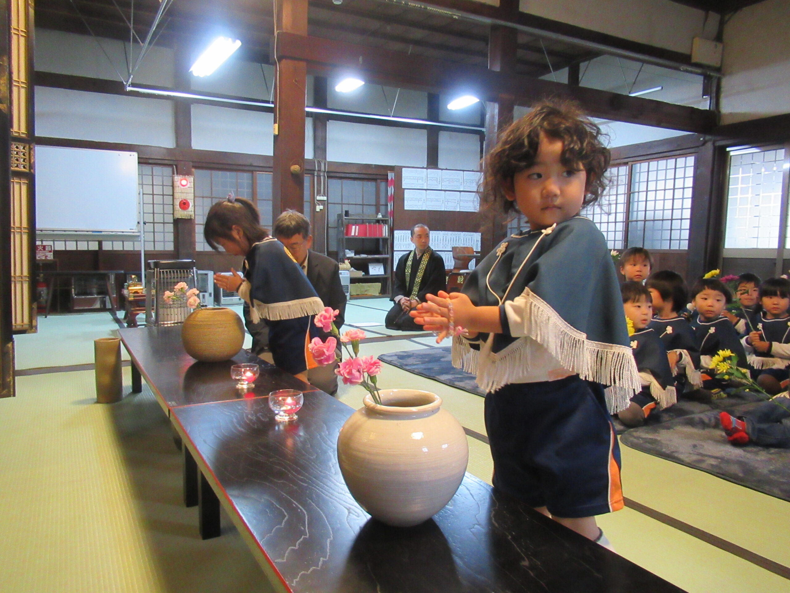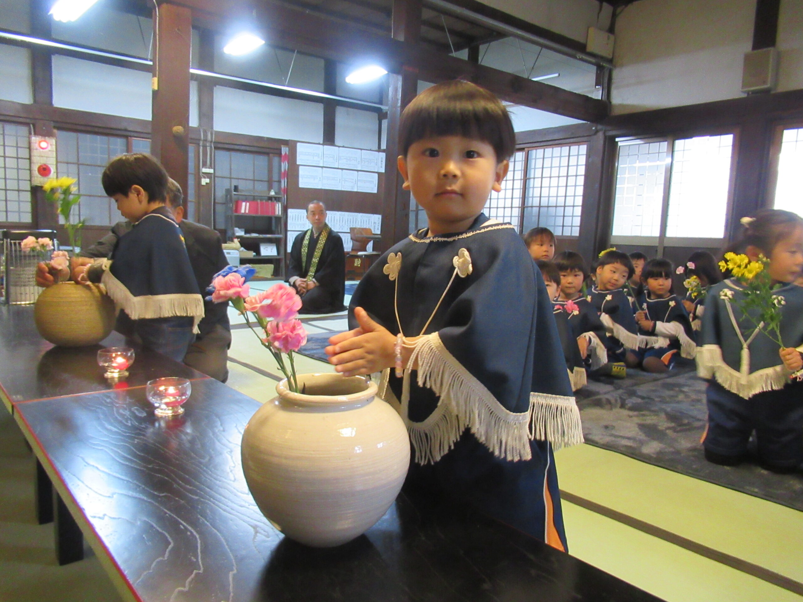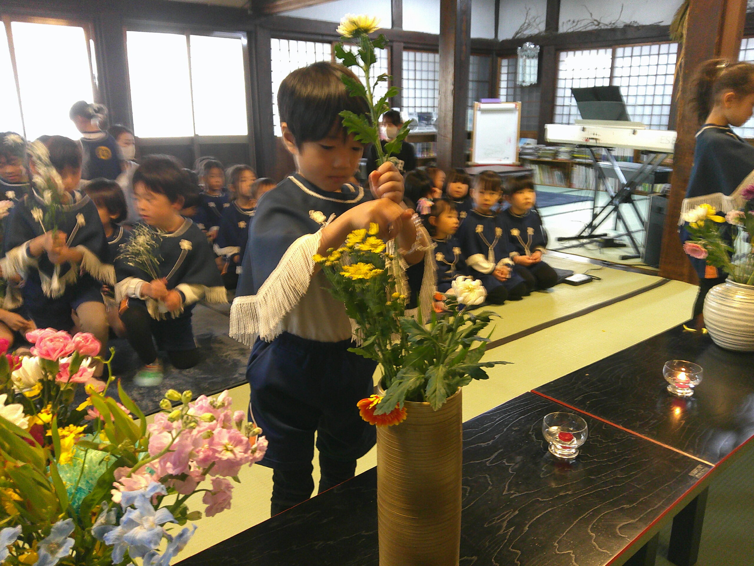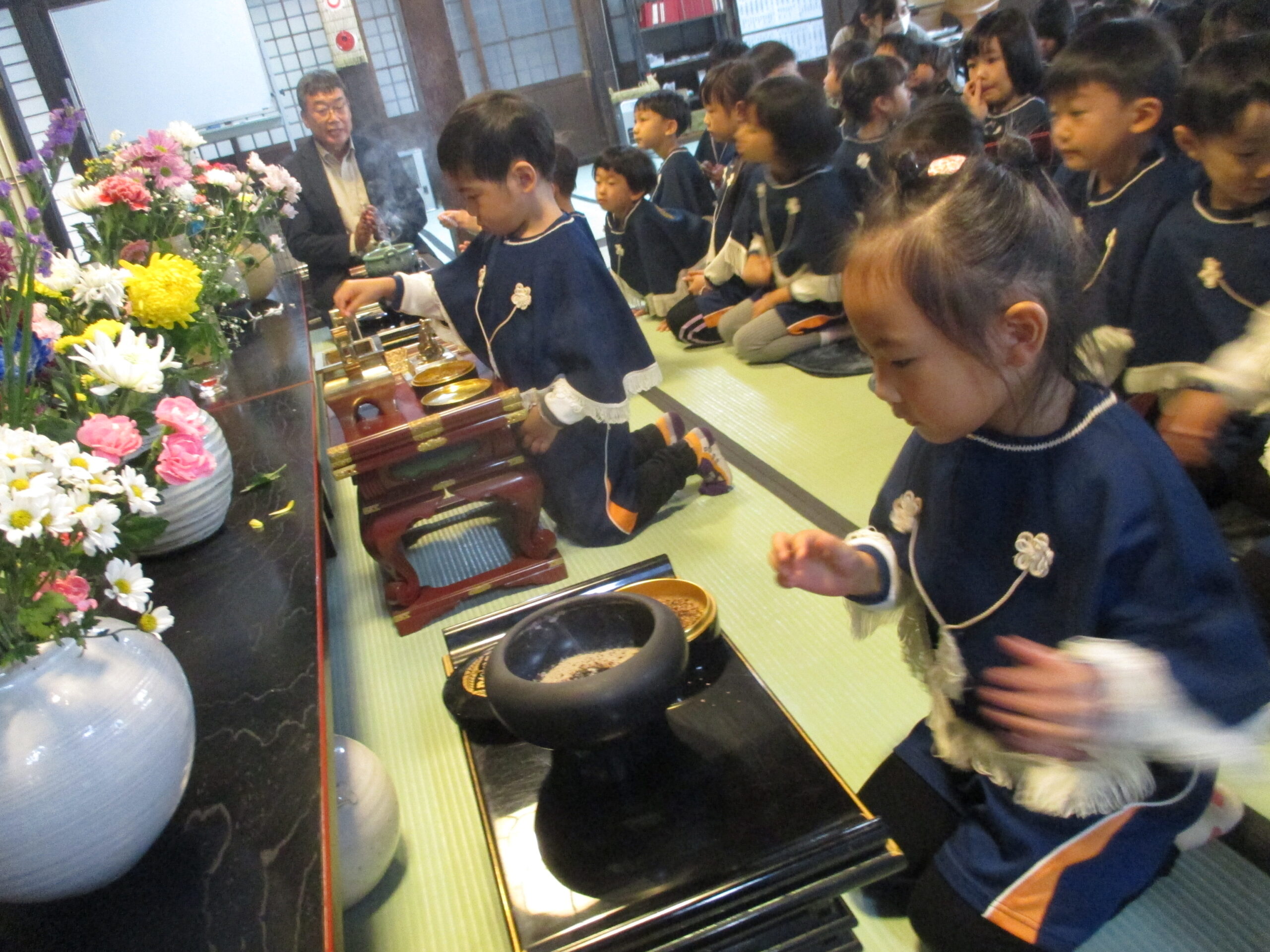 子ども報恩講に参加しました。お家から持ってきたきれいな花で献華をしたり、お焼香の仕方も教えてもらい真剣な表情でお焼香をしたりしました。住職さんの話もしっかり聞いていましたよ。