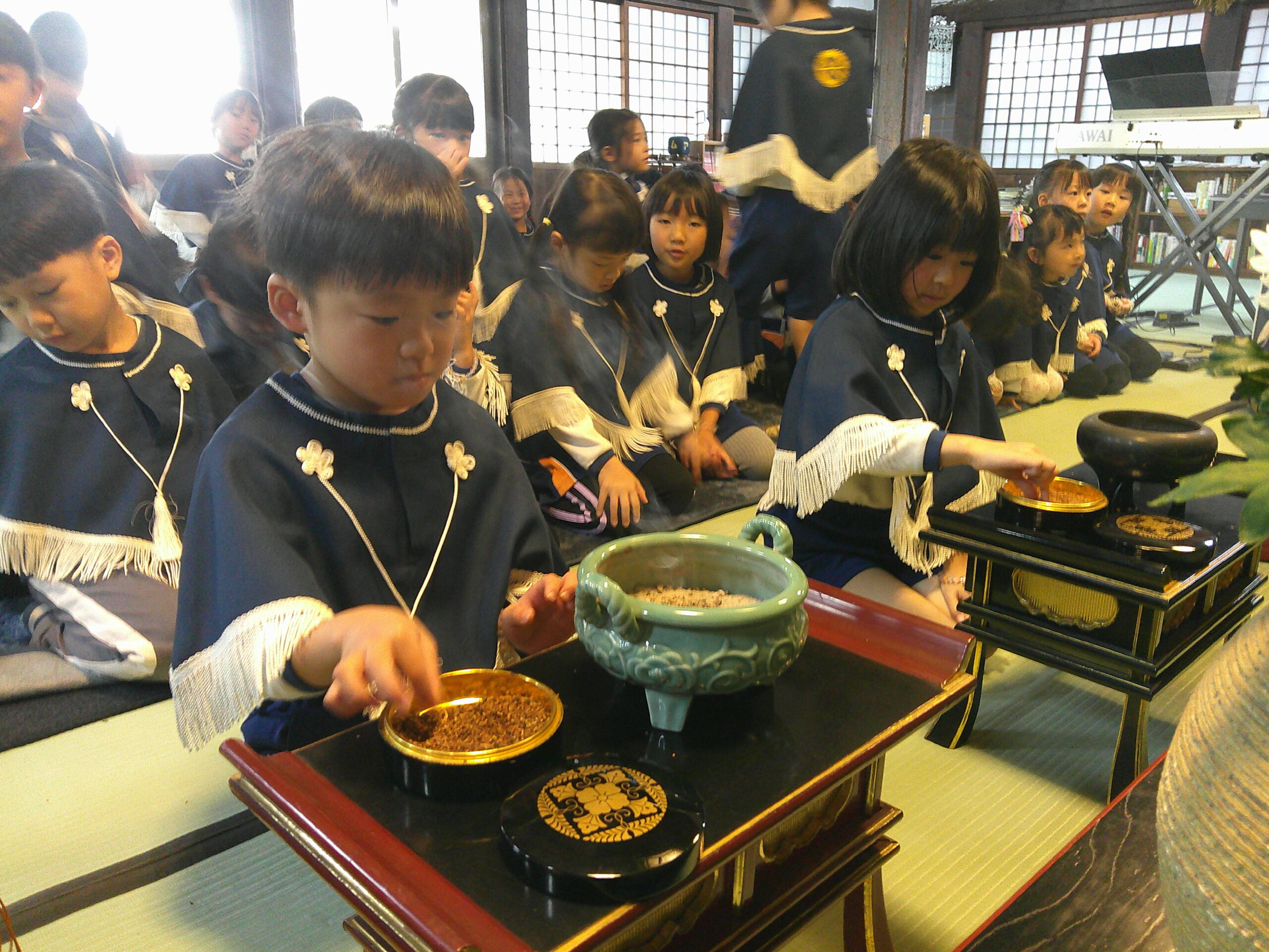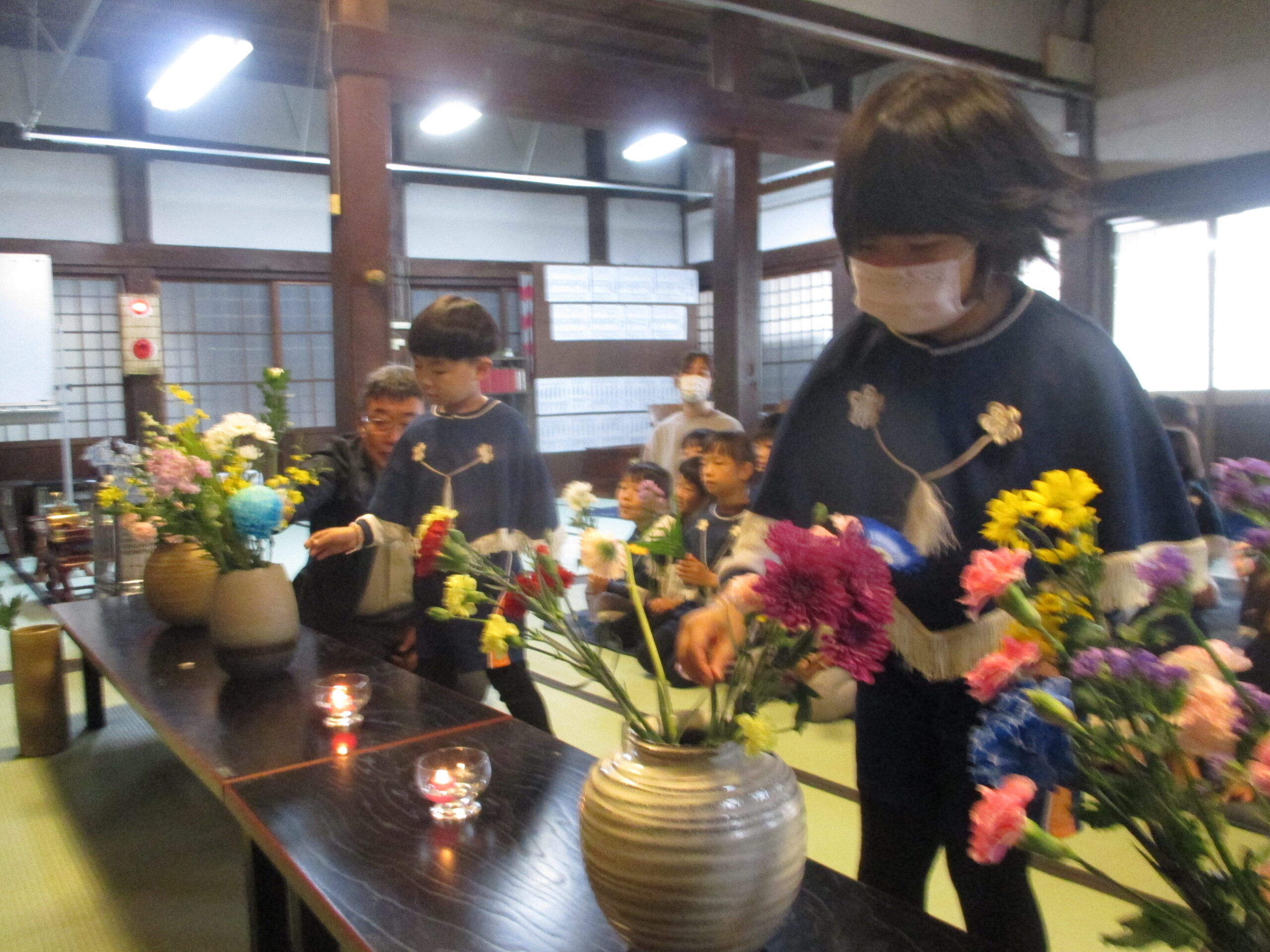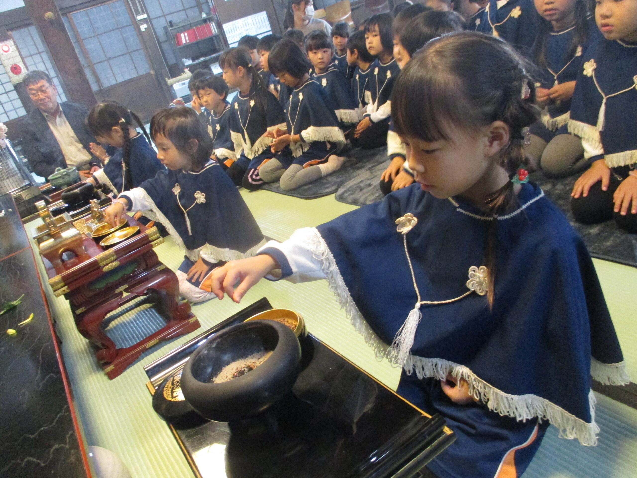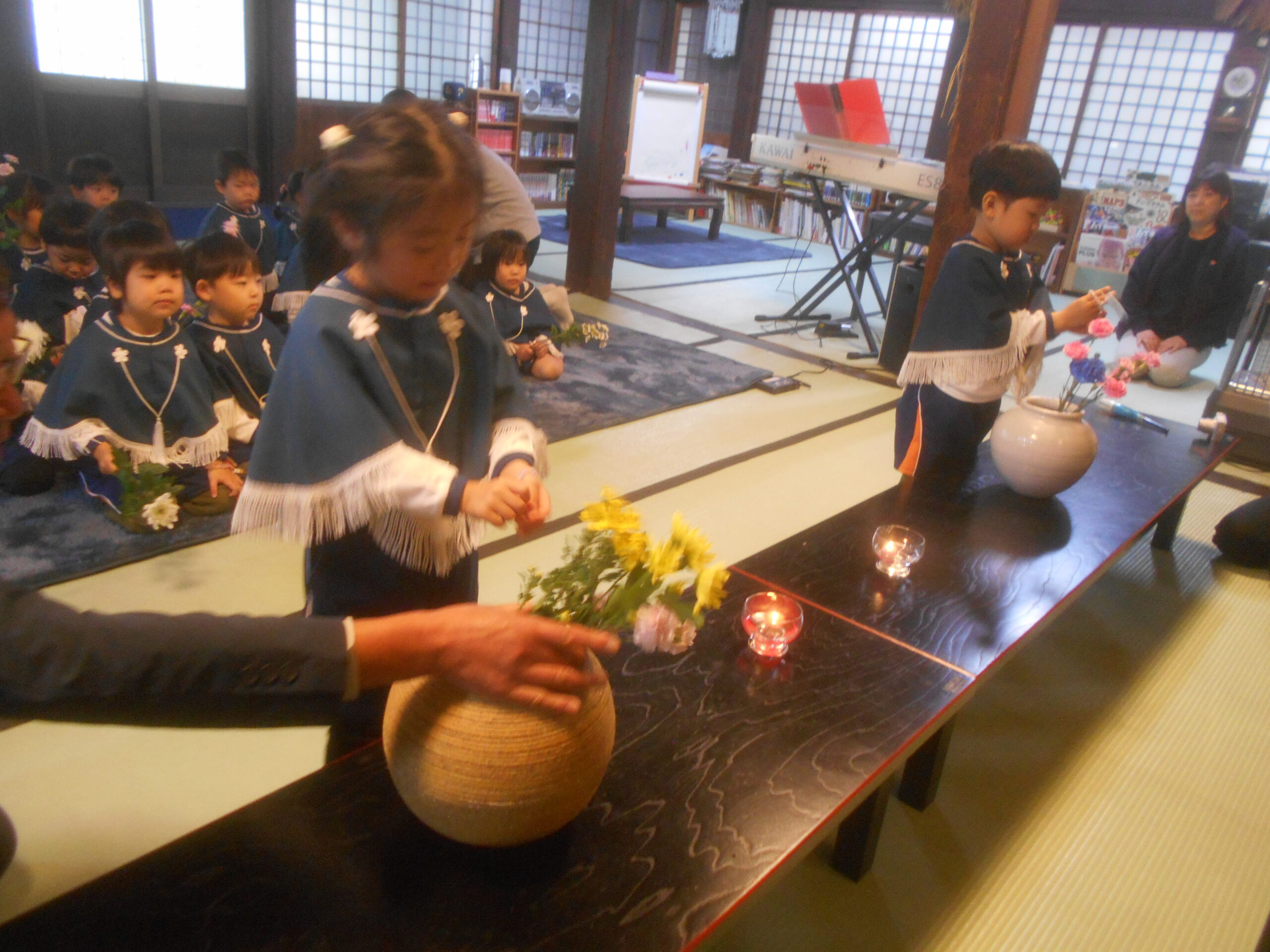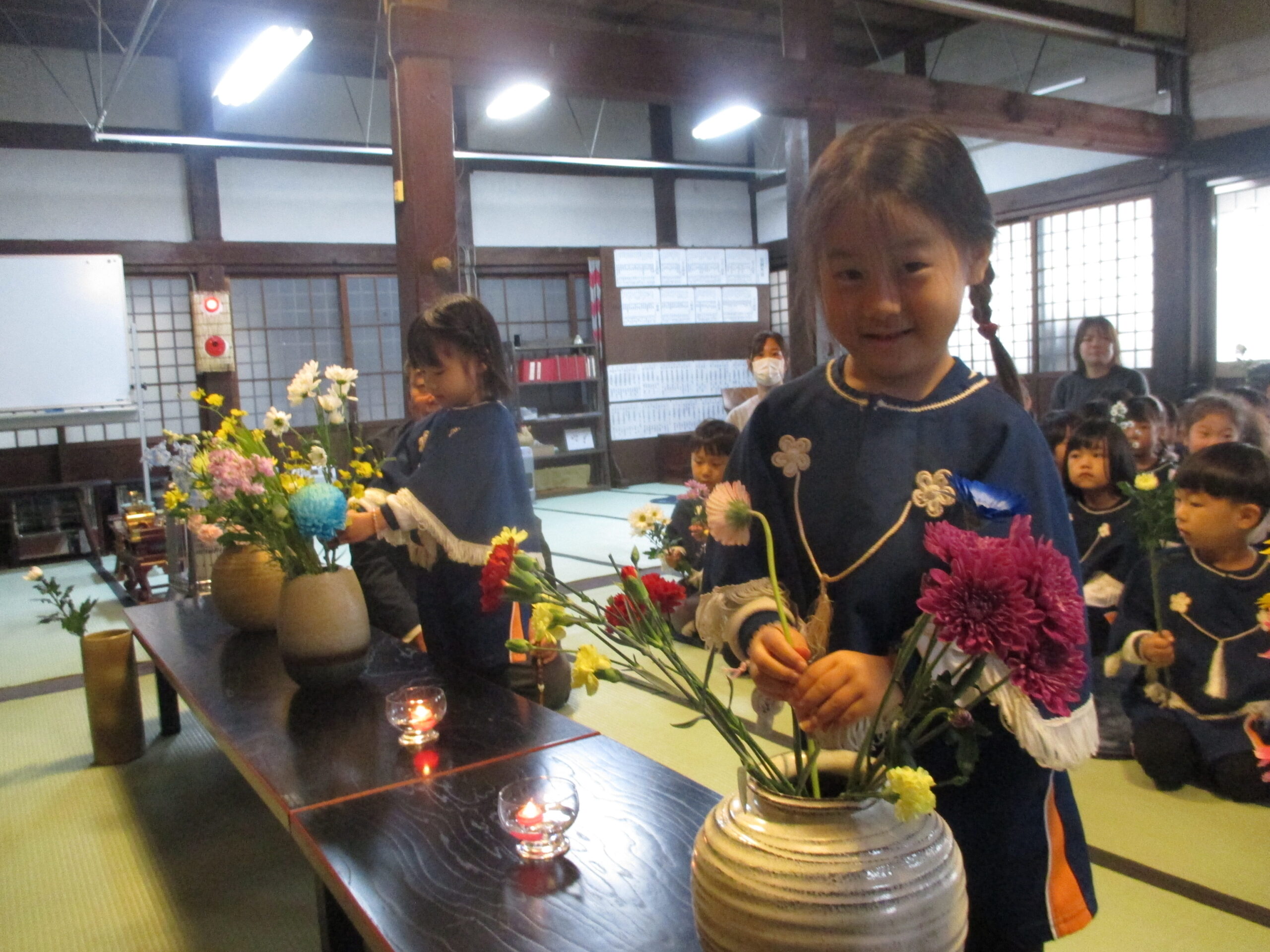子ども報恩講に参加しました。お家から持ってきたきれいな花で献華をしたり、お焼香の仕方も教えてもらい真剣な表情でお焼香をしたりしました。住職さんの話もしっかり聞いていましたよ。