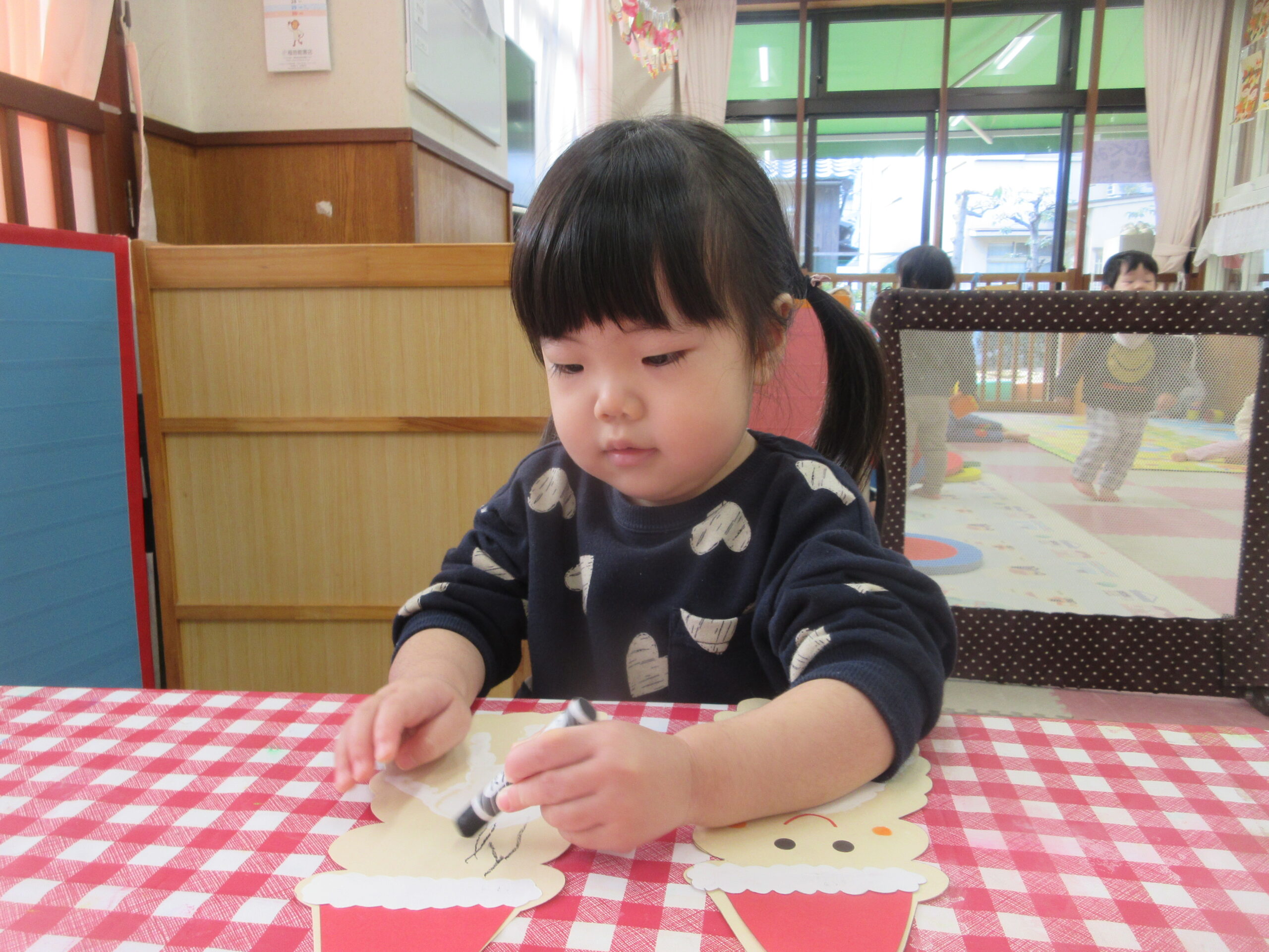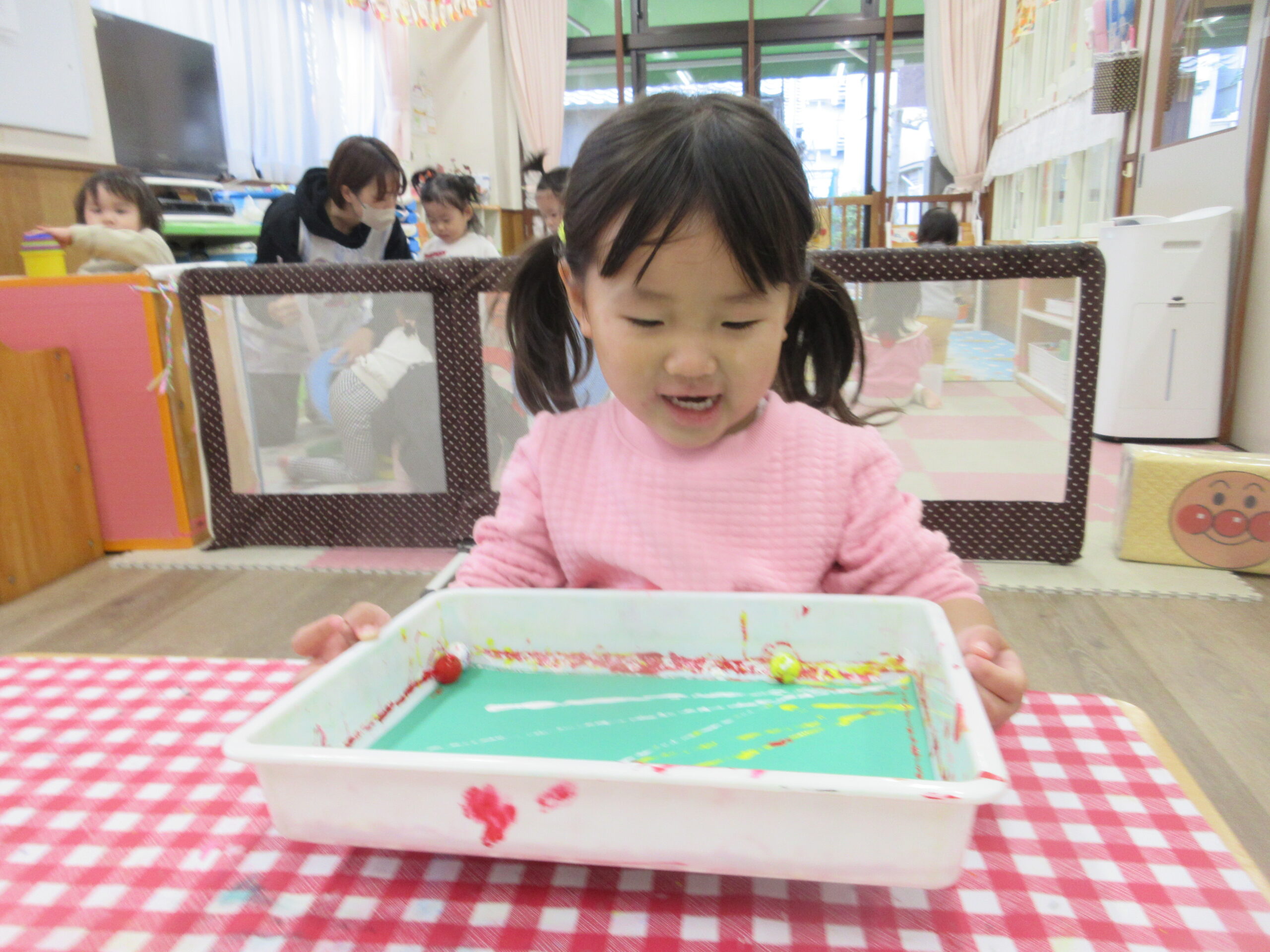 1歳児さんは、手形を取ってサンタクロースを作りました。クレパスで目と口を描き「プレゼントください!」とお願いする子もいました。ビー玉を転がして素敵なクリスマスツリーも完成しました☆彡