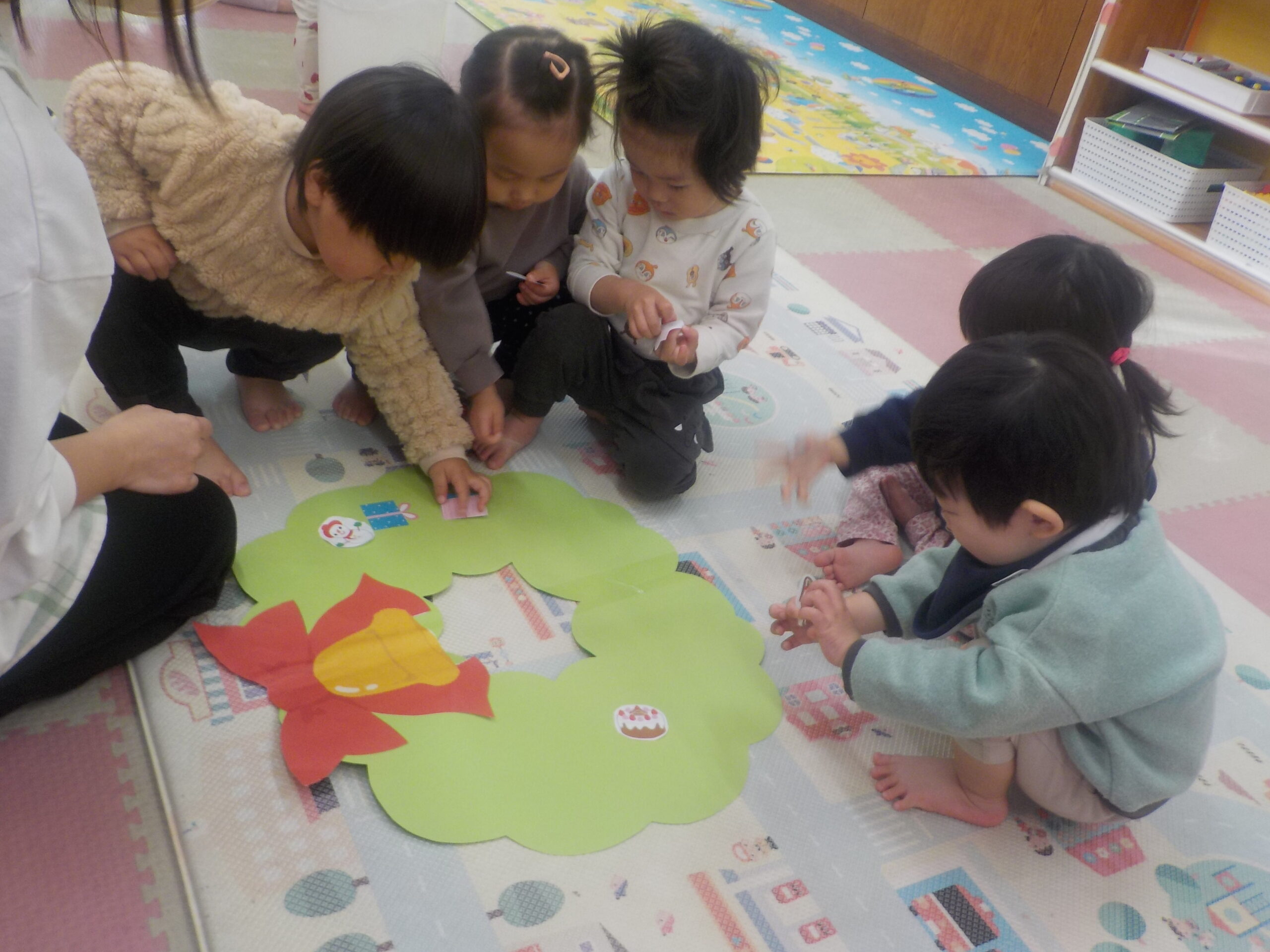みんなでシールを貼って大きなクリスマスツリーとリースを作りました!