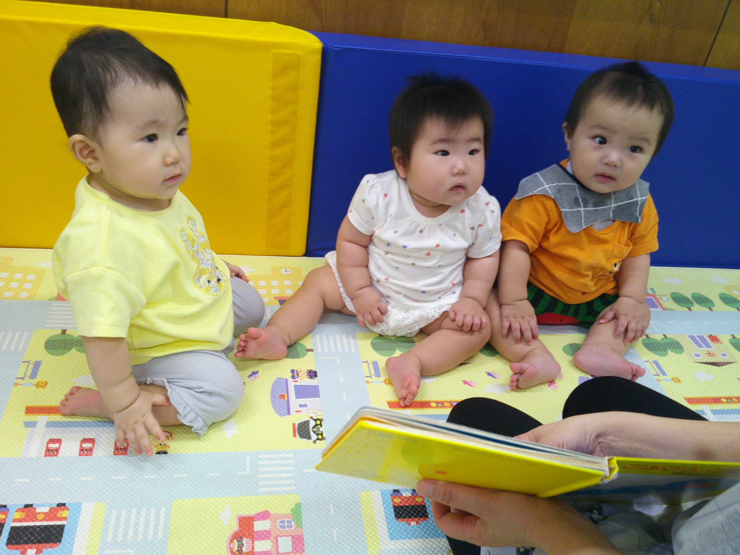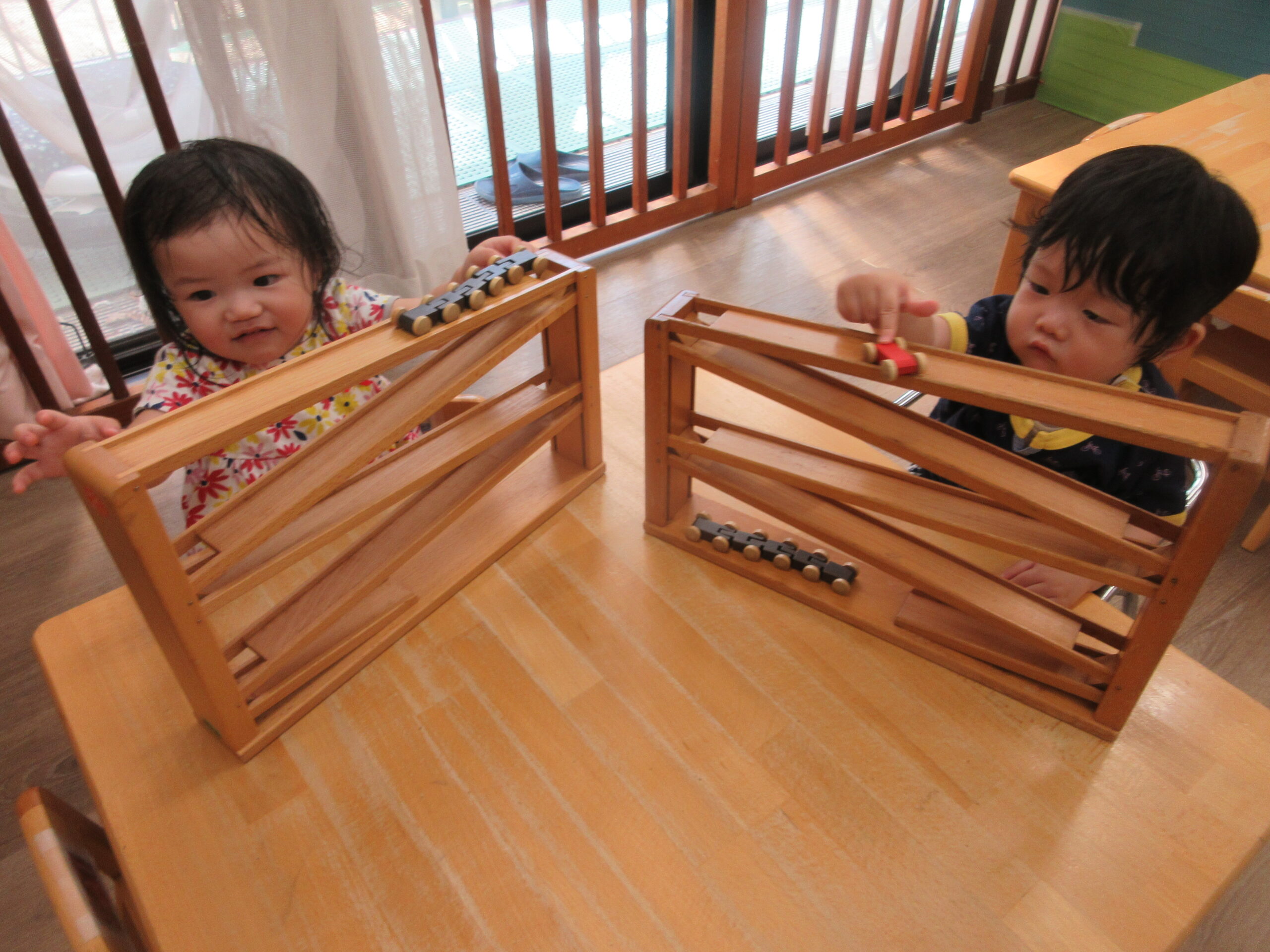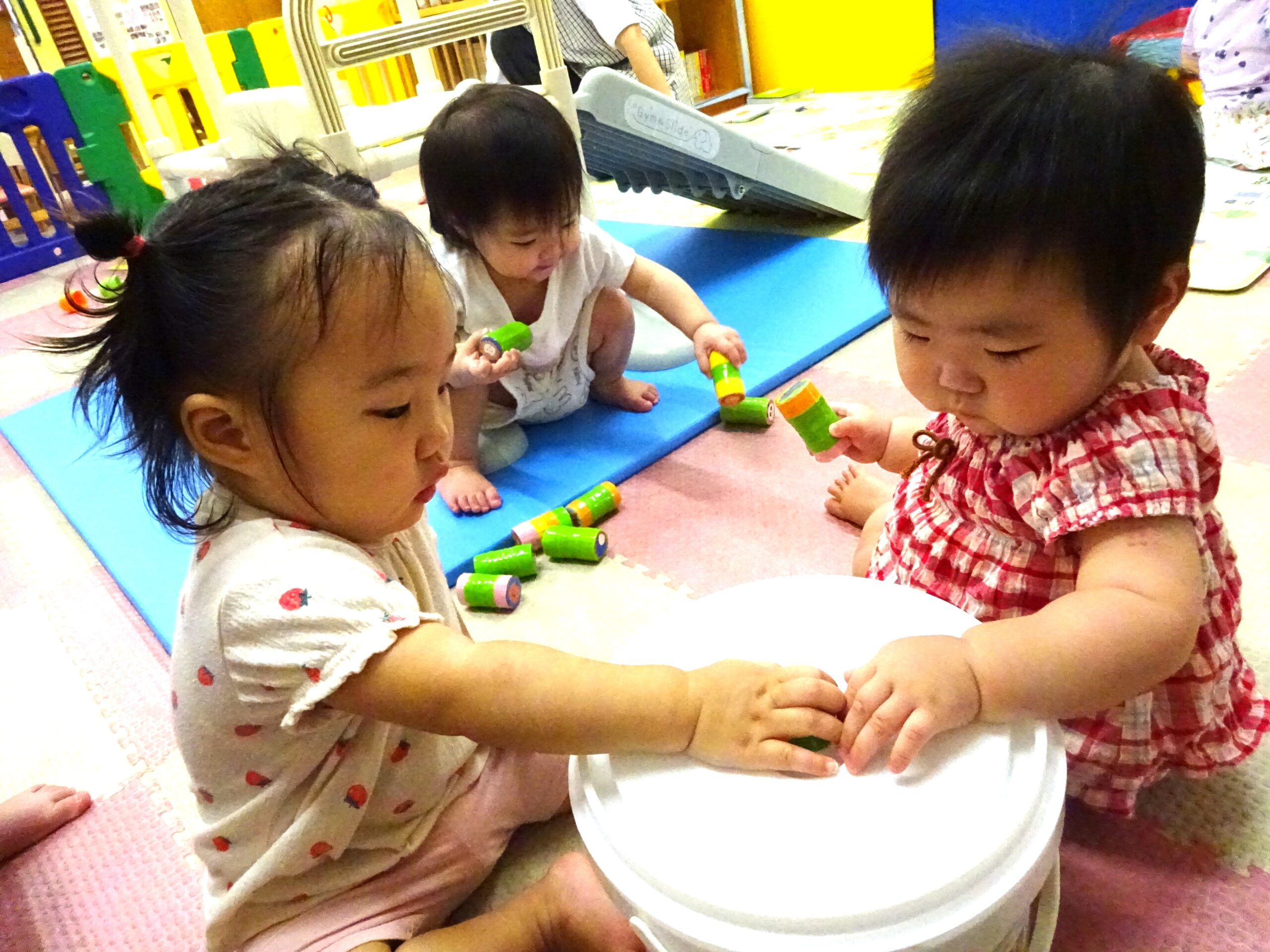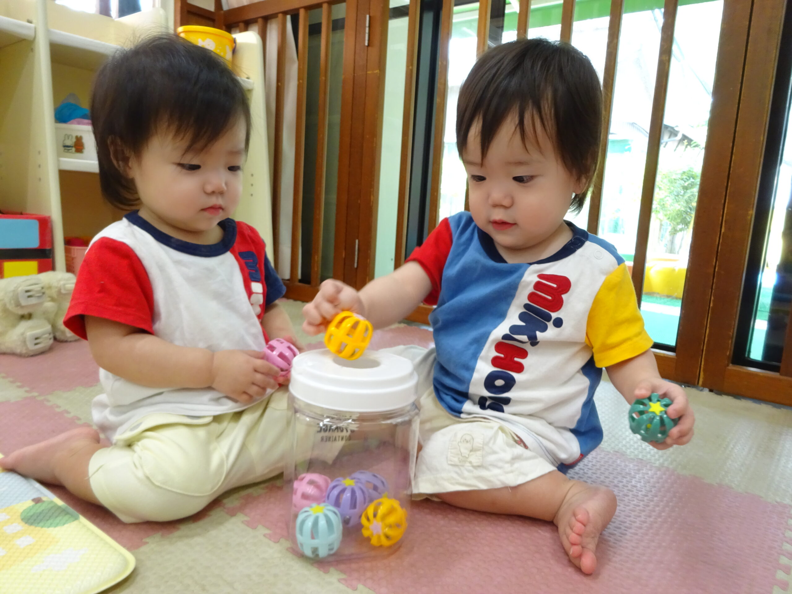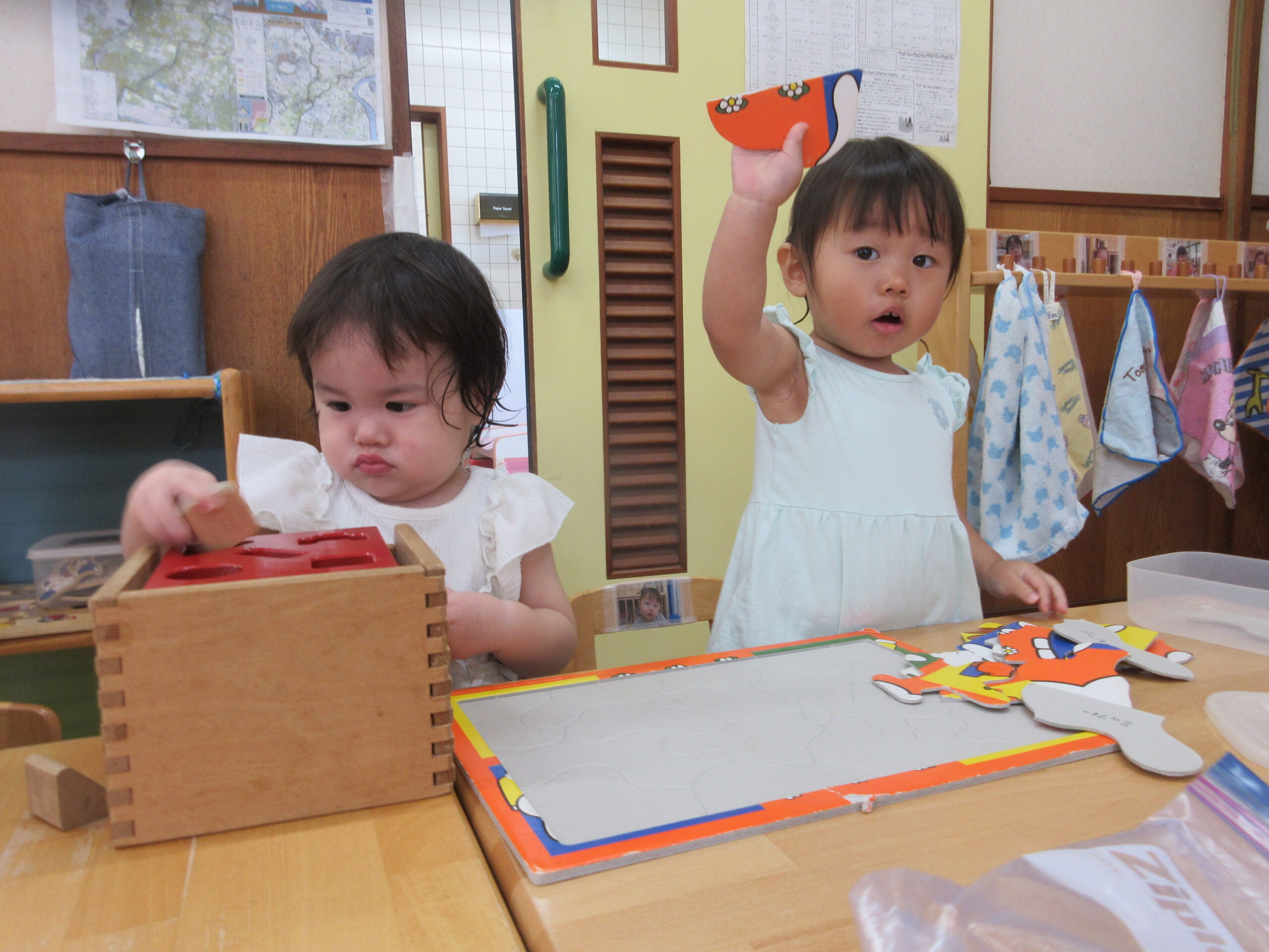 0歳児さんは、ポットン落としに挑戦しています。初めはなかなか上手にできない様子も見られましたが、すぐコツを掴み何度も楽しんでいます。また、絵本にも興味が芽生えはじめからおわりまでじっくり見られるようになりました。