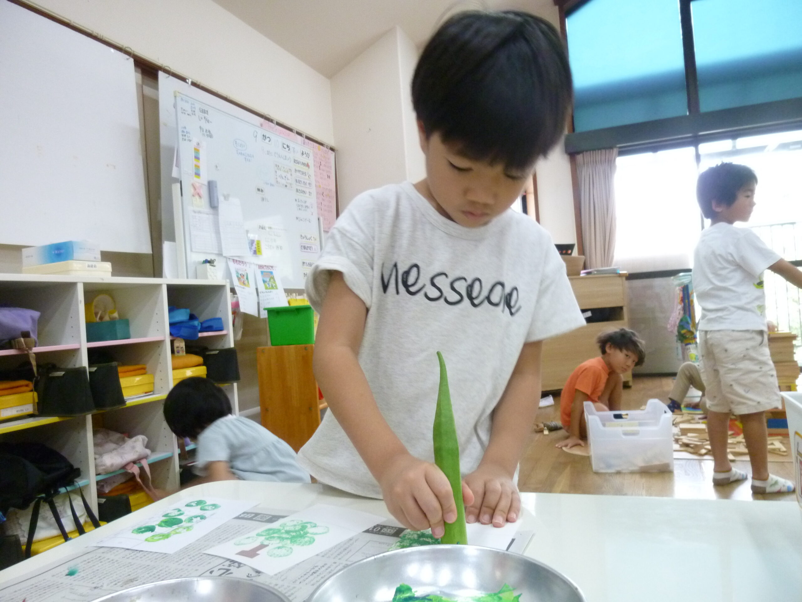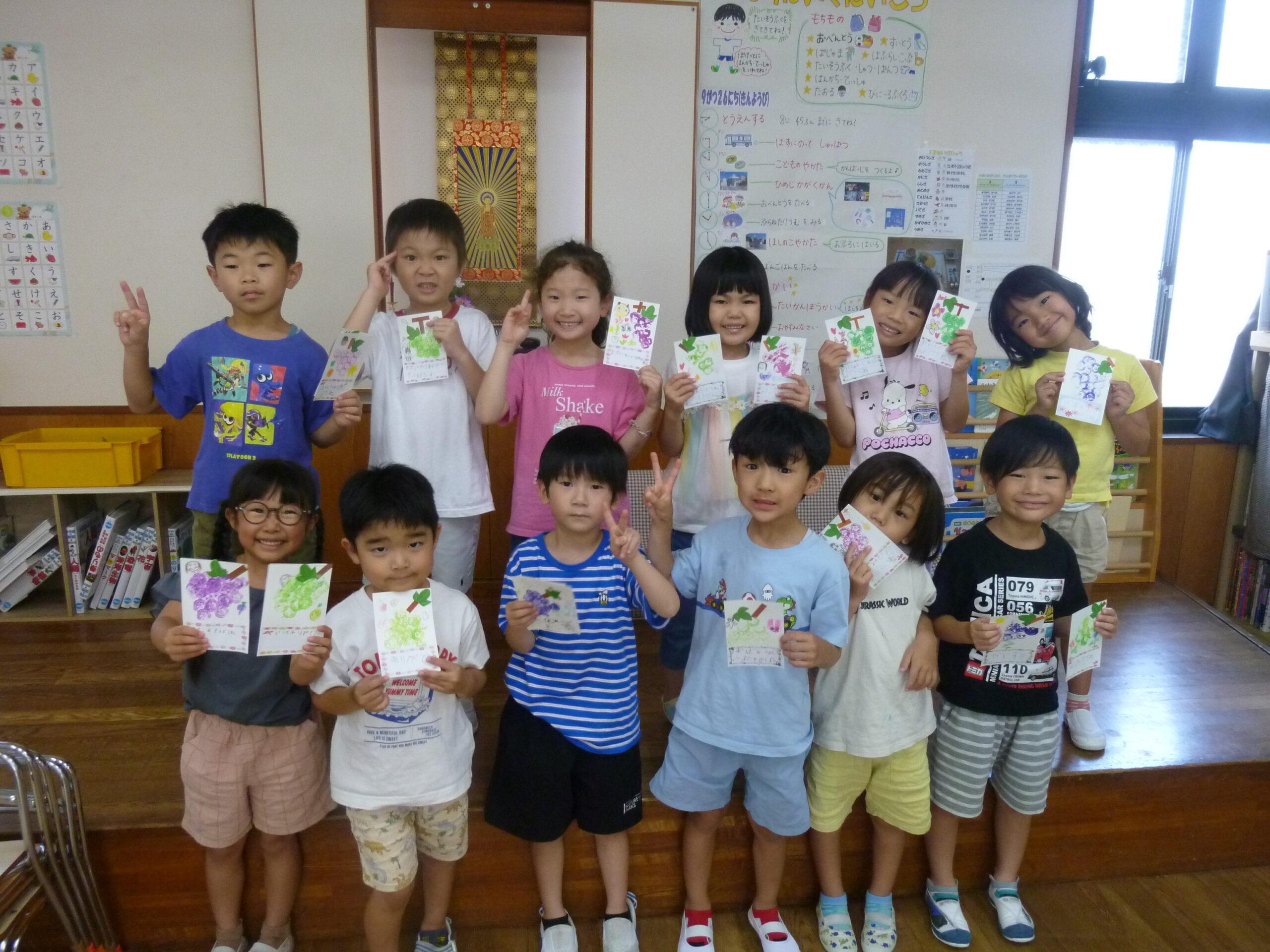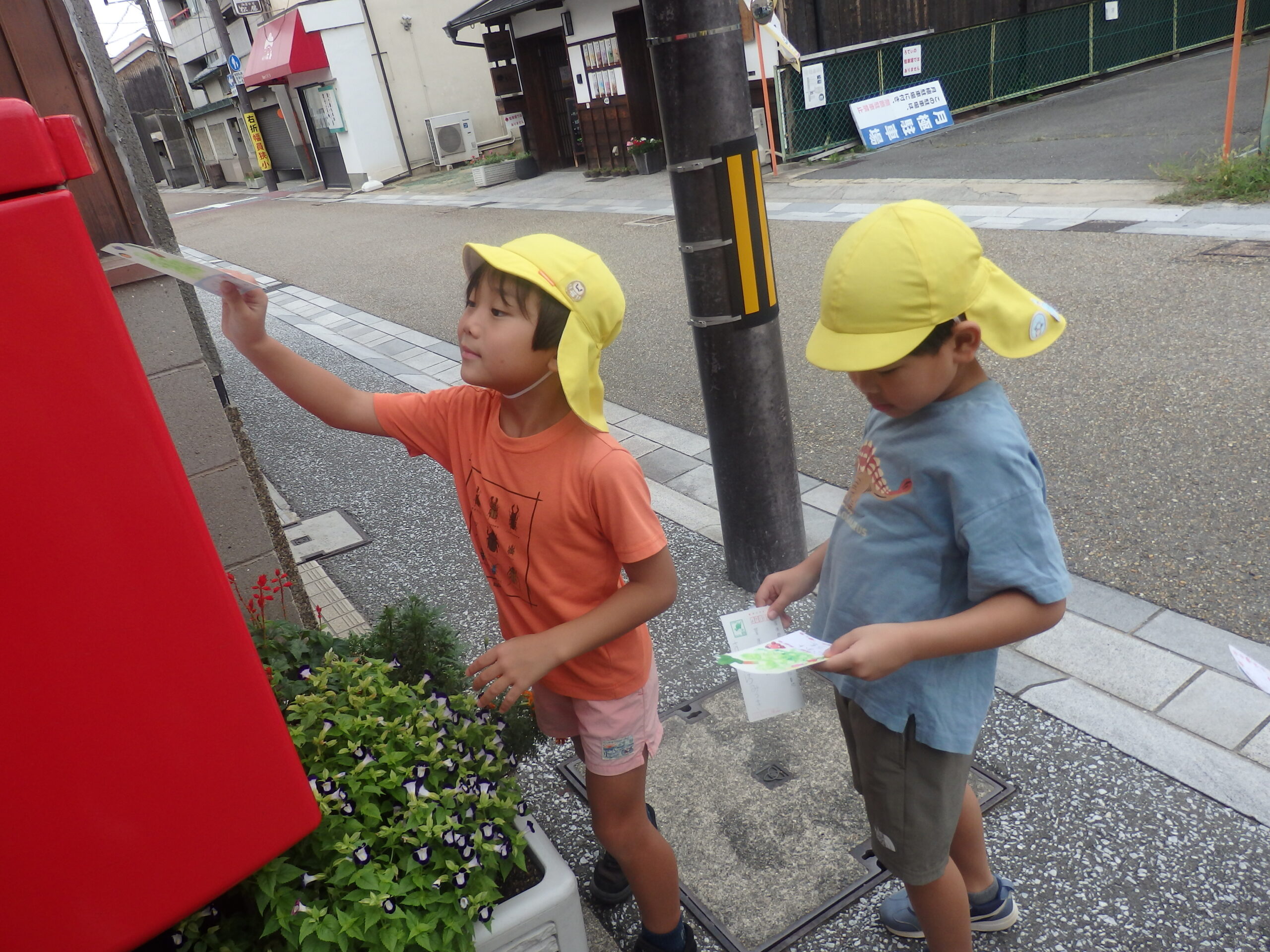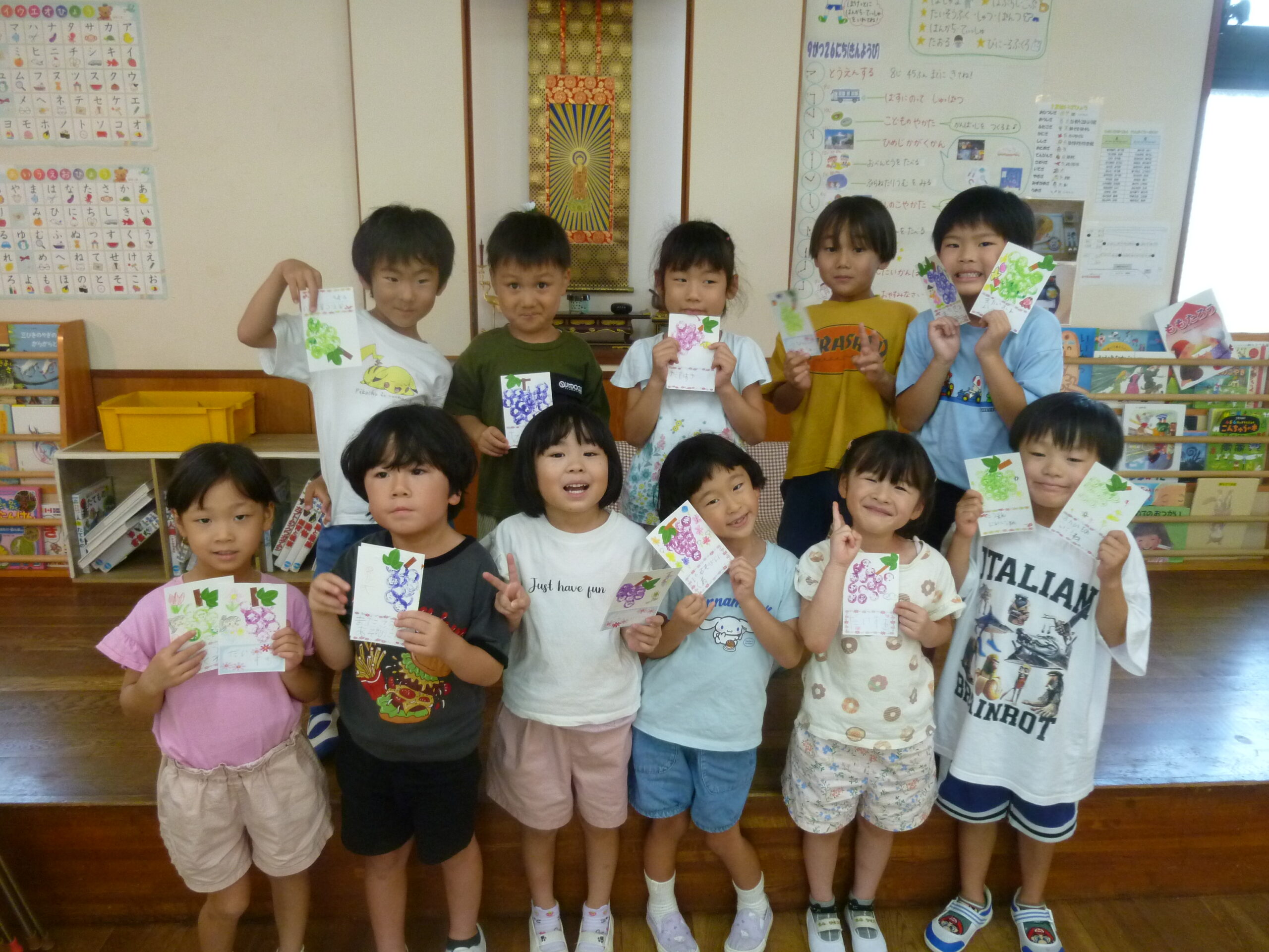 敬老の日にちなみ、おじいちゃん、おばあちゃんにハガキを作りました。自分たちで収穫したオクラをスタンプして、ぶどうを作りメッセージを書きました!完成すると、ポストに投函しに行き、「喜んでくれるかなー?」とワクワクした様子でした★
