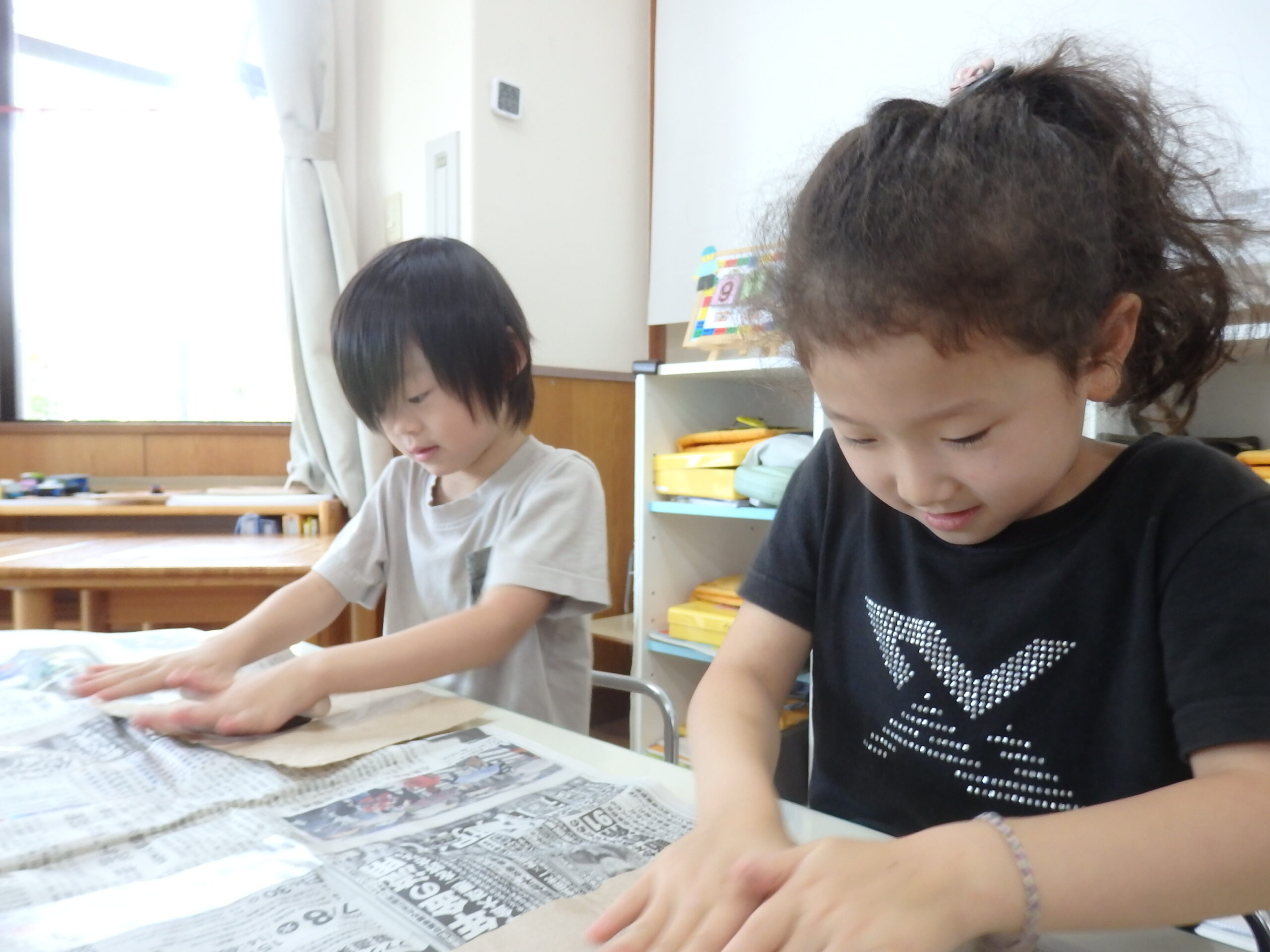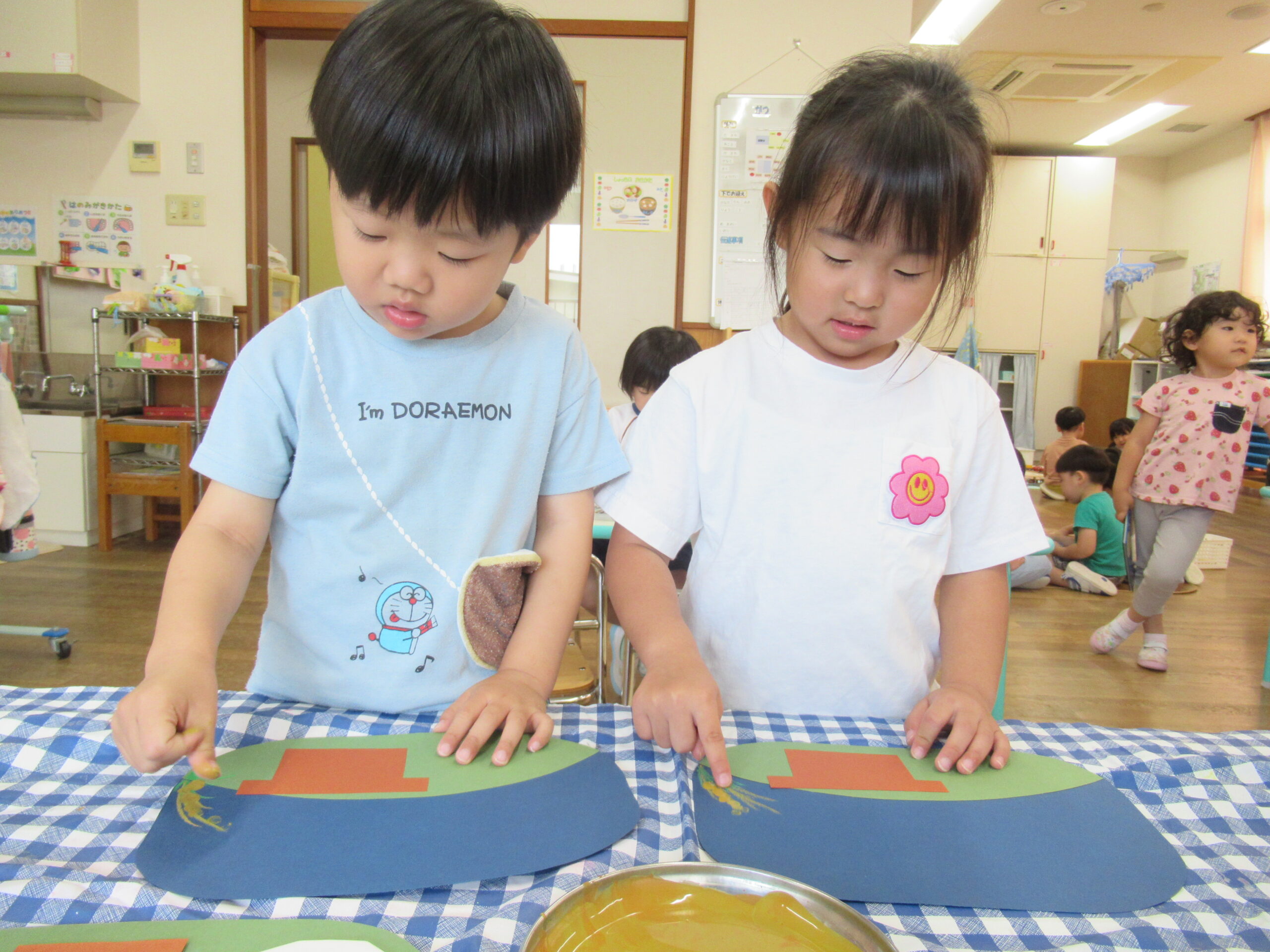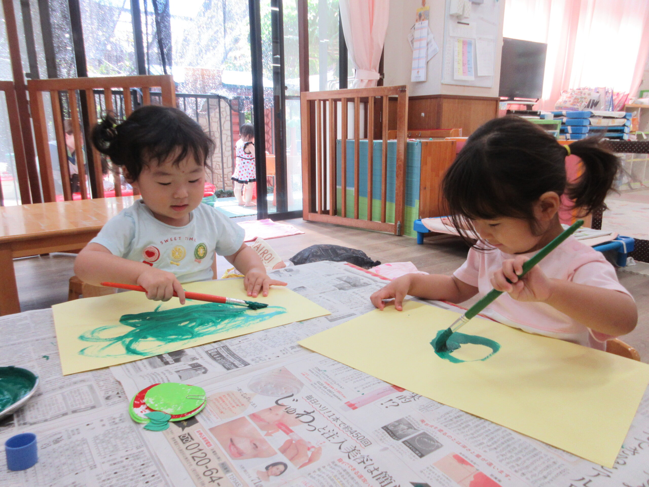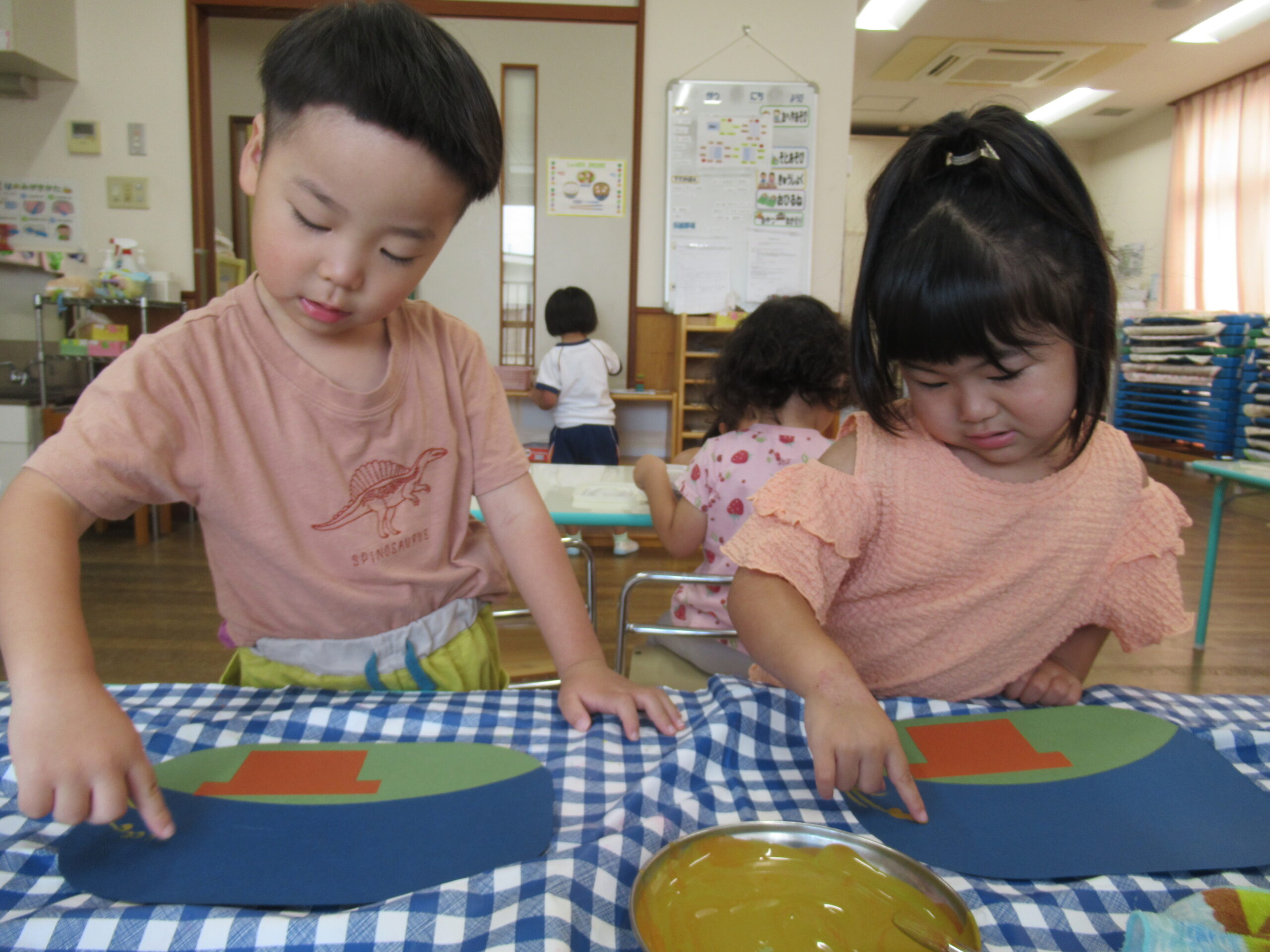 敬老の日にちなみ、おじいちゃん、おばあちゃんにハガキを作りました。自分たちで収穫したオクラをスタンプして、ぶどうを作りメッセージを書きました!完成すると、ポストに投函しに行き、「喜んでくれるかなー?」とワクワクした様子でした★