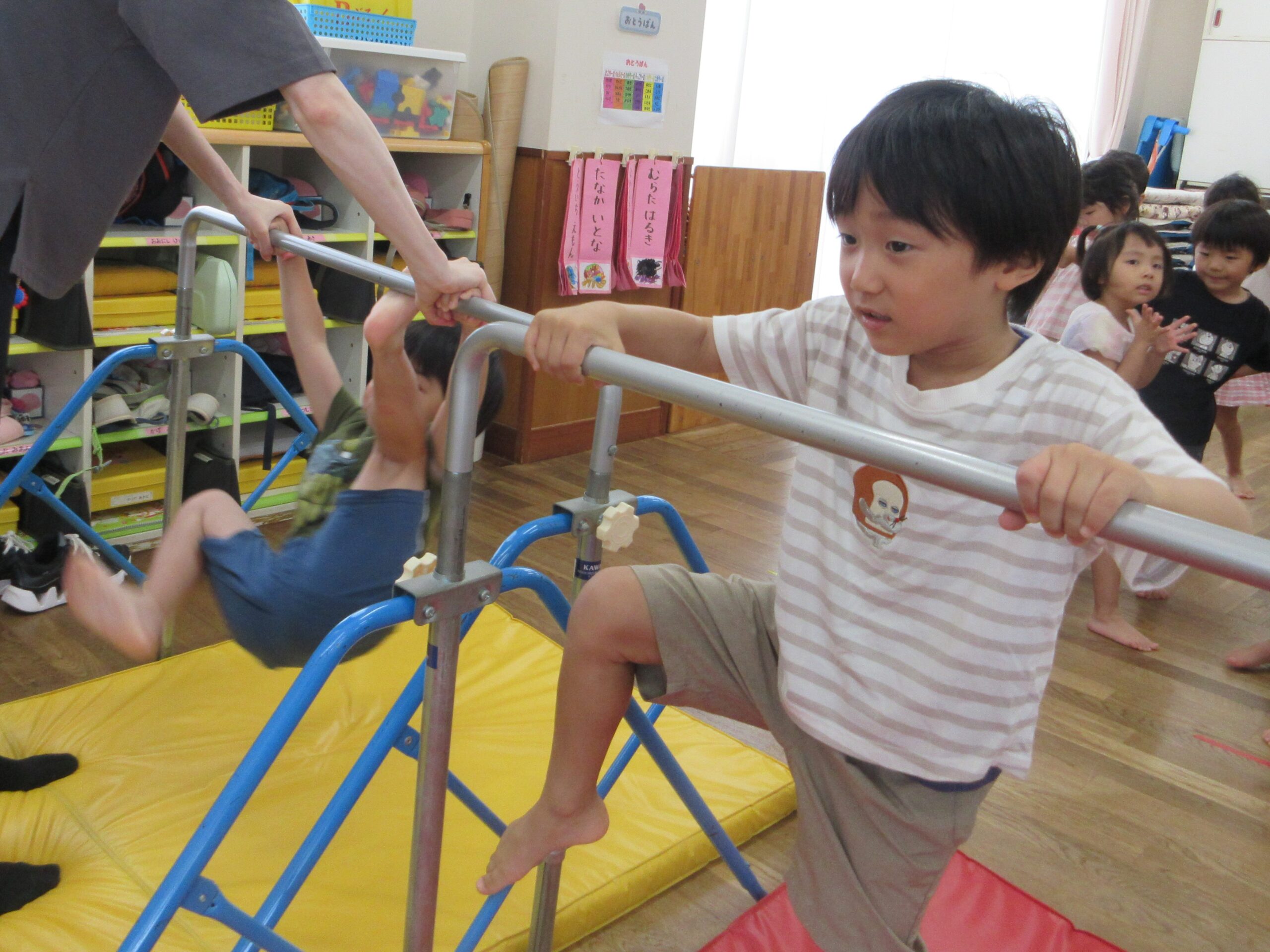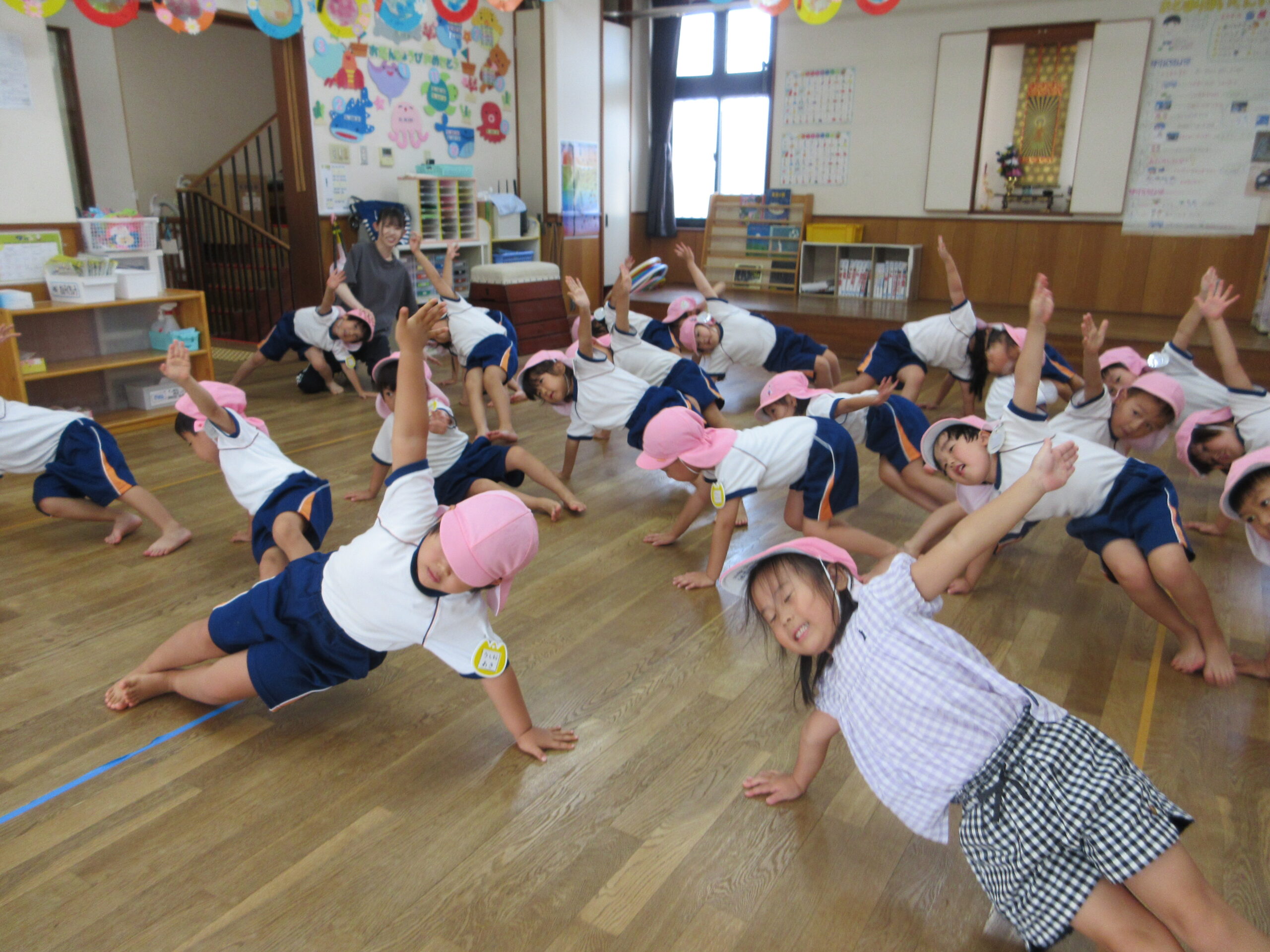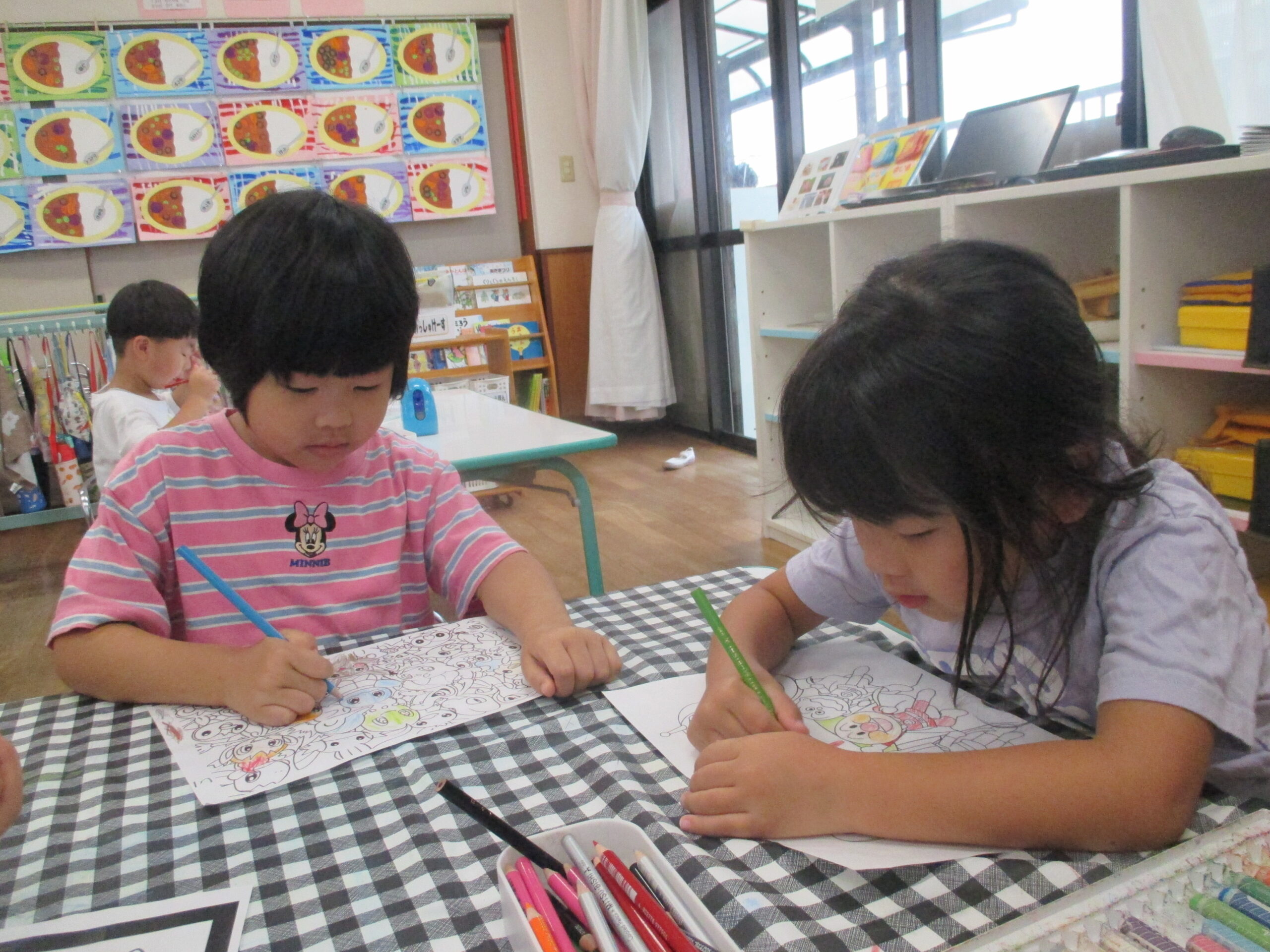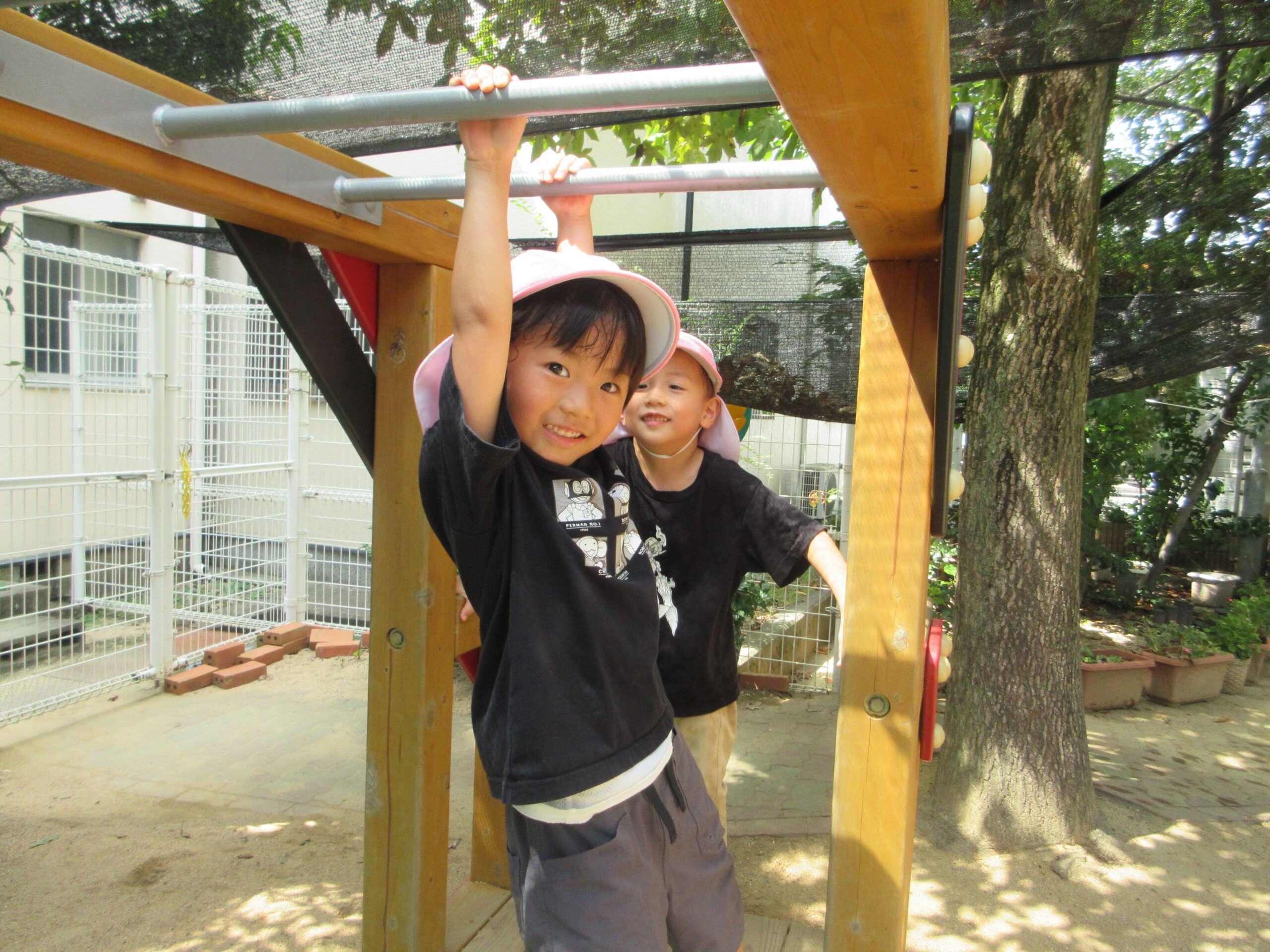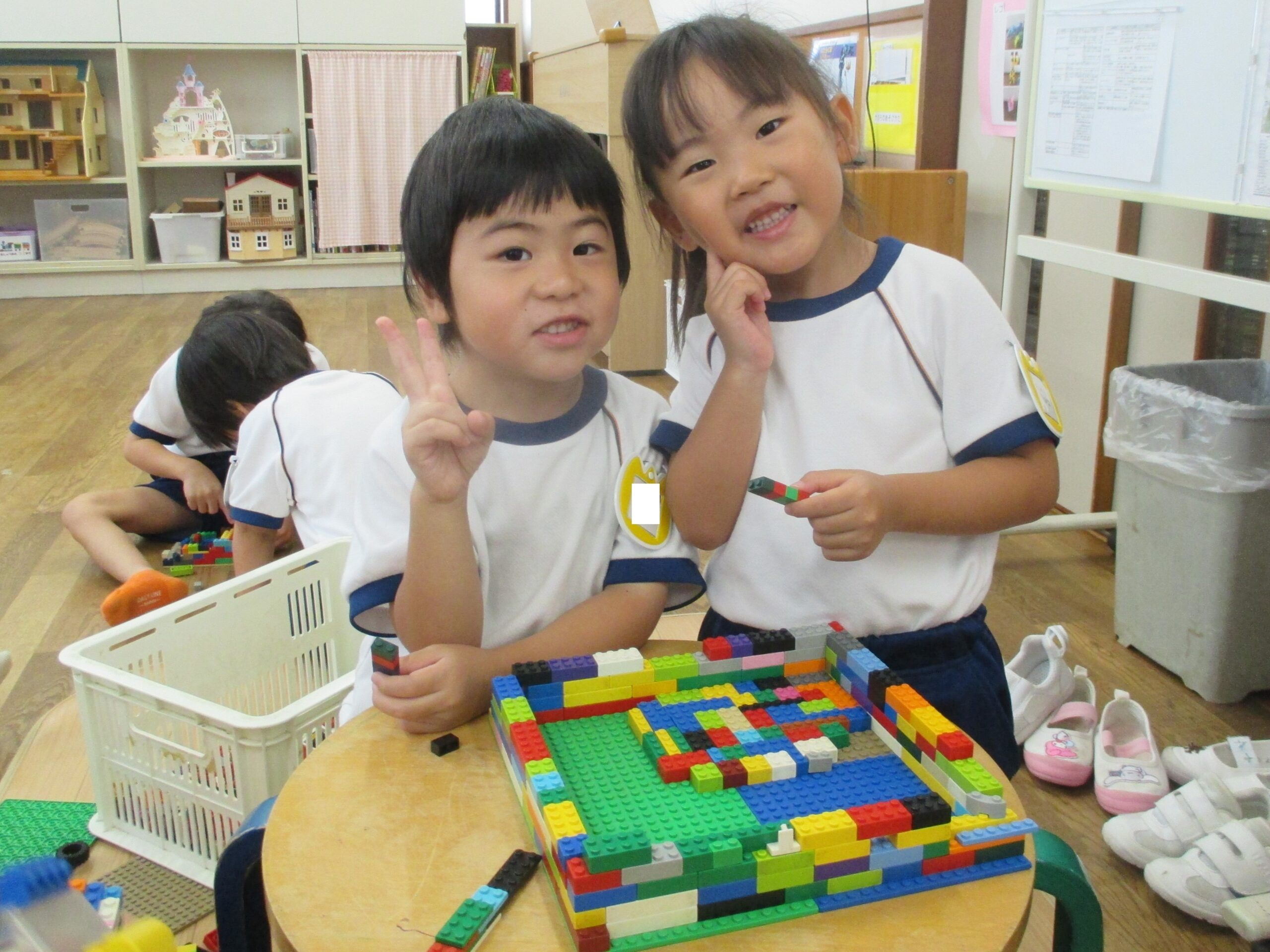 まだまだ暑い日が続いていますが、季節は段々と秋に近づいてきました。スポーツの秋・芸術の秋など、“○○な秋”にちなんで元気いっぱいの子どもたちと様々なことに取り組んでいます☆運動遊びでは、鉄棒やうんていはそれぞれの目標達成に向けて頑張っています。難しかったことも諦めず自分から何度も挑戦する姿が見られます。室内遊びでは、レゴブロックや塗り絵など友達と一緒に作ったり一人で集中して取り組んだりして楽しんでいます♬