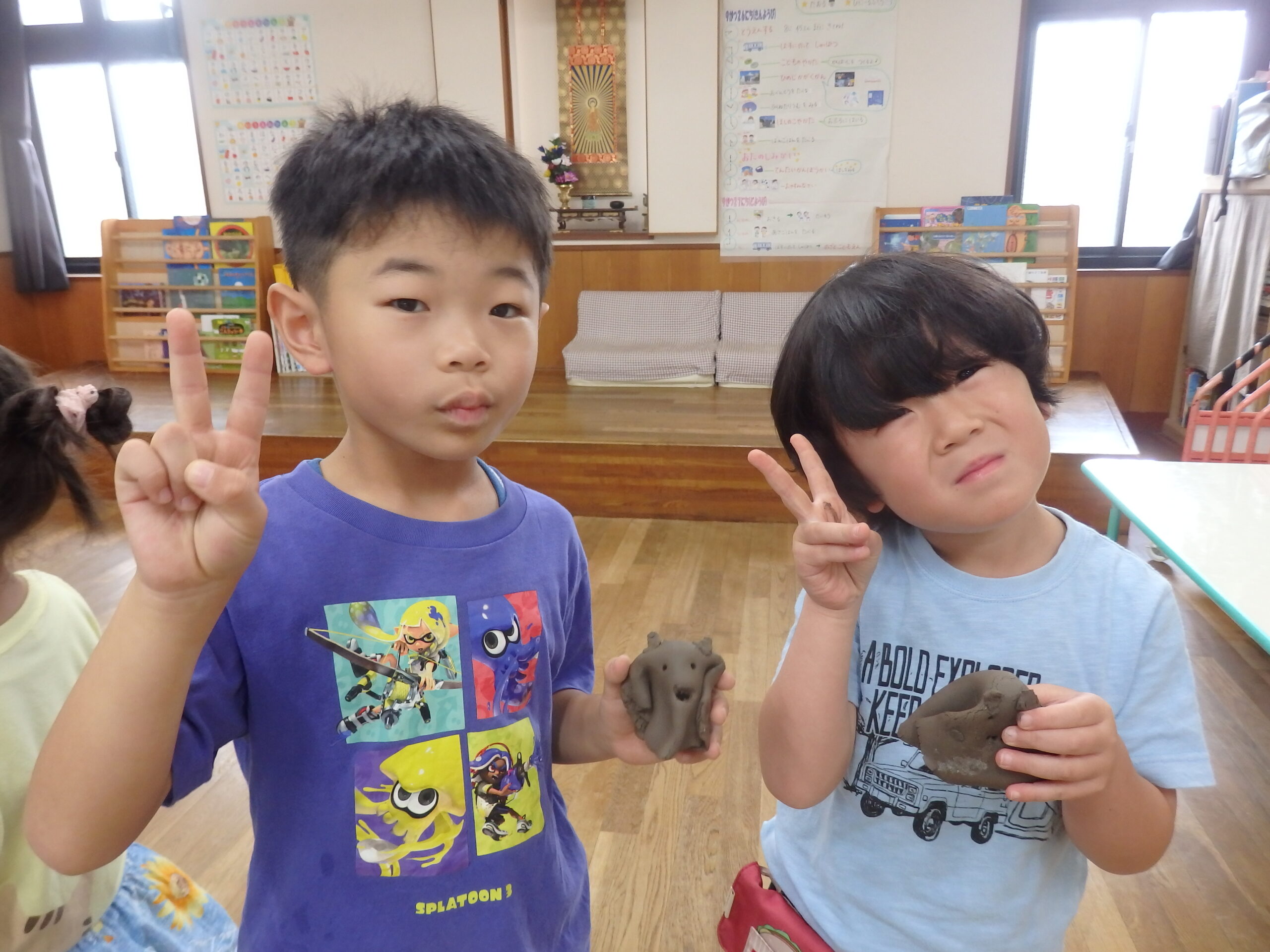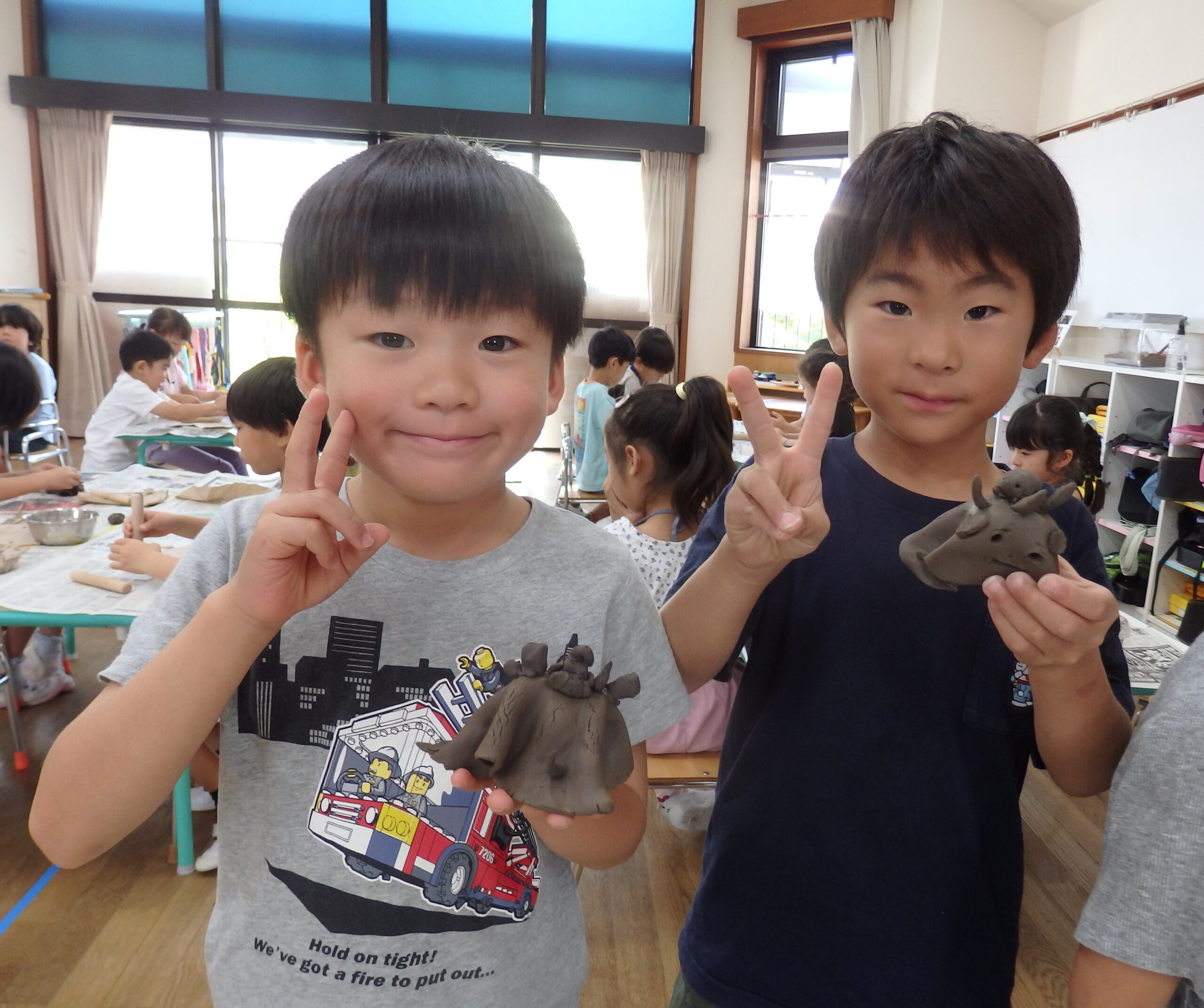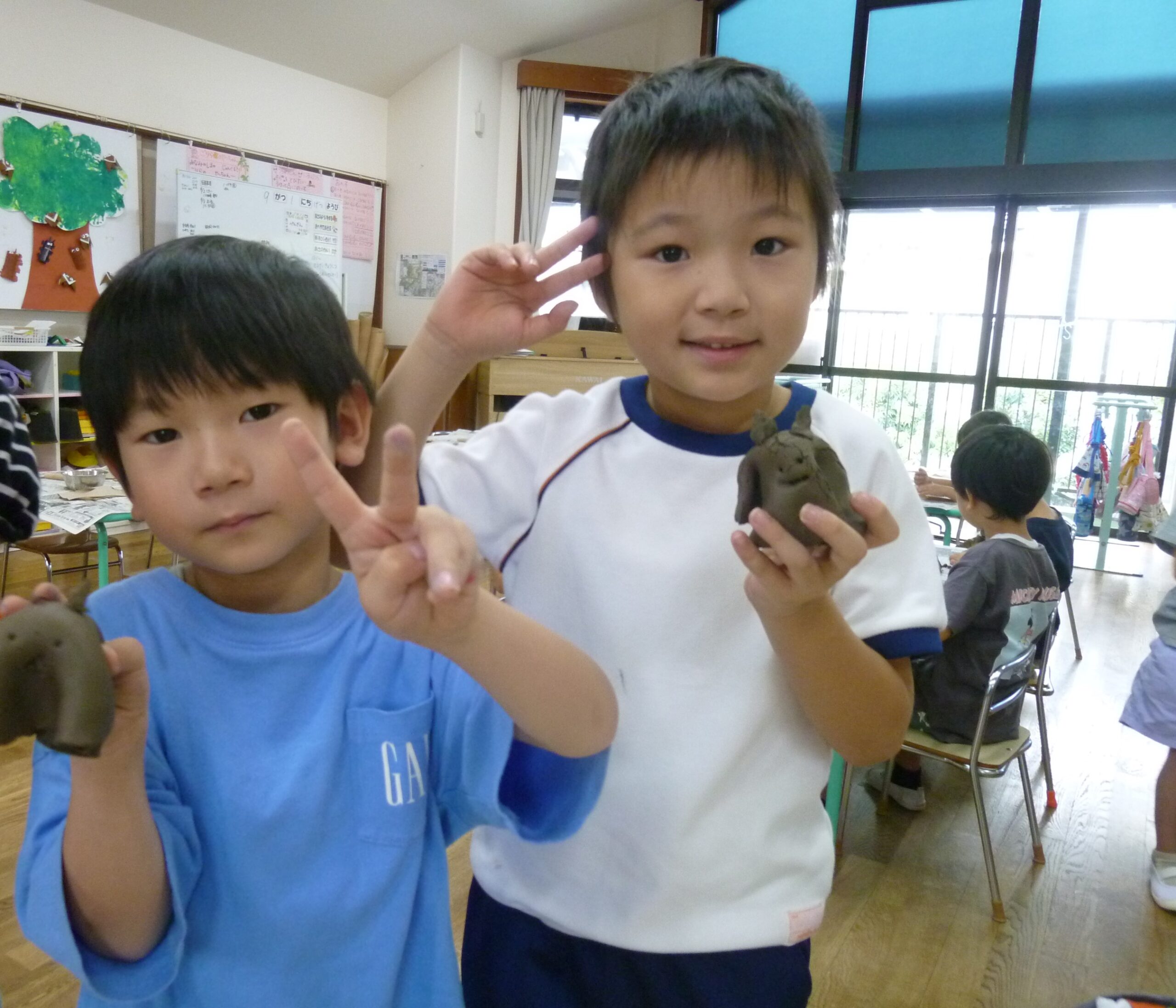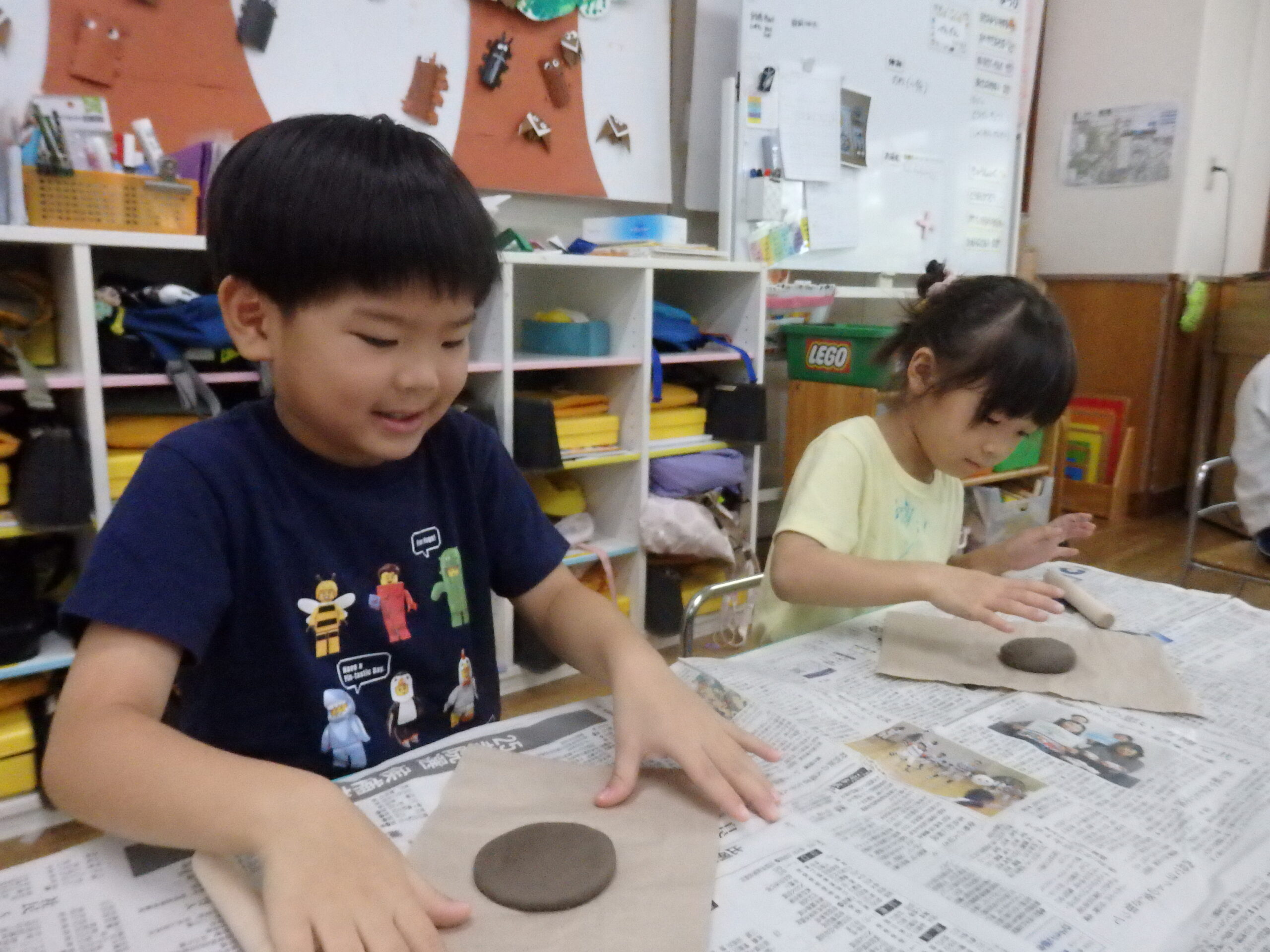 陶芸教室に参加しました。手やめん棒を使って、陶芸用粘土を平たく伸ばしておばけの形を成形しました。パン職人さながら、叩いたり伸ばしたりと粘土の感触を楽しむ子どもたち。「可愛いおばけできたー!」と完成を喜んでいました!ジュリアン先生に焼いてもらい、次回の色塗りを心待ちにしています♪