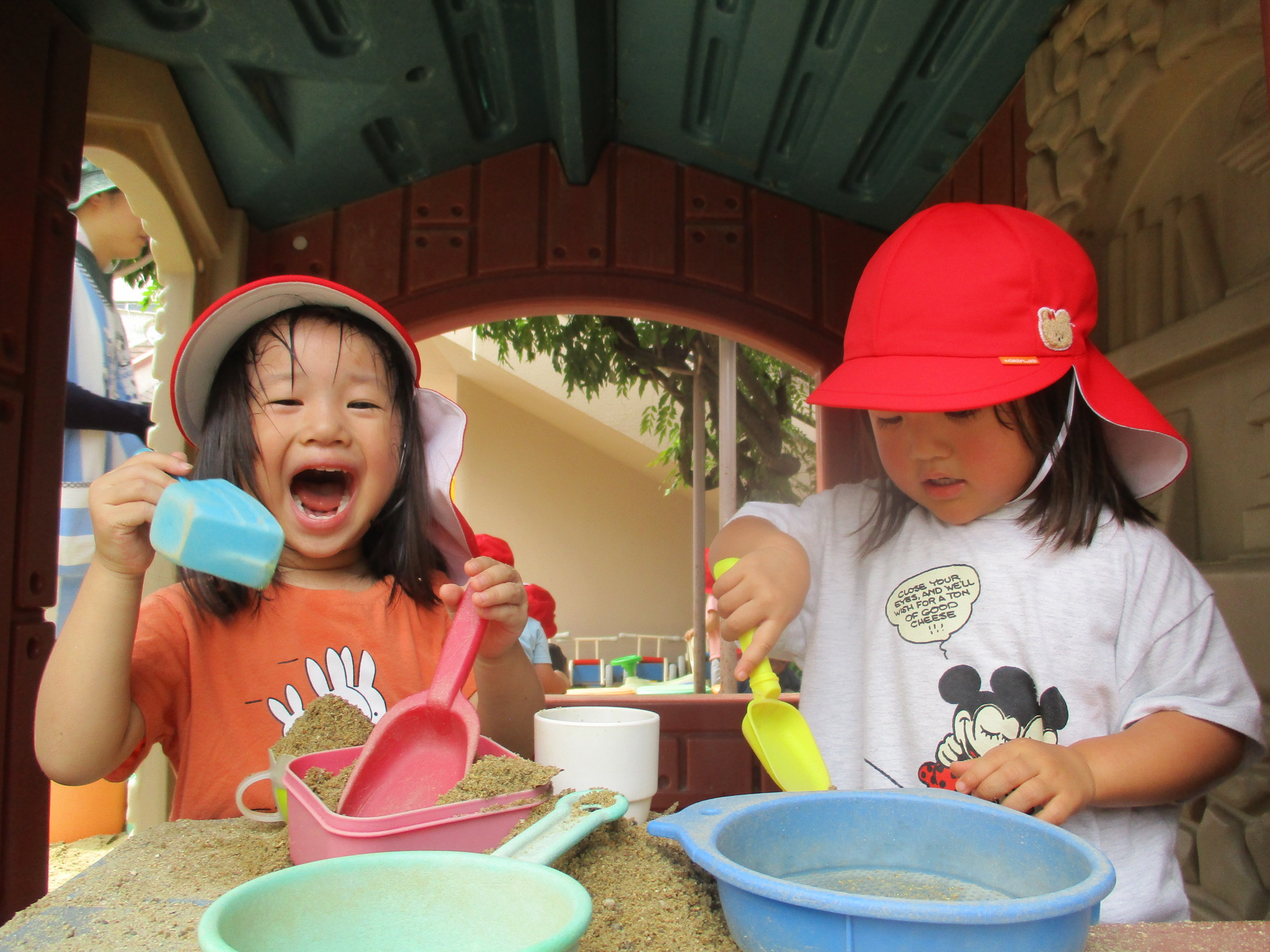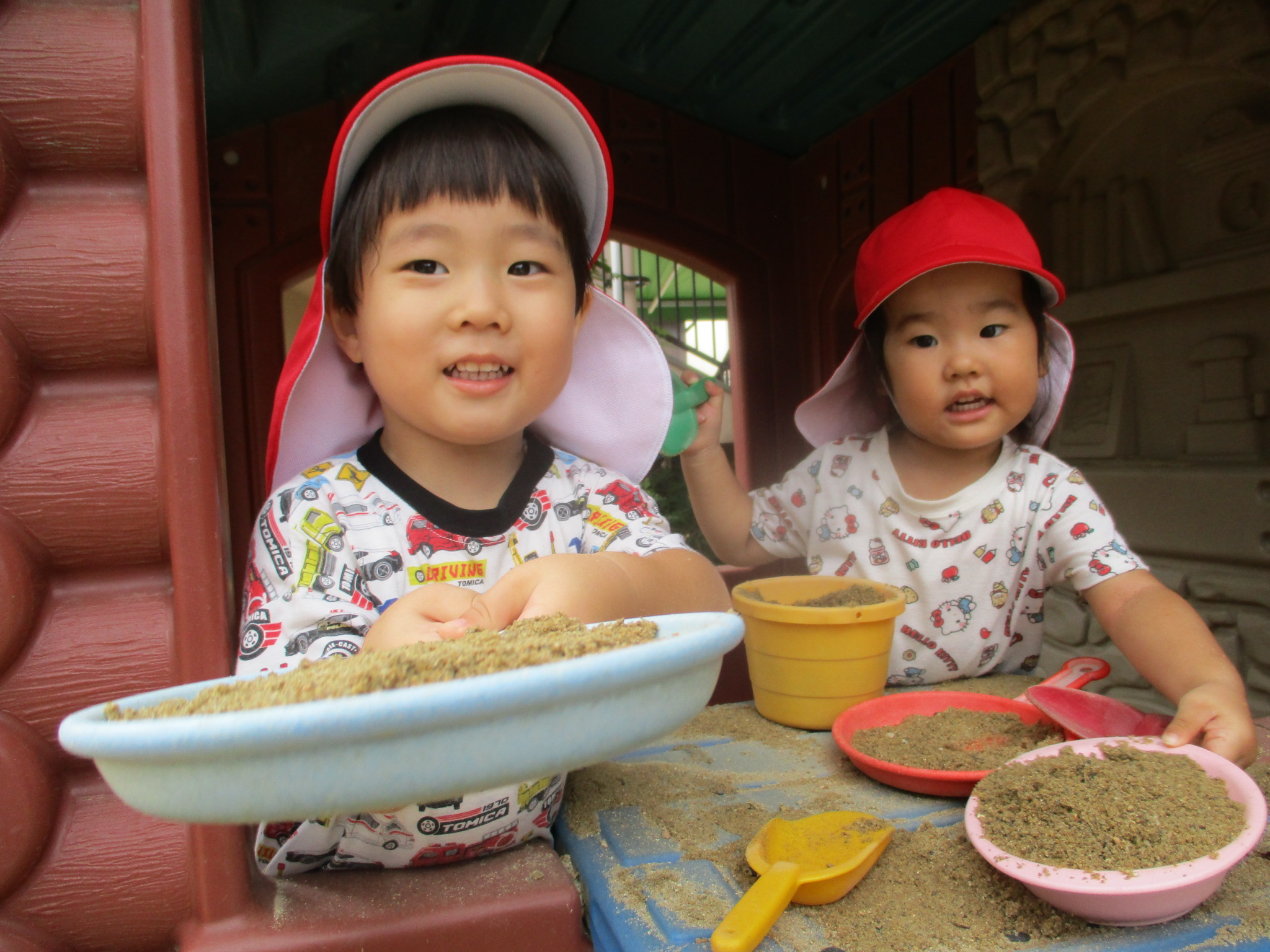 プール遊びが終わり、久しぶりの外遊びが嬉しかったようで元気いっぱいに遊んでいる子どもたち!園庭をかけ回ったりお友達と一緒におままごとやお店屋さんごっこを楽しんだりしています。「いらっしゃいませ~」「何にしますか?」と小さな定員さんになりきっていますよ。