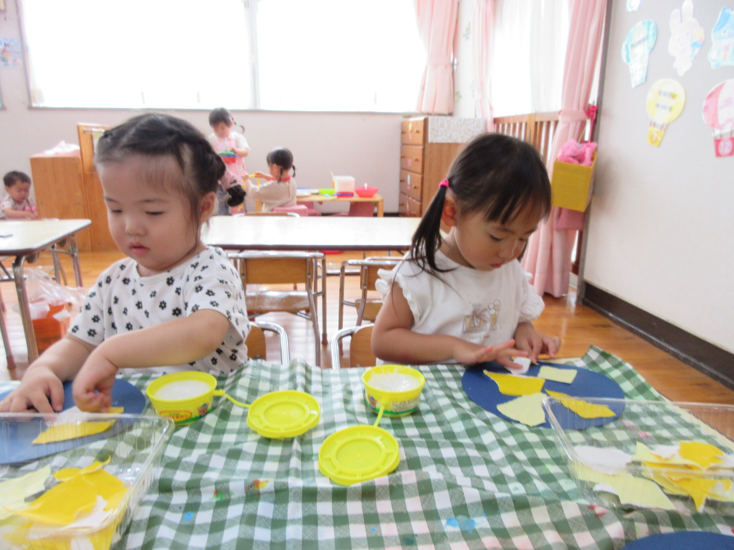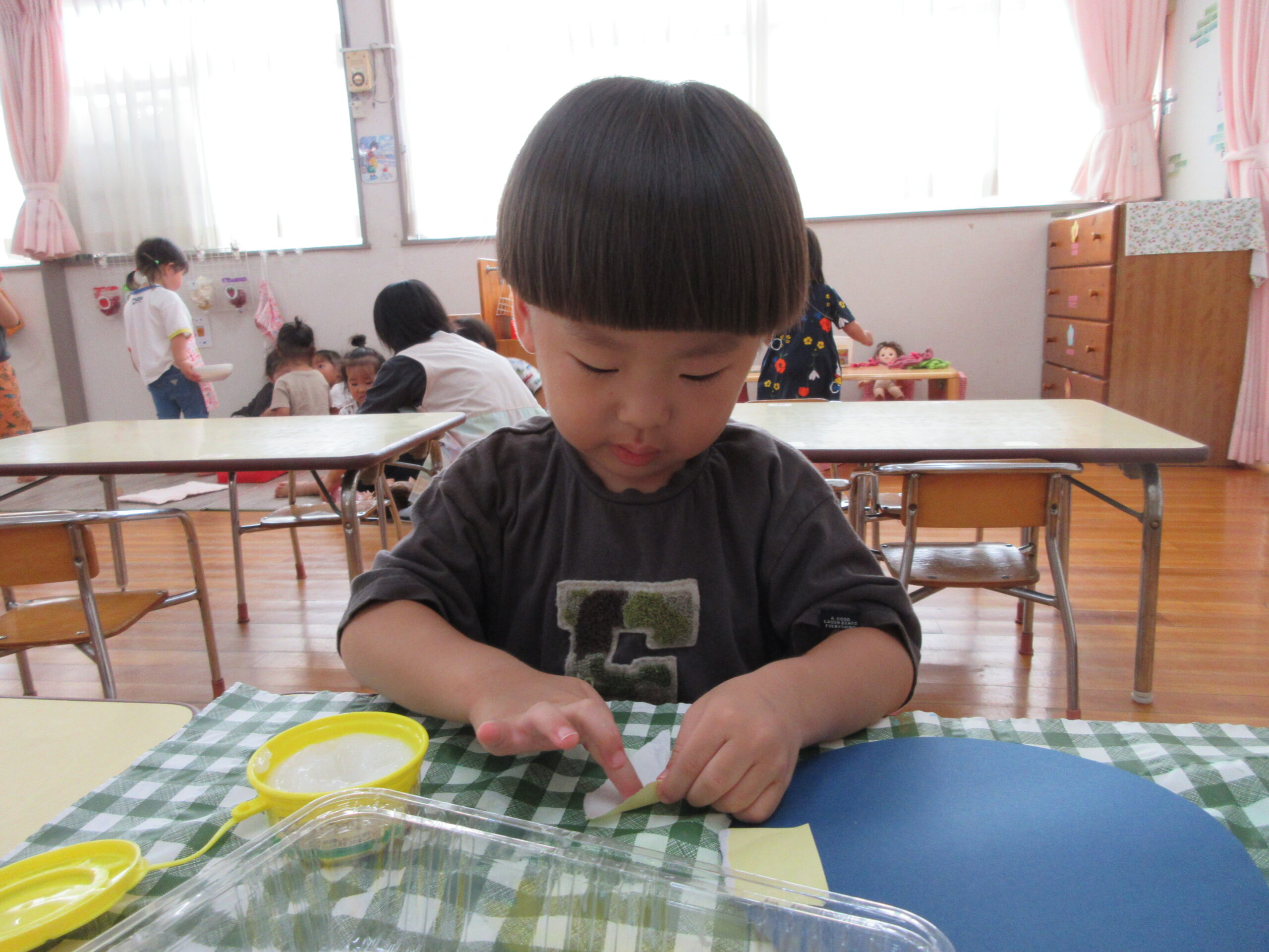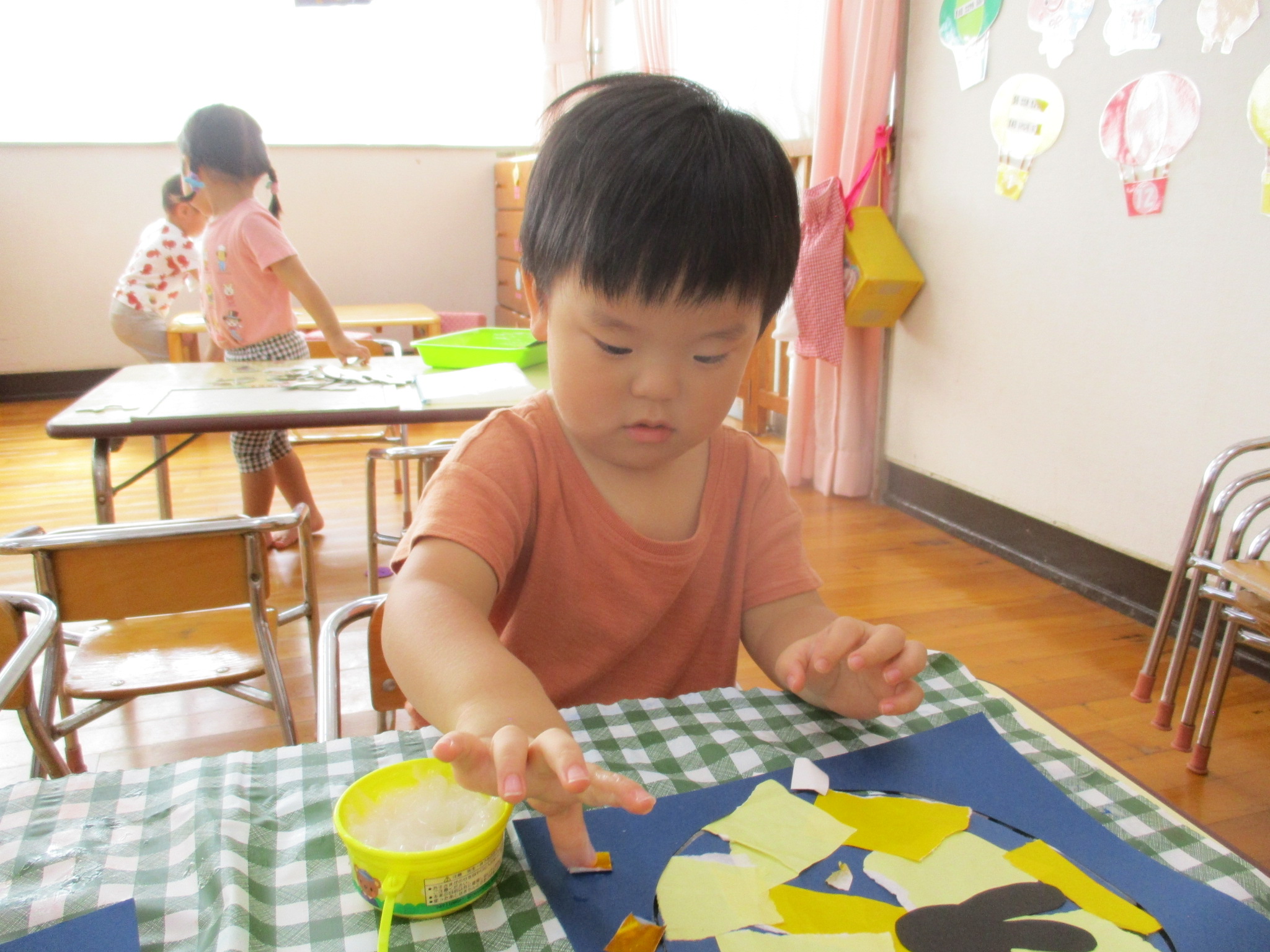 9月はお月見の製作をしました。折り紙をちぎったりクレパスでお月見団子を描いたりと、集中して取り組む姿が見られました。