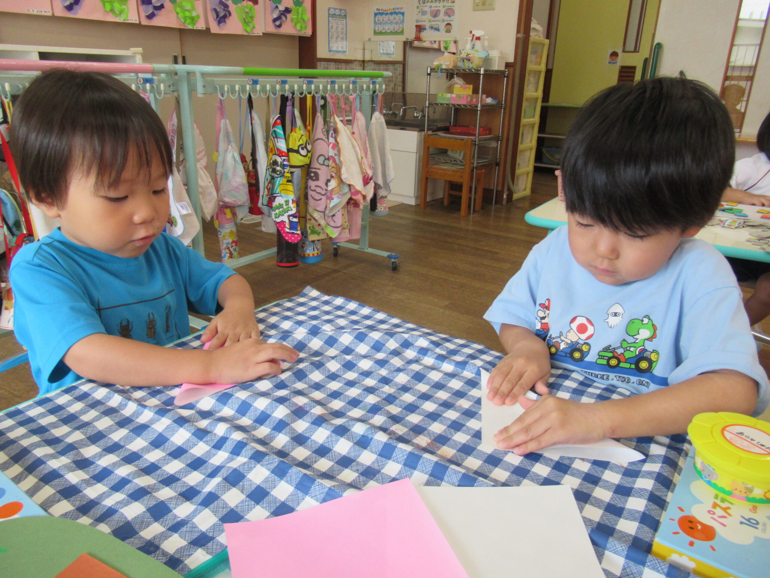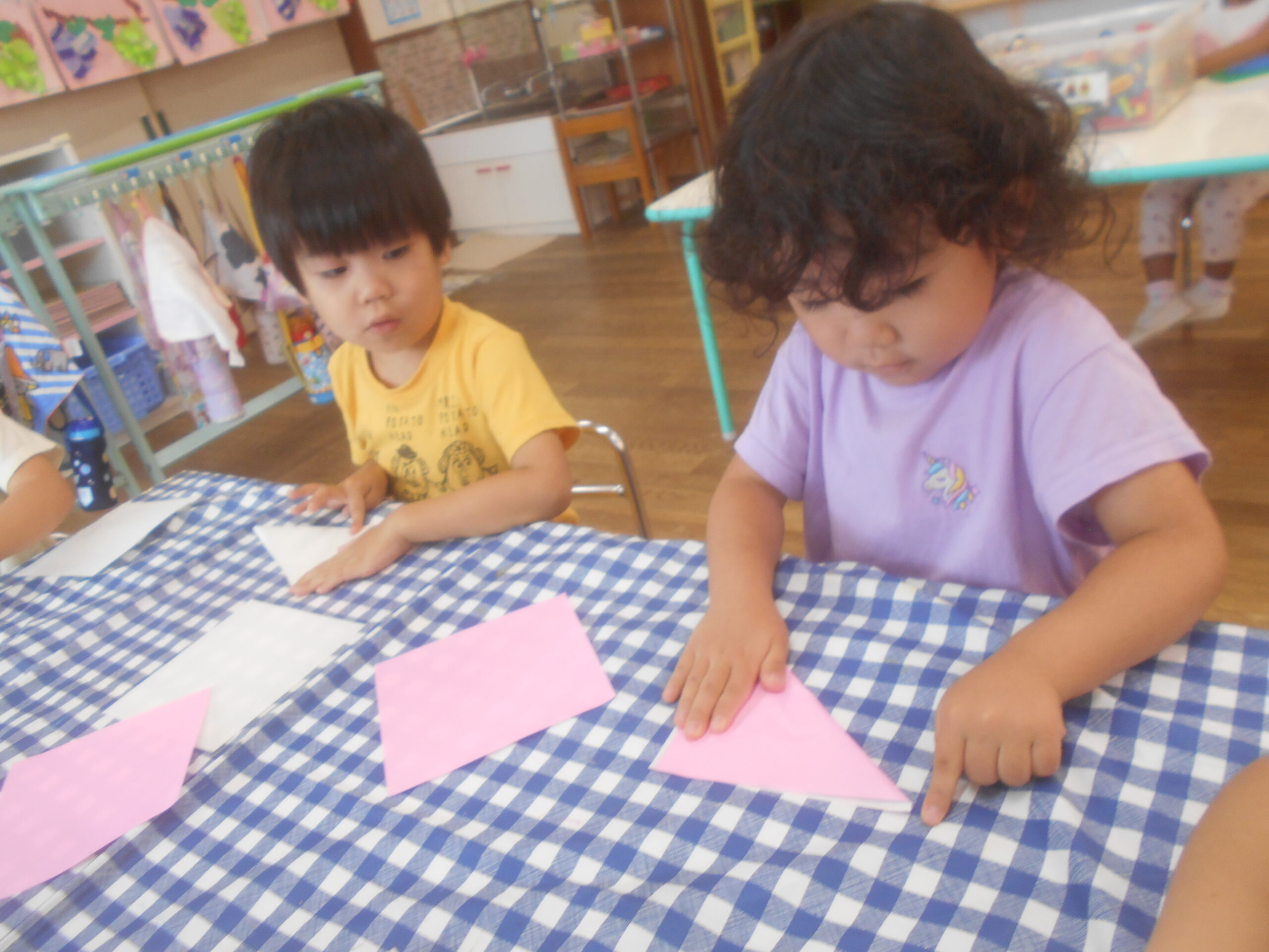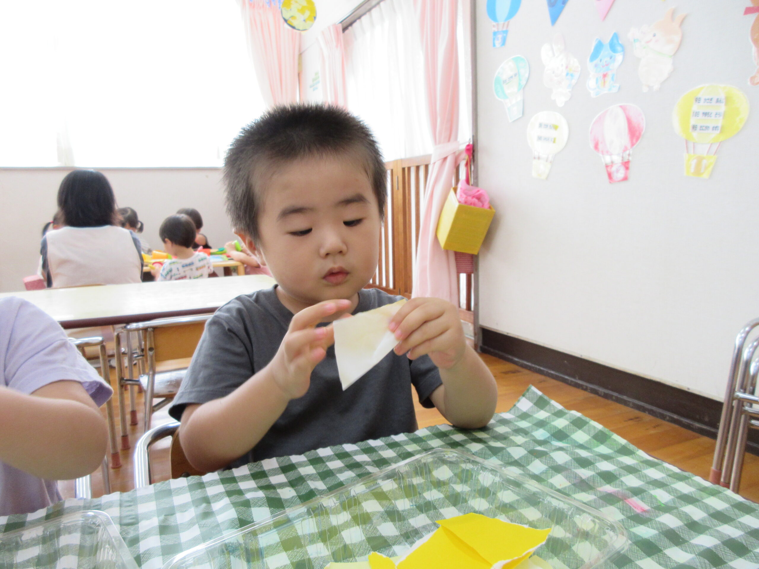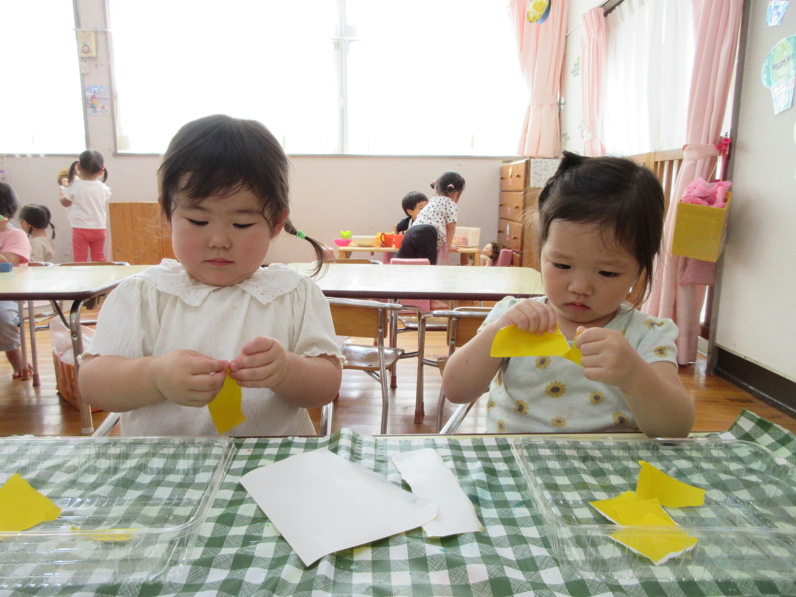 9月はお月見の製作をしました。折り紙をちぎったりクレパスでお月見団子を描いたりと、集中して取り組む姿が見られました。