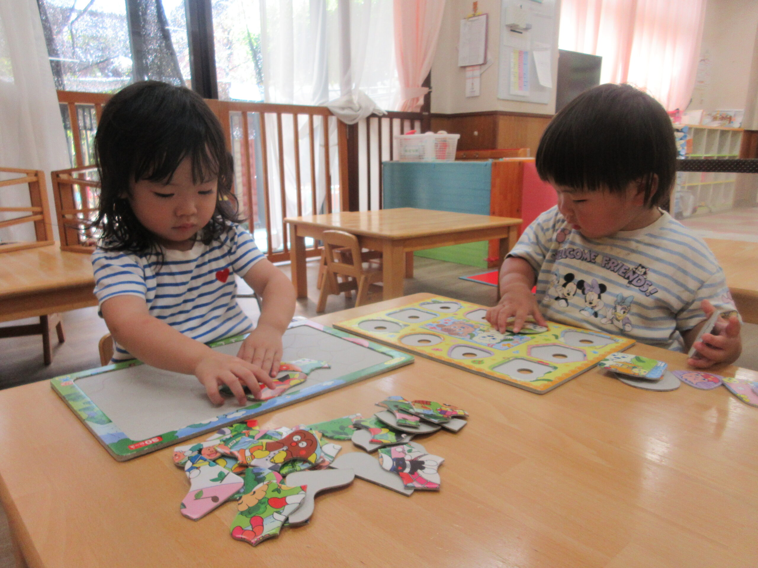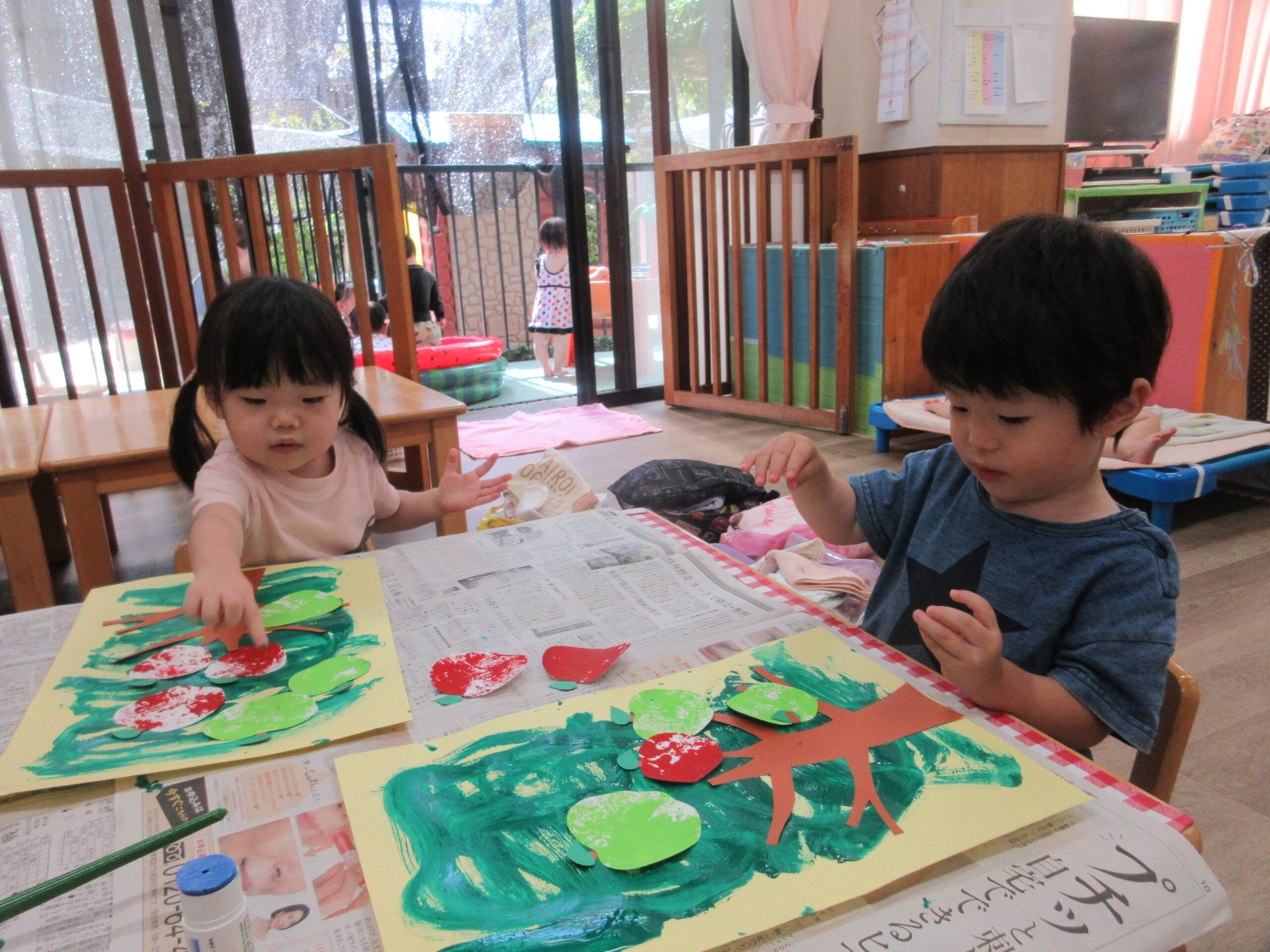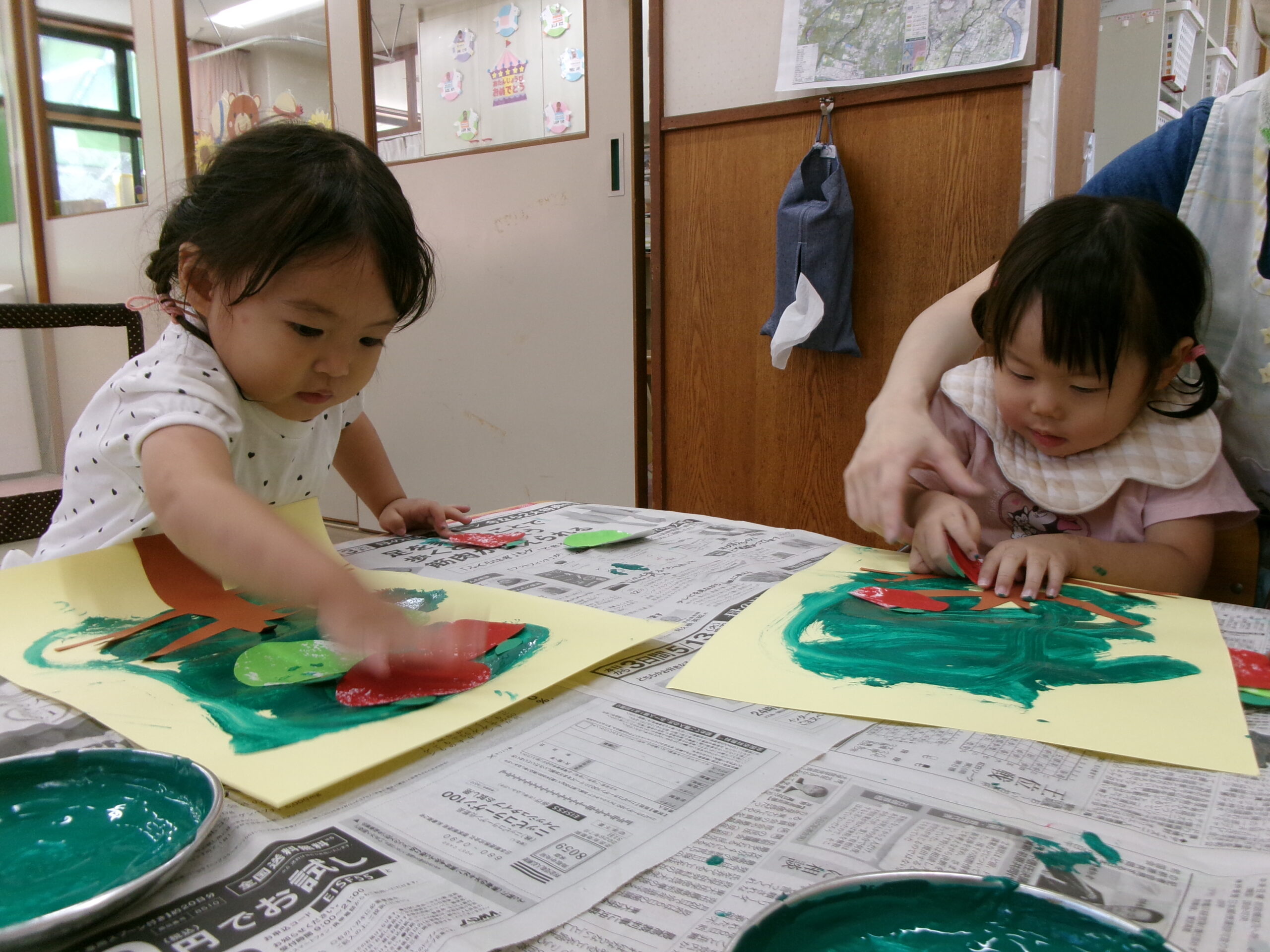 1歳児さんは、リンゴの製作をしました。画用紙いっぱいに木を描いたり、スタンピングをしたリンゴを貼ったりしました。お部屋では、パズルなどを楽しみ、手先を器用に使いながら遊んでいます。