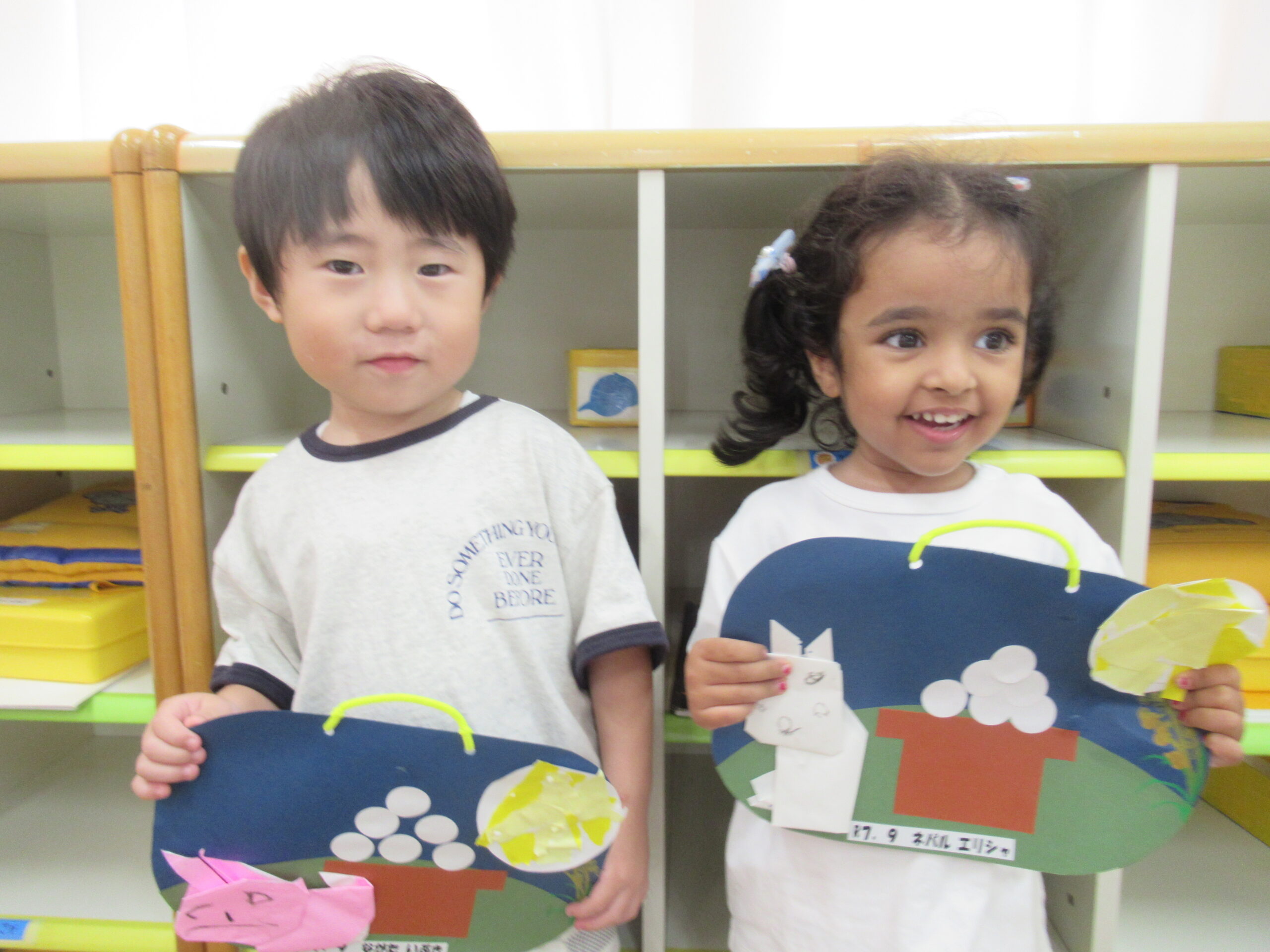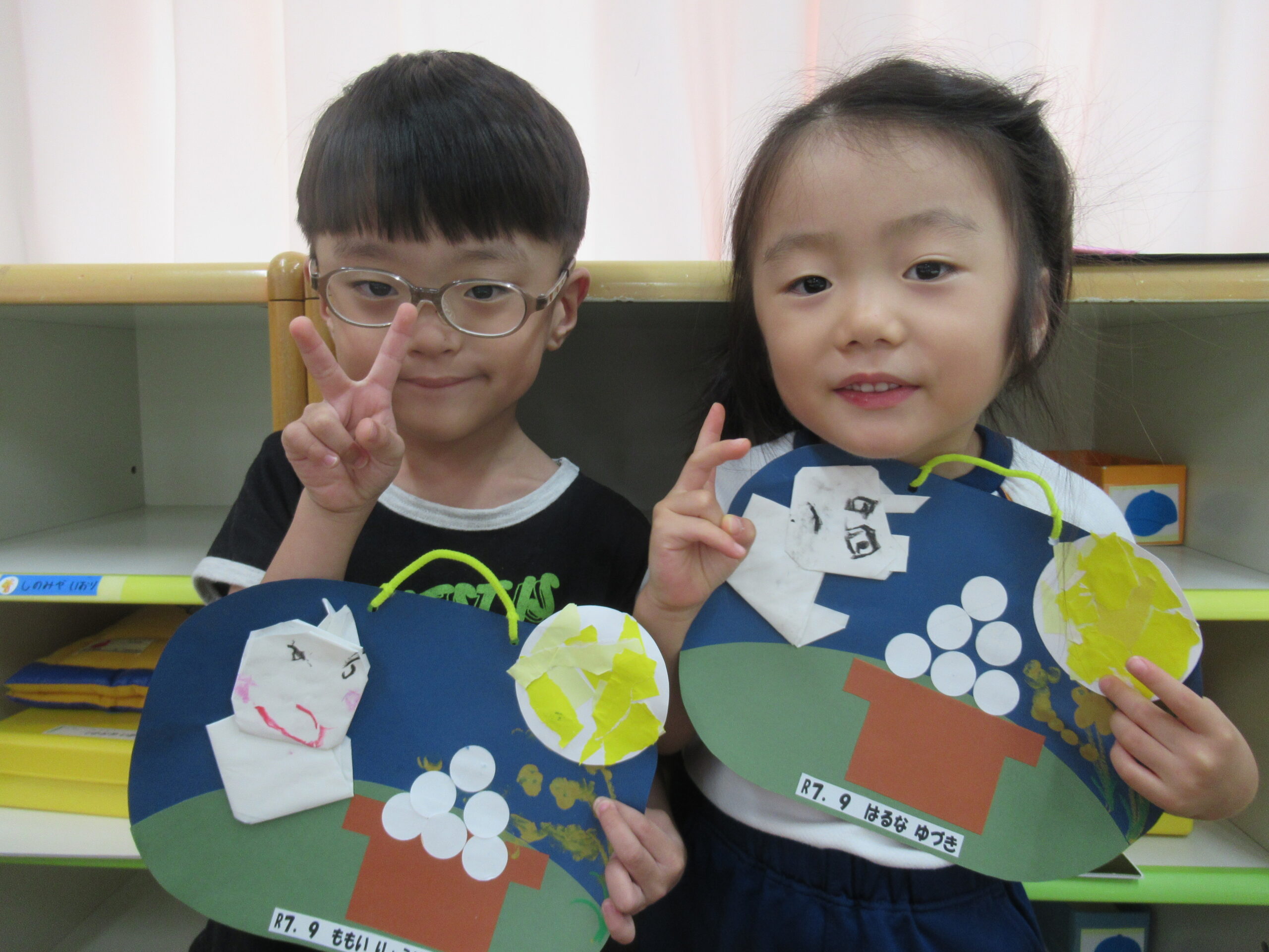 お月見の製作をしました。指スタンプでススキを表現したり、折り紙でウサギを作ったり工程は少し多かったですが、子どもたちは積極的に取り組むことができていました。可愛い作品が完成しましたよ。
